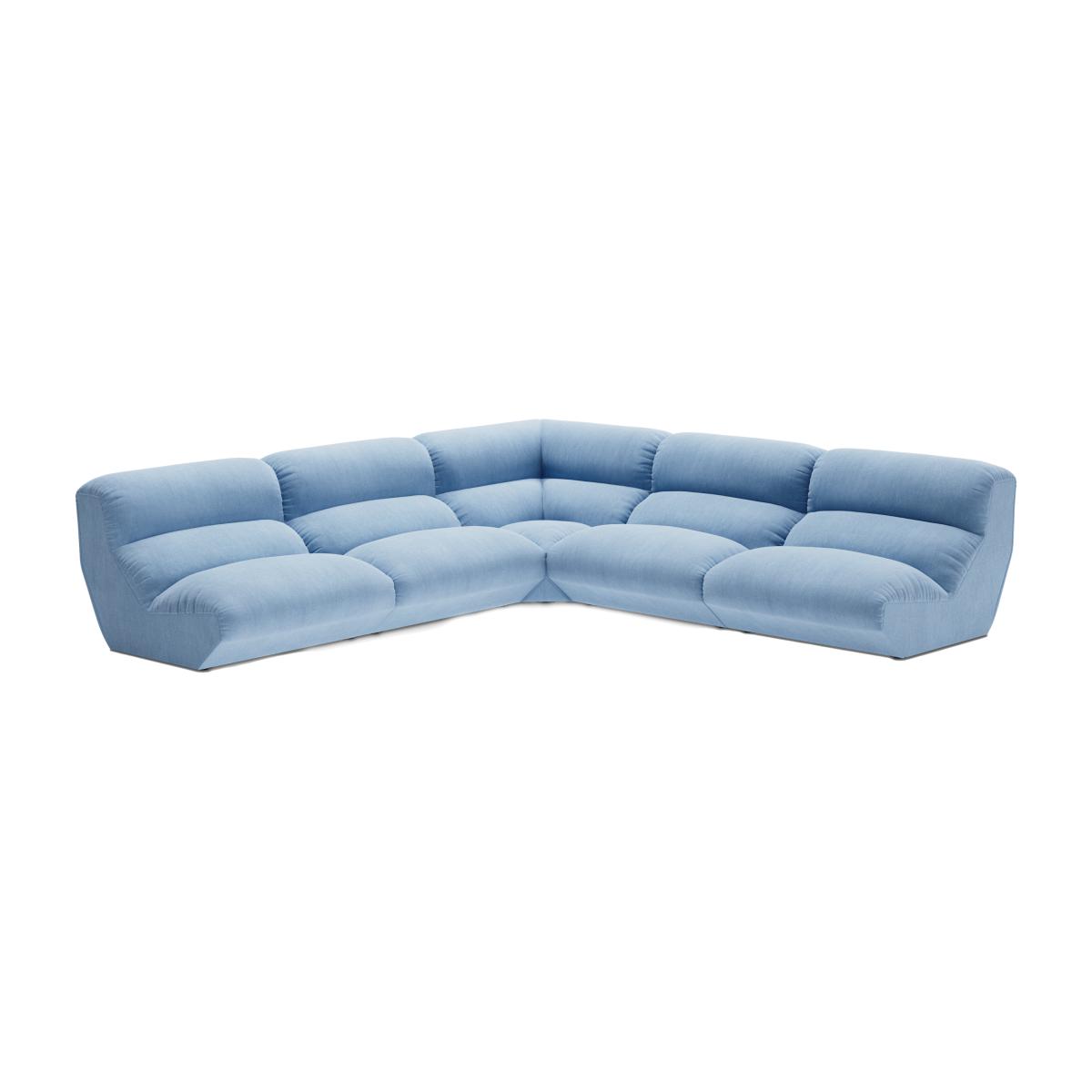 Hi Lo modular sofa configuration G Gentle 0733 from &Tradition is a flexible corner sofa with five modules that combines generous comfort with a sleek, timeless expression. Upholstered in the soft blue fabric Gentle 0733, the sofa gains a harmonious tone that brings both elegance and calm to the room. The enveloping shapes and generous proportions create an inviting spot for relaxation and social moments. The modular construction makes the sofa easy to adapt to needs, and in this five-module configuration a spacious corner solution is formed with plenty of room for family and friends. Thanks to the carefully selected materials and timeless design, Hi Lo is a sofa that remains as beautiful as it is functional for many years to come.