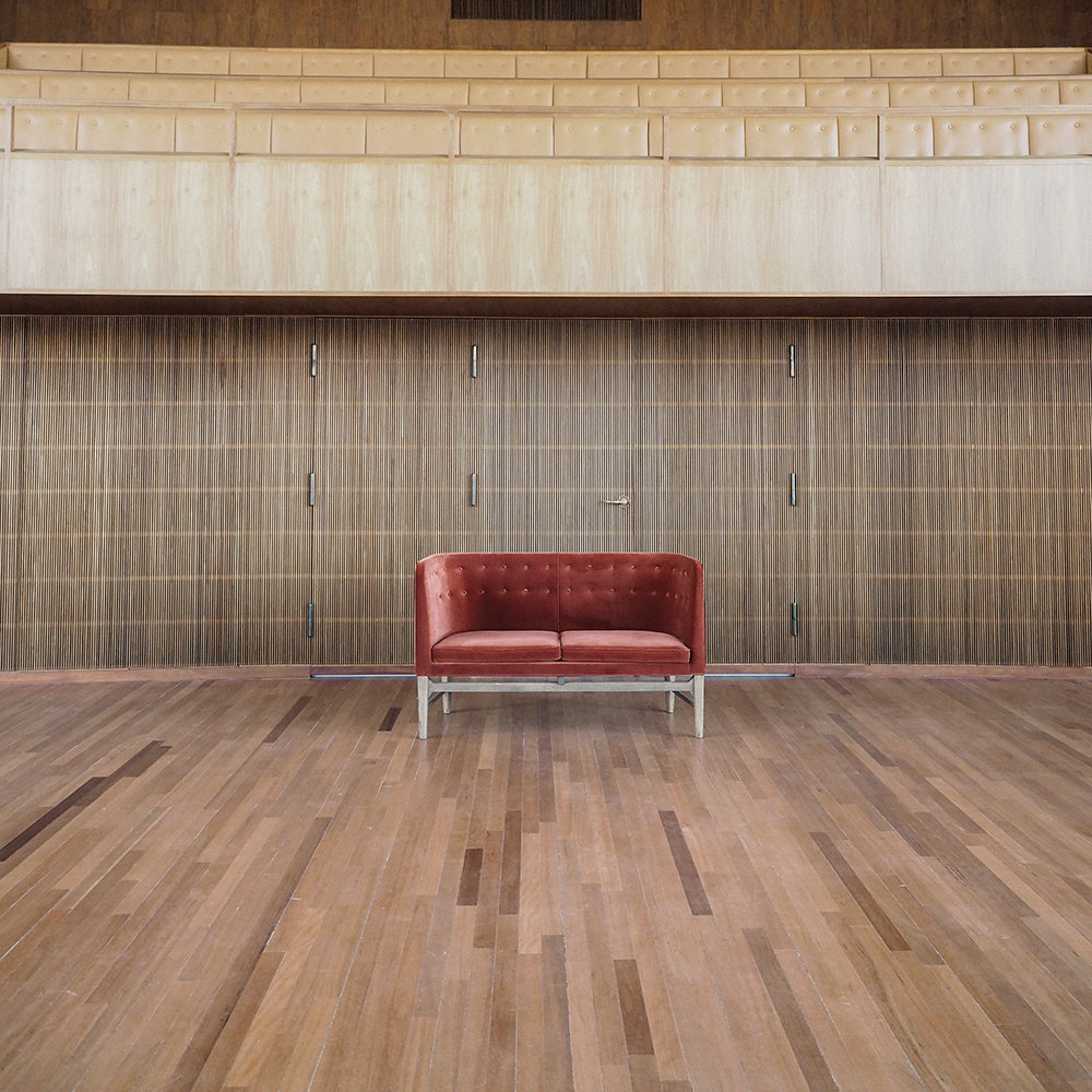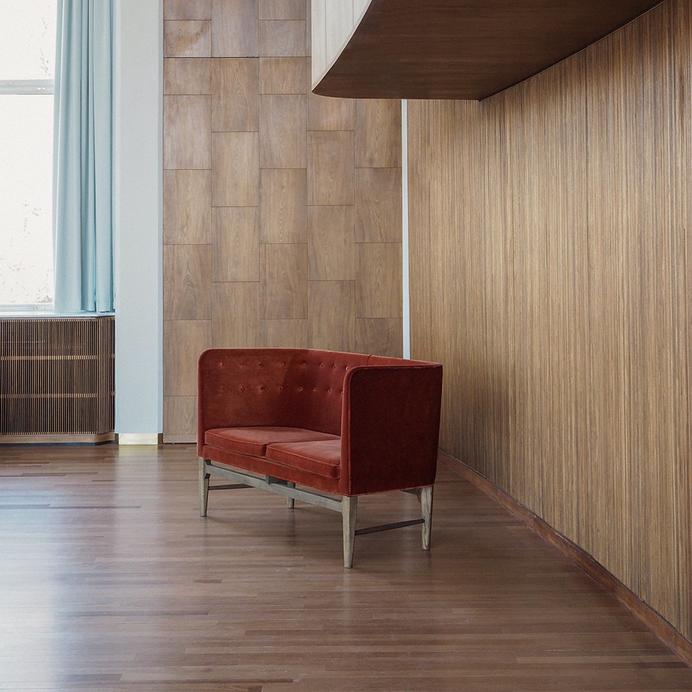 This Mayor sofa was originally designed in 1939 by Arne Jacobsen and Flemming Lassen after they had won an open competition to design a new town hall, library and theatre in Søllerød, Denmark. For the town hall they designed a wedding room with accompanying furniture, and the Mayor sofa was designed especially for the waiting area, for couples to sit in before getting married. With a high vertical back and sides, this sofa is unique in style and history. Hand built by skilled craftsmen, the solid walnut frame is a true statement of handcraft and traditional woodworks. Choose from three upholstery colour options, maroon, clay or ruskin.