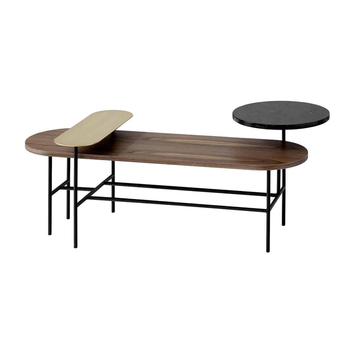 Create a style statement in your living space with the Palette rectangular lounge table from & Tradition. Designed by Jaime Hayon, and inspired by Alexander Calder's kinetic sculptures, it combines a series of multi-tiered tables of varying shapes, sizes, colours and materials. The base is made from welded and powder coated steel tubes, and the table top is made from laser cut stain polished brass, polished marble and a choice of stained ash or walnut veneer. Key features: * Lounge table * Material: brass, Nero Marqina marble, lacquered walnut * Frame material: powder coated steel * Dimensions: D115.2xW67.8xH47cm * Weight: 19kg * Fitted with plastic gliders * Designed by Jaime Hayon