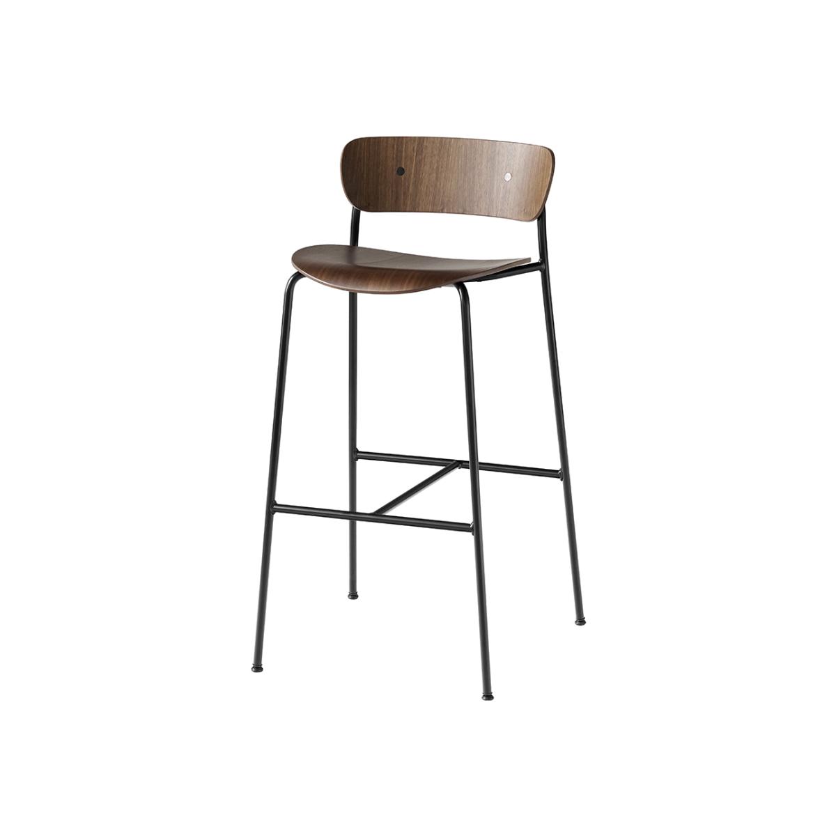 Take a seat in style and comfort thanks to the Pavilion bar stool designed by Anderssen & Voll. With curvaceous lines in the oak veneer seat and back rest, the steel tube frame contrasts in perfect style. Laid back, it's the perfect accompaniment to a kitchen counter or bar. Key features: * Bar stool * Material: formpressed walnut veneer * Dimensions: H95xD50xW52cm * Frame: steel tubes * Weight: 5kg * Seat height: 75cm * Lacquered finish * Powder coated steel legs finished in black * Designed by Anderssen & Voll