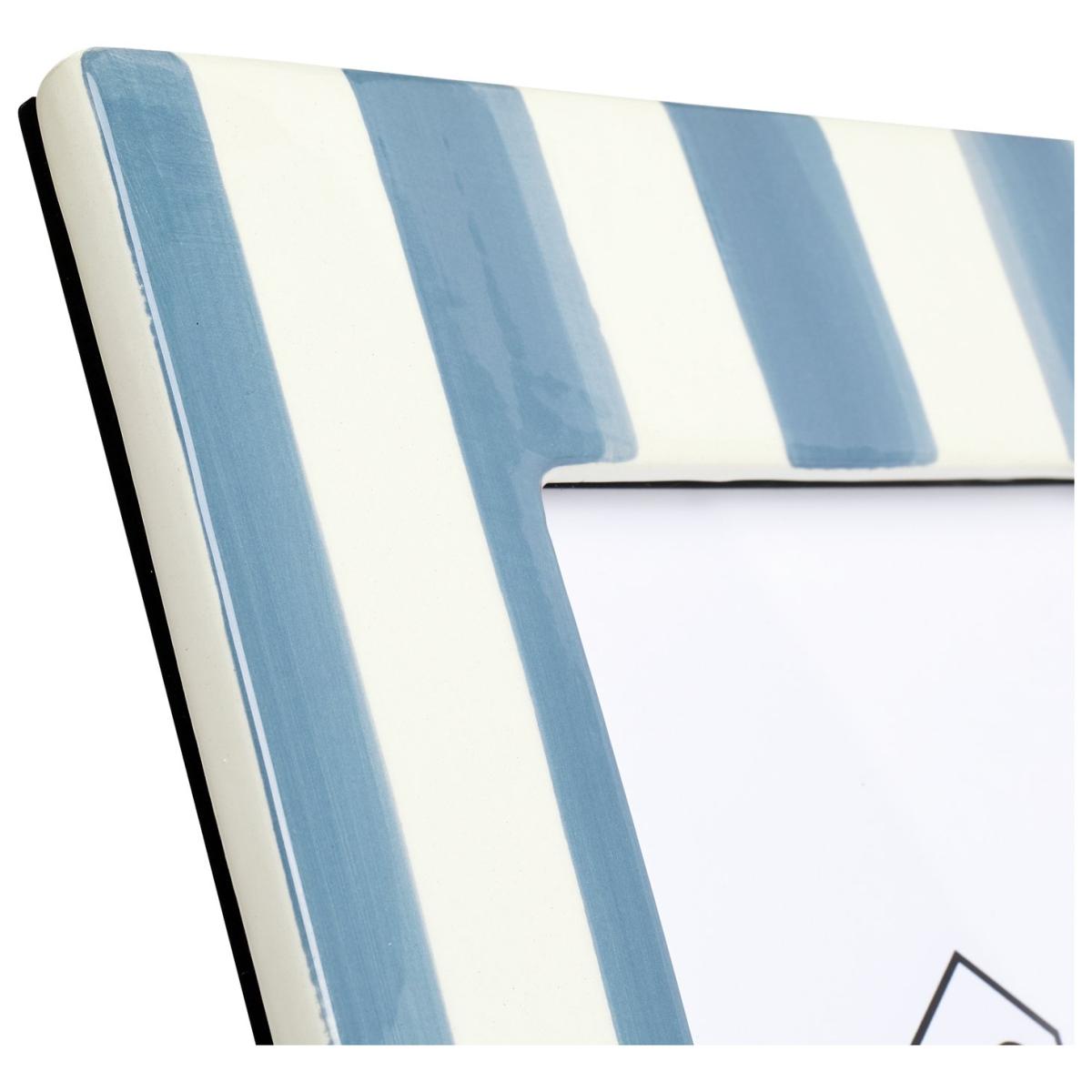 Frame the moment. This glazed ceramic photo frame is finished in bold blue and white stripes with an arty, brushstroke look. A fresh way to display your favourite snaps. Pop them on a shelf or sideboard and let your memories shine. For photo size: 12.70x17.78cm/5x7 inches. Size H26.3, W21.8, D1.3cm. Free standing. Earthenware frame.