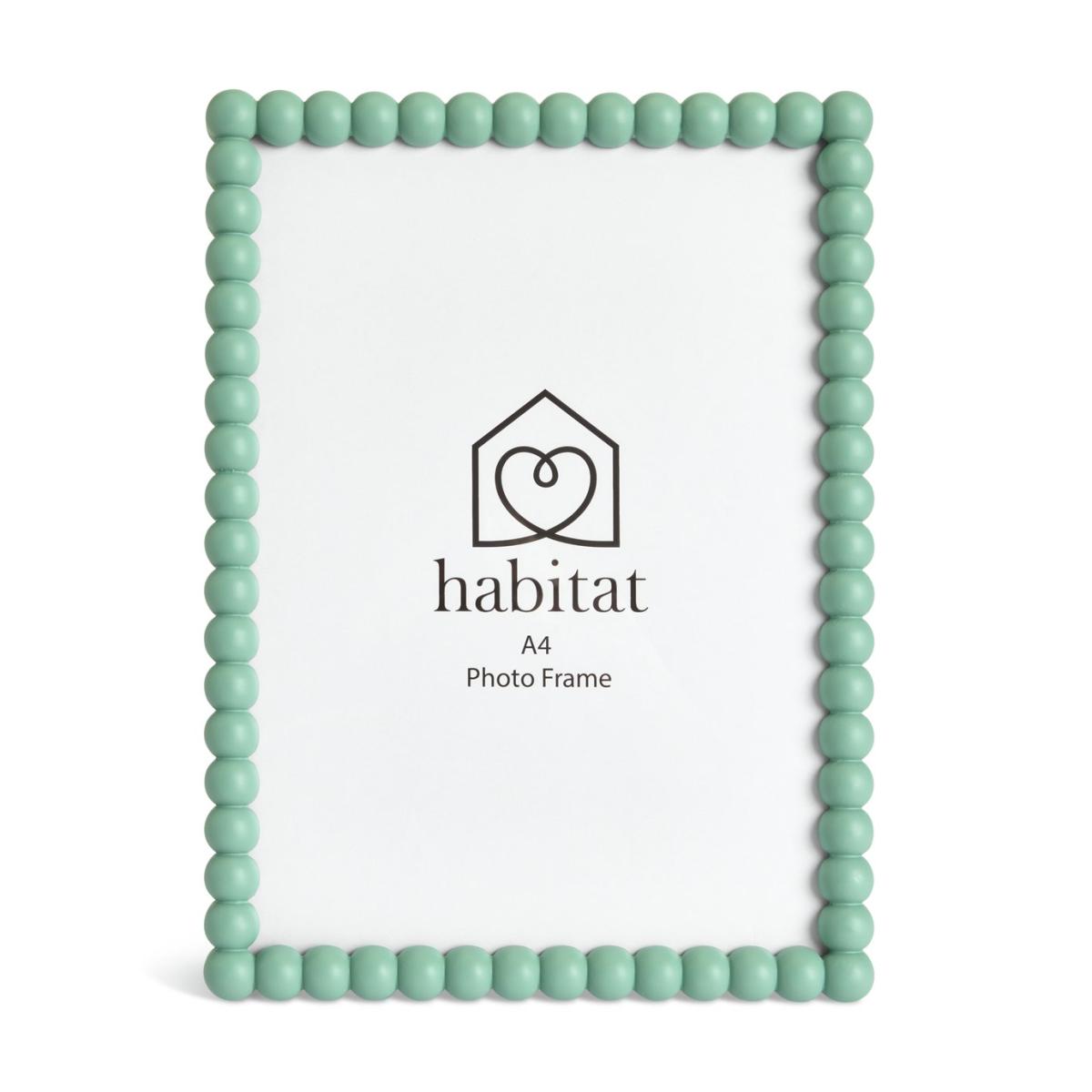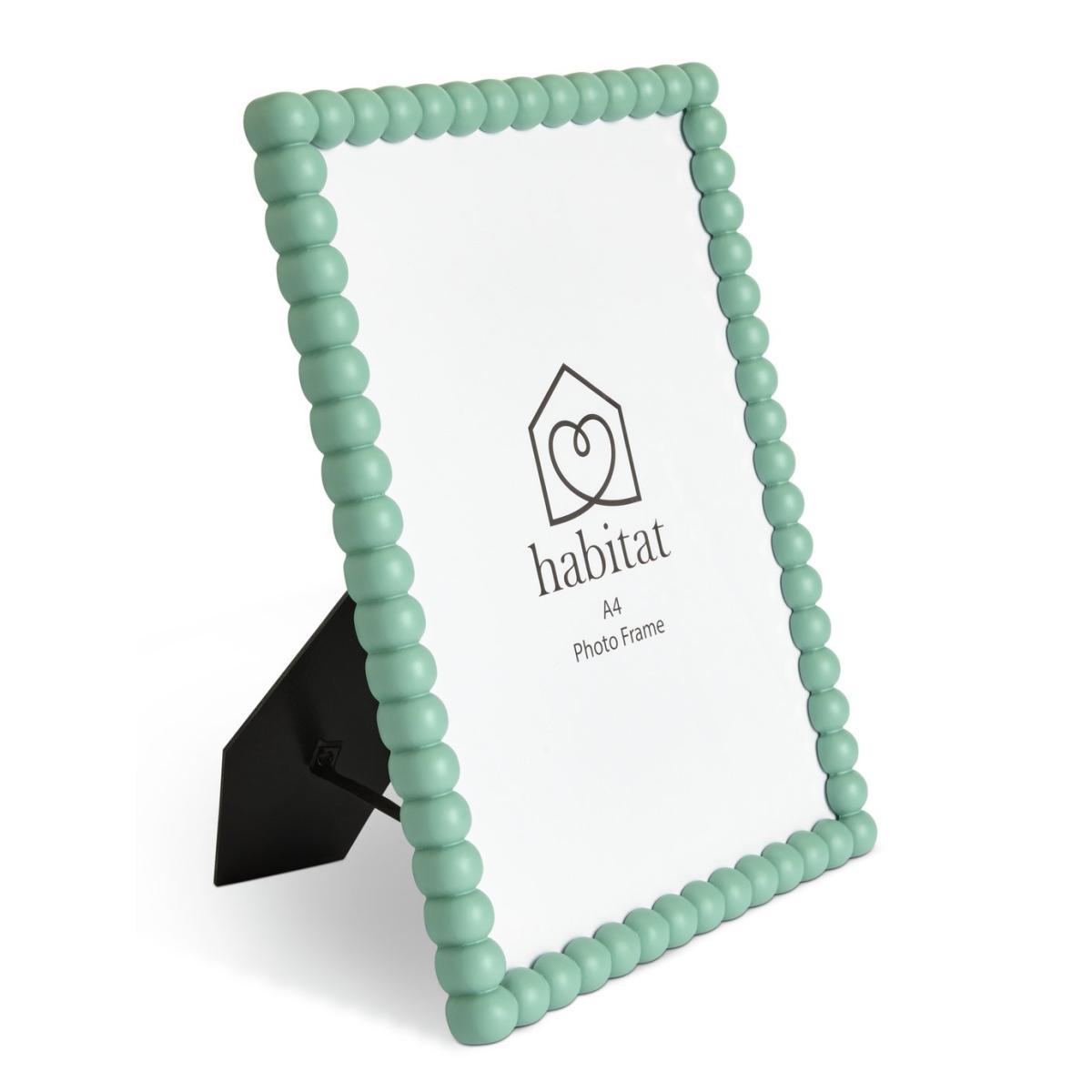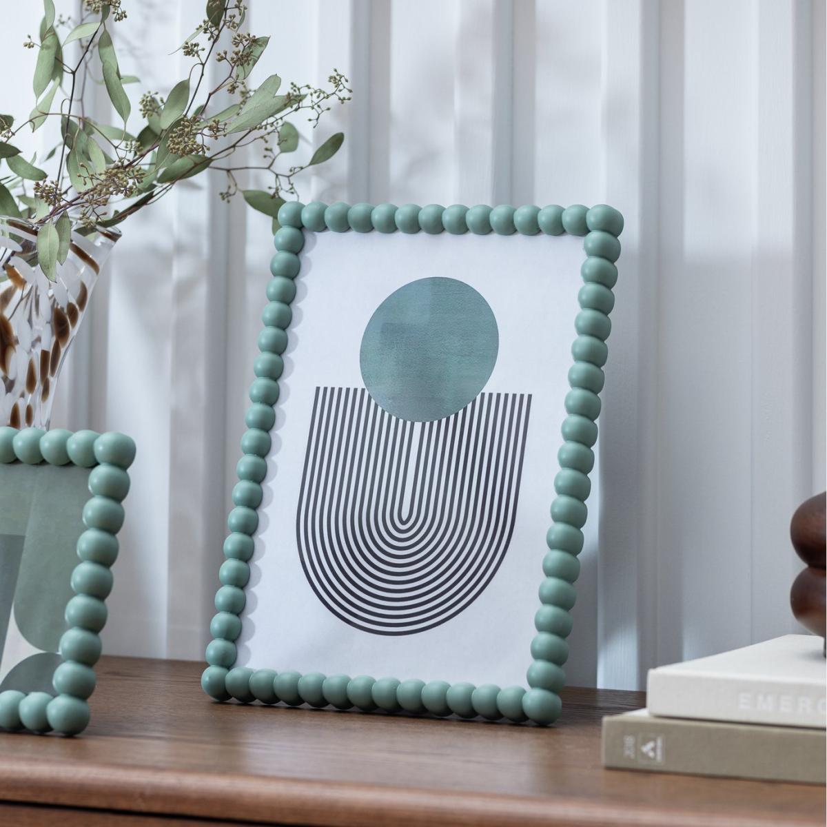 Bring home a touch of whimsy with our pastel green bobble frame. Where modern meets arts and crafts style. Perfect to make a fave photo or artwork stand out. For photo size: 21x29.7cm. Size H32.3, W23.5, D2cm. Size of frame 1: H32.3, W23.5, D2cm. All frames in pack are the same size. Free standing. Wall mounted. Product can be free standing and wall mounted. MDF frame. Set of 1 frames.