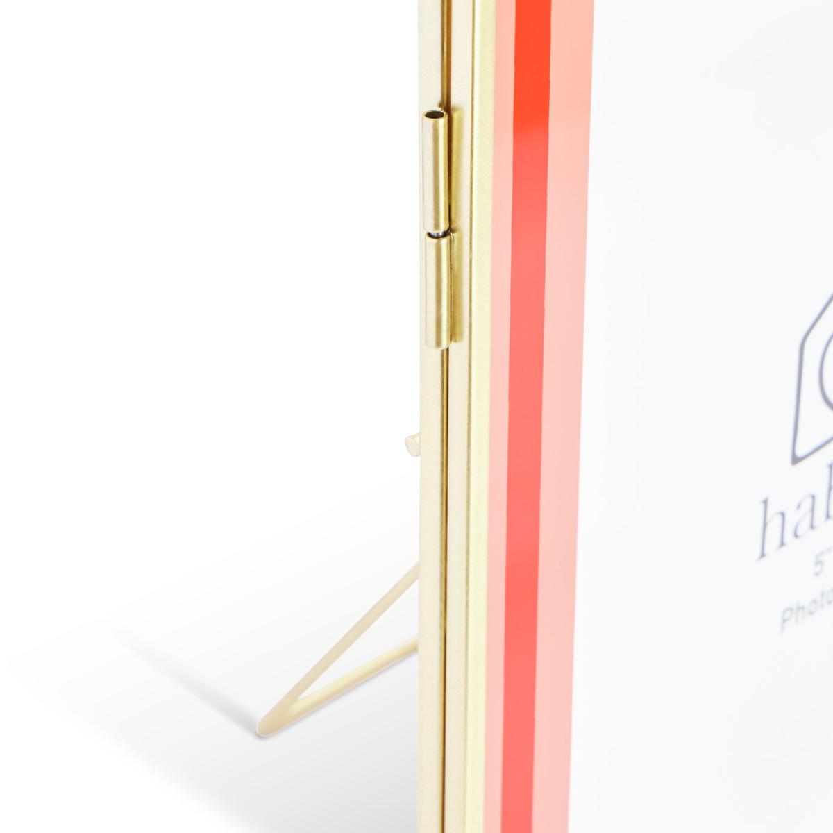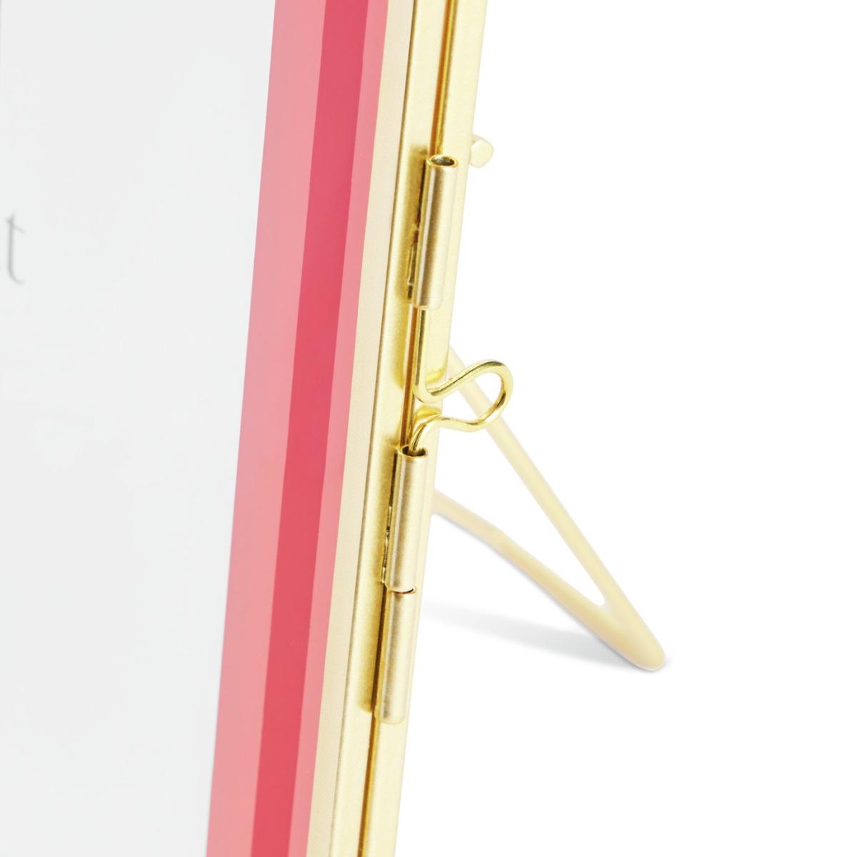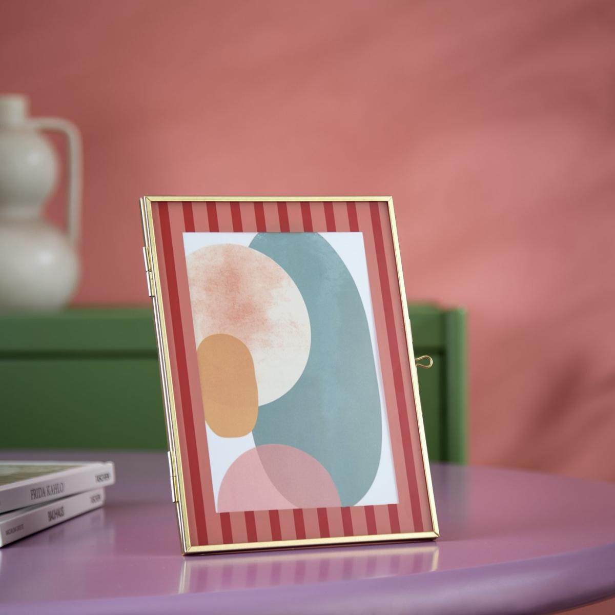 A pop of pattern. This metal frame pairs red and pink bands with a slim gold border for a vivid and striking look. The clever side hinge opens like a book, just slot your photo in and snap it shut. Freestanding, it's great for showing off your favourite art piece. For photo size: 12.7x17.7cm/ 5x7 inches. Size H21.7, W1.9, D17.1cm. Free standing. Metal frame. Set of 1 frames.