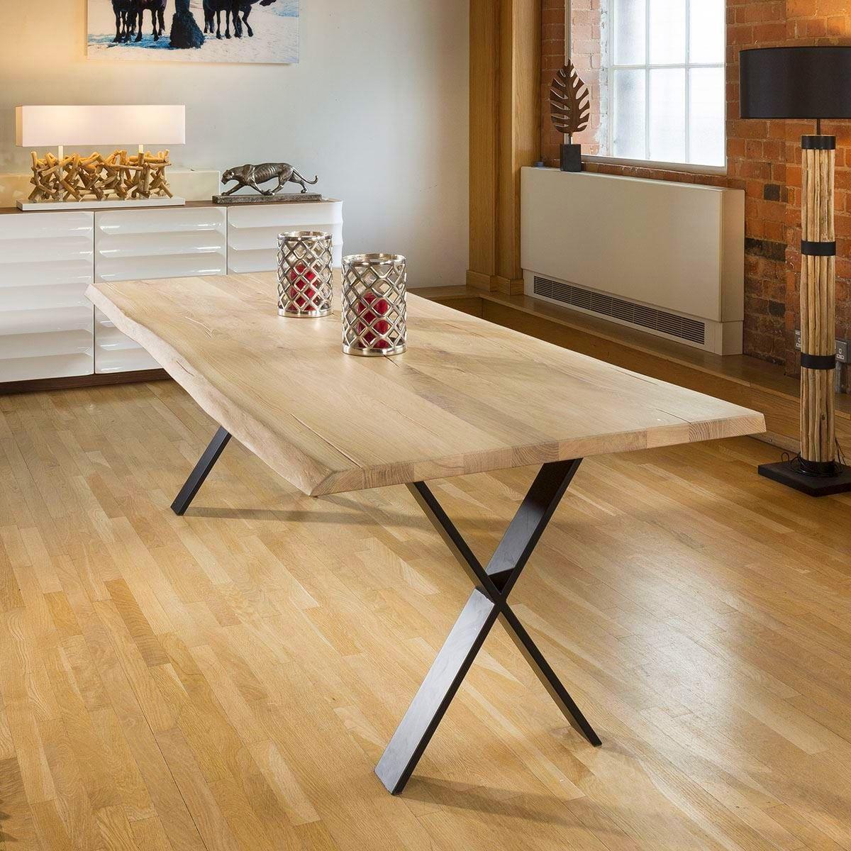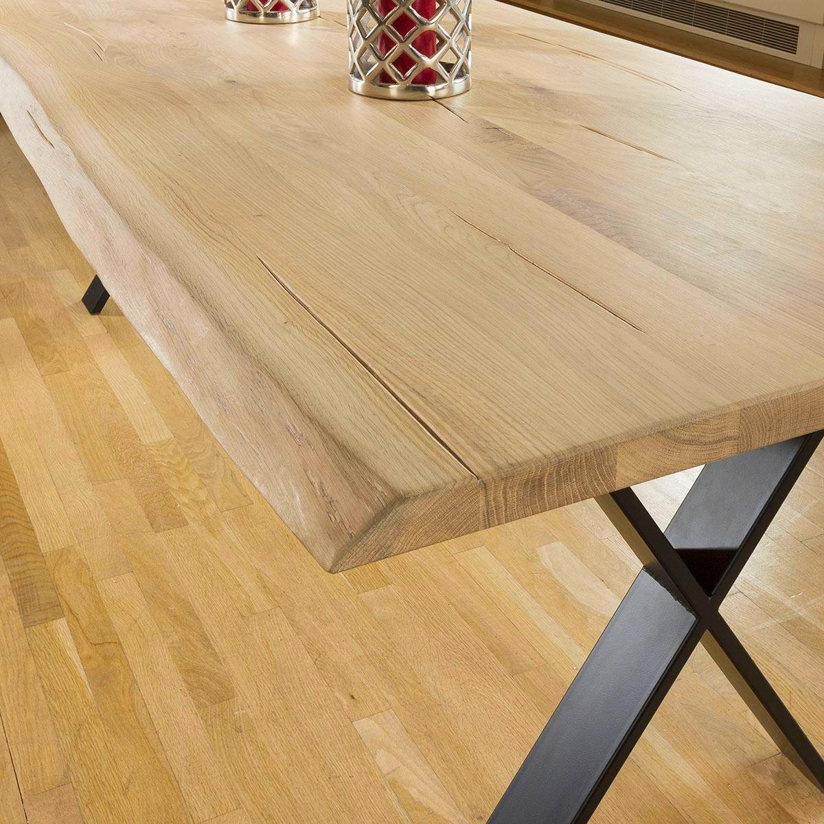 Super High Quality Large Rectangular Natural Oiled Dining Table Crafted from Solid Oak with Black Steel X Legs, Lovely quality from this top Danish manufacturer. X Shaped Steel Legs (Black Painted Finish), solid oak top - super durable and really stunning to view. Solid 30mm thick top with grooves, angled edges in a Natural Oak finish.