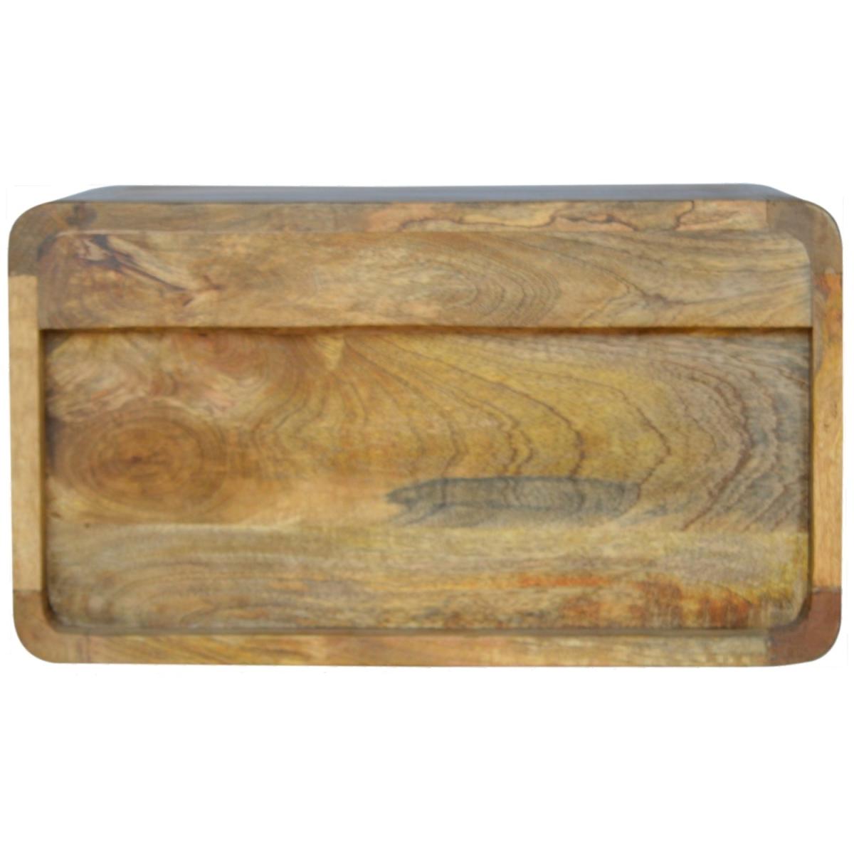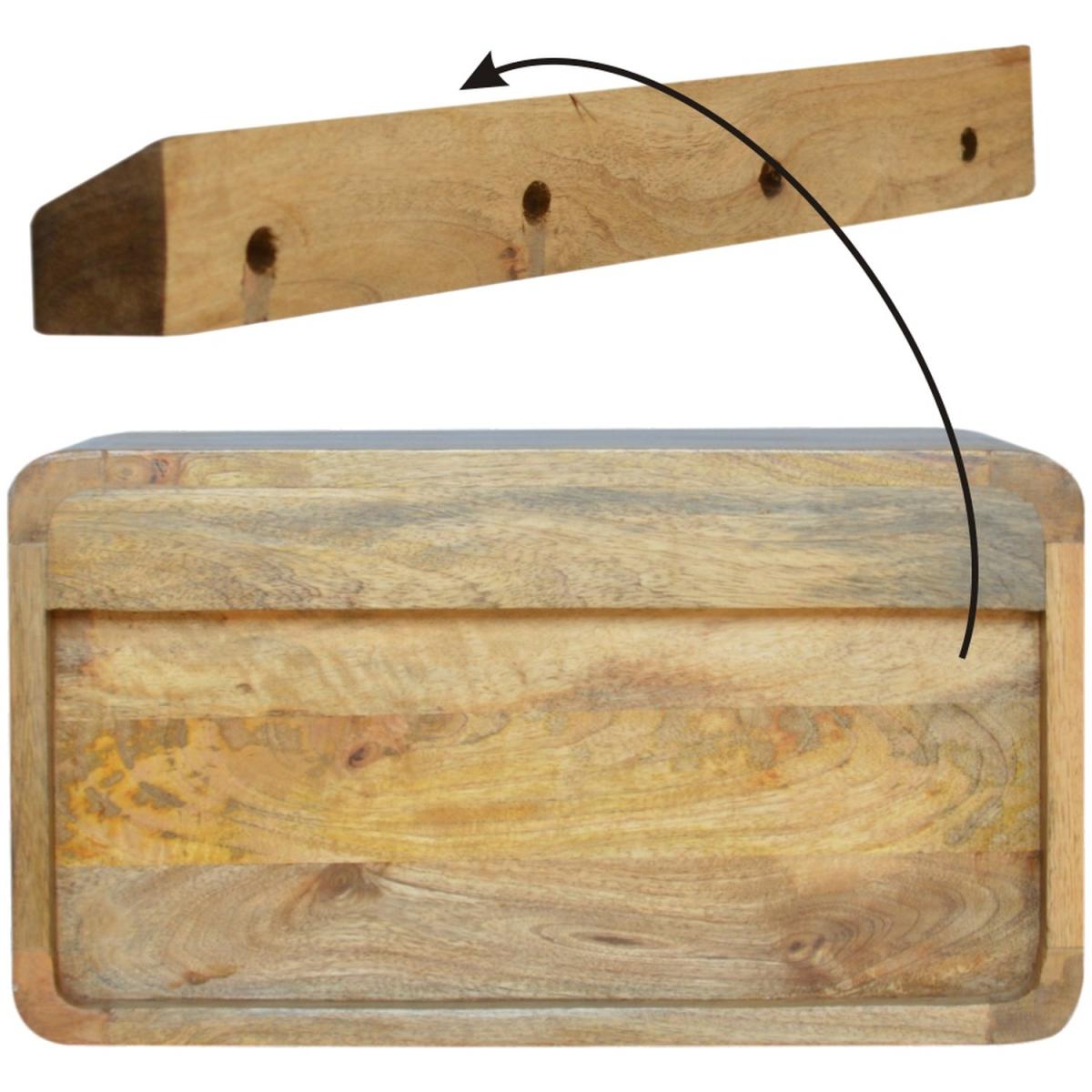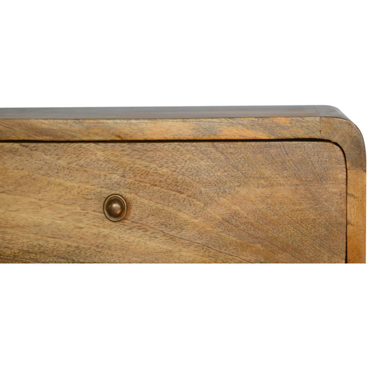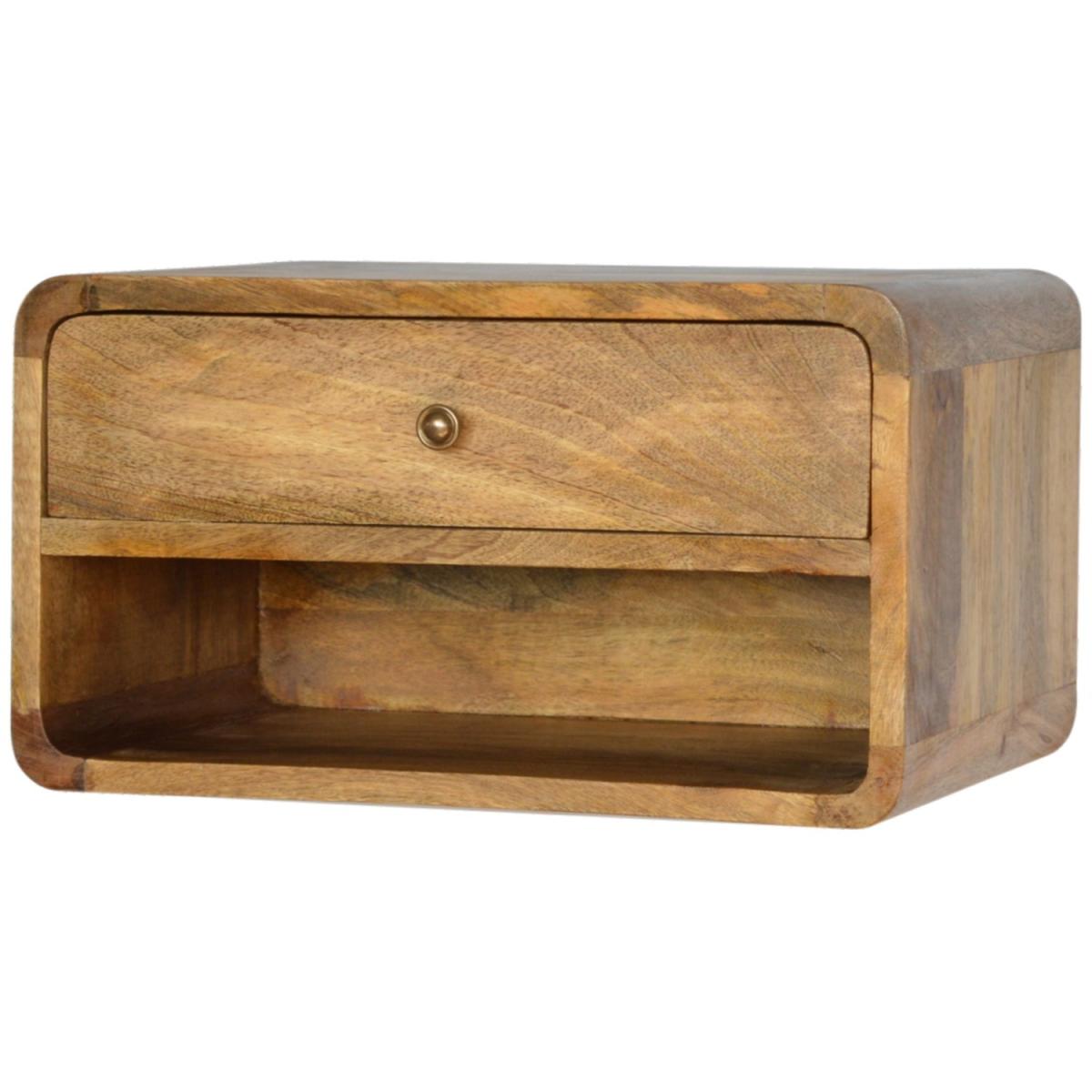 Inspired by our curved range, this minimalistic wall mounted unit has been constructed from 100 solid mango wood in an oak-ish finish and features 2 drawers which feature shiny knobs. This piece is perfect for storing any bits and pieces you wish to keep close by before bedtime. It's neat and clean design can easily be mounted on the wall without the fuss of any legs. Caution! Do not sit on the unit.
