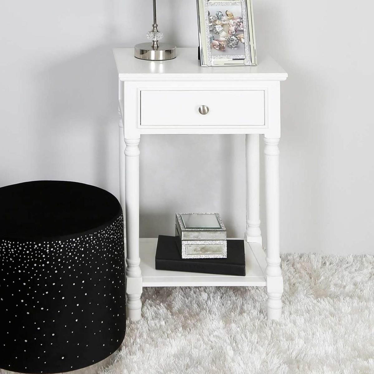 The Vanity Living 1-Drawer Telephone End Table is a compact yet stylish solution for small spaces. Featuring a sleek design and one convenient drawer, it provides storage for essentials while keeping your area tidy. The table's versatile design makes it perfect for use as a telephone stand, bedside table, or a compact end table in any room. Its timeless aesthetic effortlessly blends with both modern and classic interiors, adding functionality and charm to your home. Add a touch of elegance to your space with the Vanity Living White 1-Drawer Telephone End Table. This compact and functional table features a sleek white finish that complements both modern and classic interiors. The single drawer provides convenient storage for essentials, while the tabletop is perfect for placing a telephone, lamp, or decor. Whether used in the living room, bedroom, or hallway, this versatile piece is a stylish and practical addition to any home.