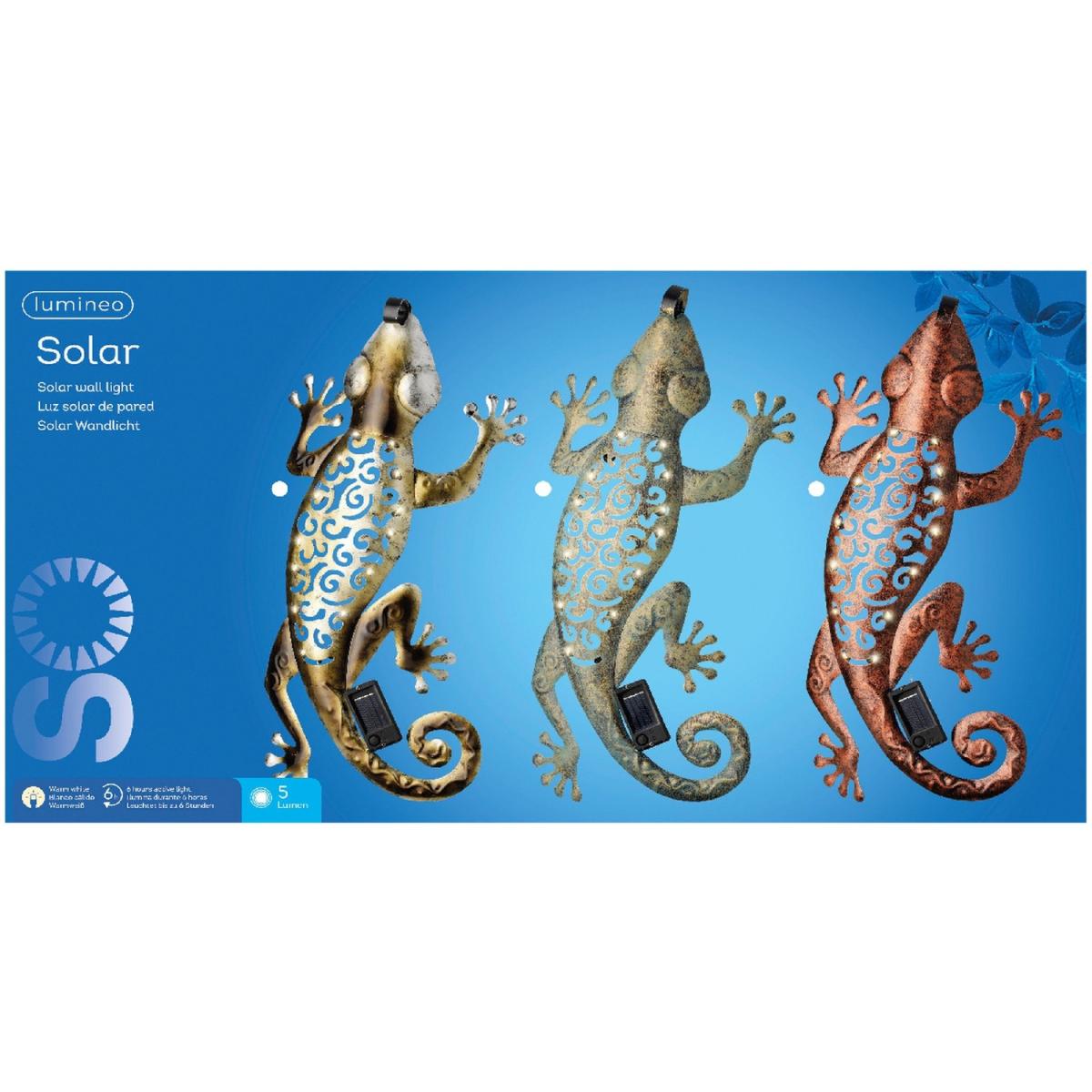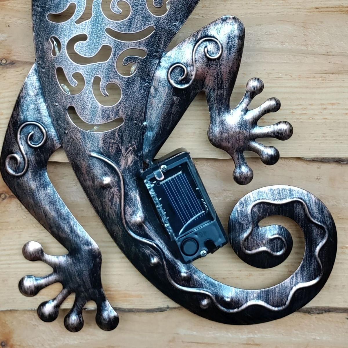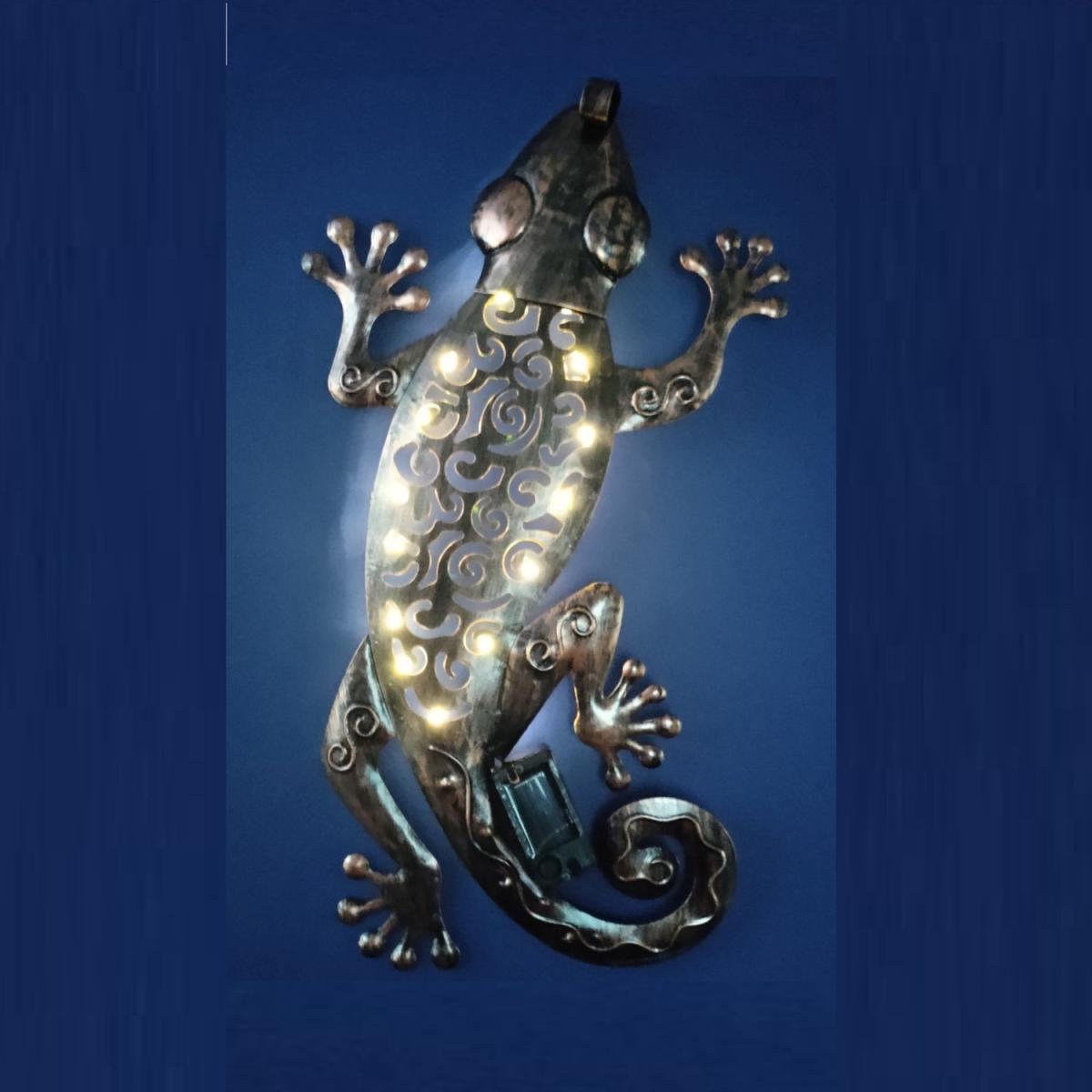 1 x Rustic Gecko wall art solar light decoration. (Supplied at random)Add a little character to your outdoor space with this quirky rustic effect Gecko wall art decoration. With its metal rustic appearance and its illuminating feature will create a charming atmosphere for all your family and friends to enjoy. This solar powered wall art decoration features 14 LED bulbs which automatically light up, giving off a warm white glow when dusk arrives. Once charged the wall art panel will illuminate for up to 6 hours at a time. Creating a warm and welcoming feel to your garden or patio area. The gecko measures 51cm in height, 24cm in width and has a depth of 4cm approximately. With an integrated hook on the inside leg, this beautiful wall art decoration is ideal for hanging on the side of your house, a fence or the garden wall, with its rustic look complimenting any garden scheme. Colour of Gecko will be supplied at random. To avoid disappointment please avoid adding a note to seller requesting colour as this will not be seen.