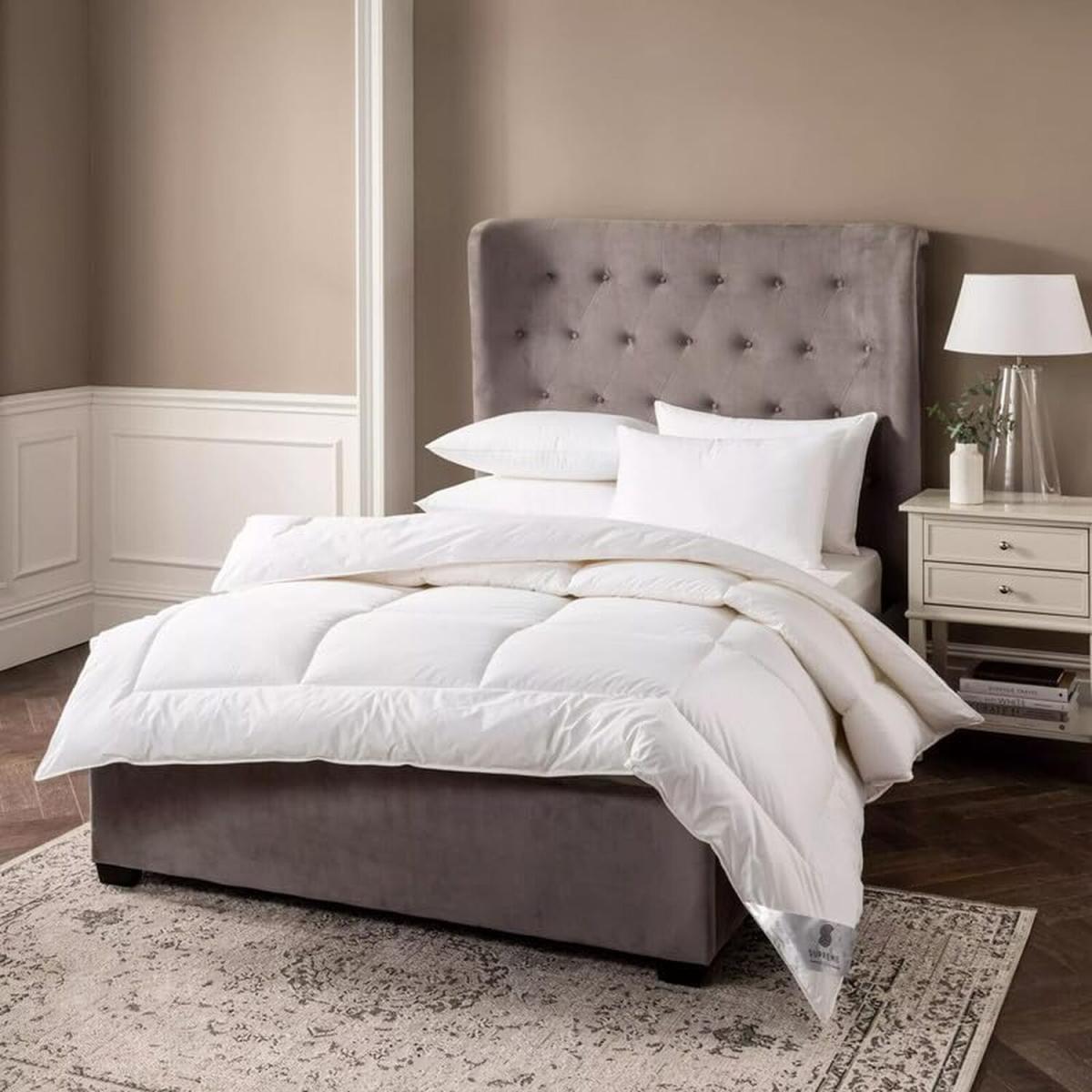 Revel in the exceptional comfort of Supreme Bedding's Premium T220 Cotton Box-Stitched Duvet. This luxurious bedding essential demonstrates an ideal amalgamation of design and practicality, meticulously constructed for those who seek unparalleled comfort without sacrificing style. The duvet's superior exterior showcases a T220 cotton fabric, celebrated for its breathability, durability, and softness. It envelops your body in an exquisite manner, setting the stage for a blissfully snug sleep environment. Inside this sumptuous duvet, we've incorporated a down-like hollowfibre filling. The outcome is a comforting warmth and softness that mirrors the lightness and insulating properties of down, while being perfect for those with sensitivities to natural down. Each fibre is thoughtfully structured to offer the optimal equilibrium of warmth and comfort, irrespective of the season. Our box-stitched design is not merely an aesthetic choice. It guarantees the hollowfibre filling remains uniformly dispersed, eradicating cold spots and establishing a consistently cosy and welcoming sleep surface. A distinguished border adds the final touch, introducing a subtle elegance to your bedroom decor. Experience the delight of a serene night's sleep, encased in the tender caress of the Supreme Bedding Luxury T220 Cotton Box-Stitched Duvet.