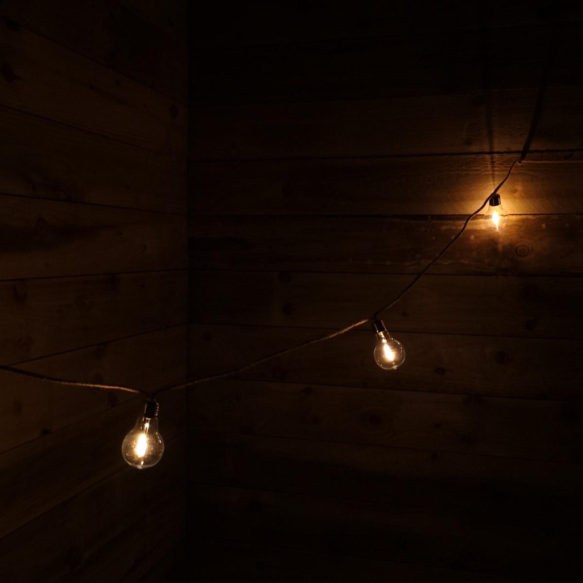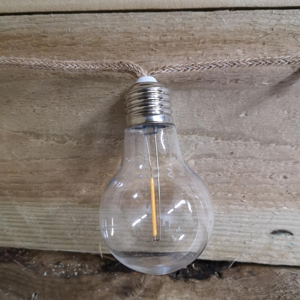 10 bulbs over 4.5m of lit length on jute rope, Mains operated with 5m of additional rope from the plug to the first bulb. Non-replaceable A60 bulbs which are suitable for both indoor and outdoor use. 50cm spacing between each bulb. All dimensions are approximate. A decorative way to light up an area