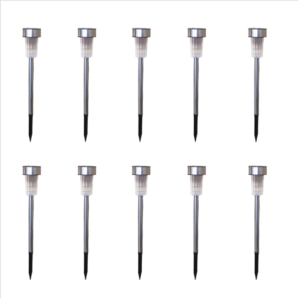 Brighten up your outdoor space this year with this pack of 10 garden path lights. Suitable for the garden, pathways, boarders and driveways. These lights are fitted with a built in rechargeable battery which is powered by the solar panels allowing the lights to be lit for up to 8 hours. The lights automatically switch on/off at dawn and dusk. Each light contains 1 White LED bulb and are easy to install. Just unscrew each solar panel cap and manually switch on the light and insert the ground spikes, no tools are required. Designed from long lasting materials these outdoor lights are made to be weatherproof and the design protects the solar light from bad weather.