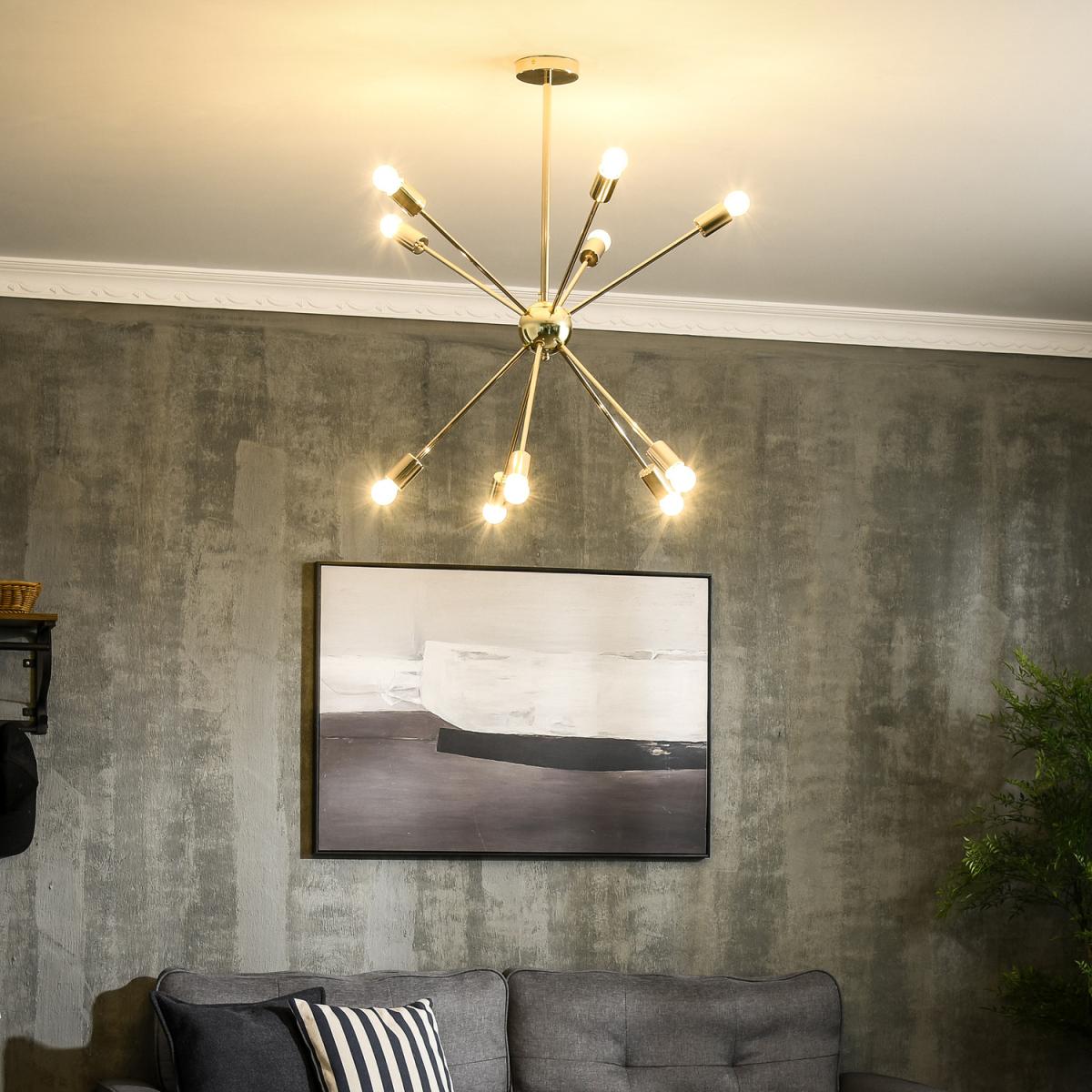 I love this starburst-style chandelier for its modern yet timeless appeal. Its gold-tone finish adds warmth and sophistication, making it a great focal point in both contemporary and eclectic interiors. It works especially well in living rooms, bedrooms, or dining areas where you want a statement piece that brings a touch of glamour. When styling, consider pairing it with other metallic accents or minimalist furniture to let the chandelier shine. For practical tips, hang it at a height that allows the light to illuminate evenly without overwhelming the space, and combine with dimmable bulbs for versatile lighting options. Overall, it's an excellent choice for adding visual interest while keeping the look sleek and modern.