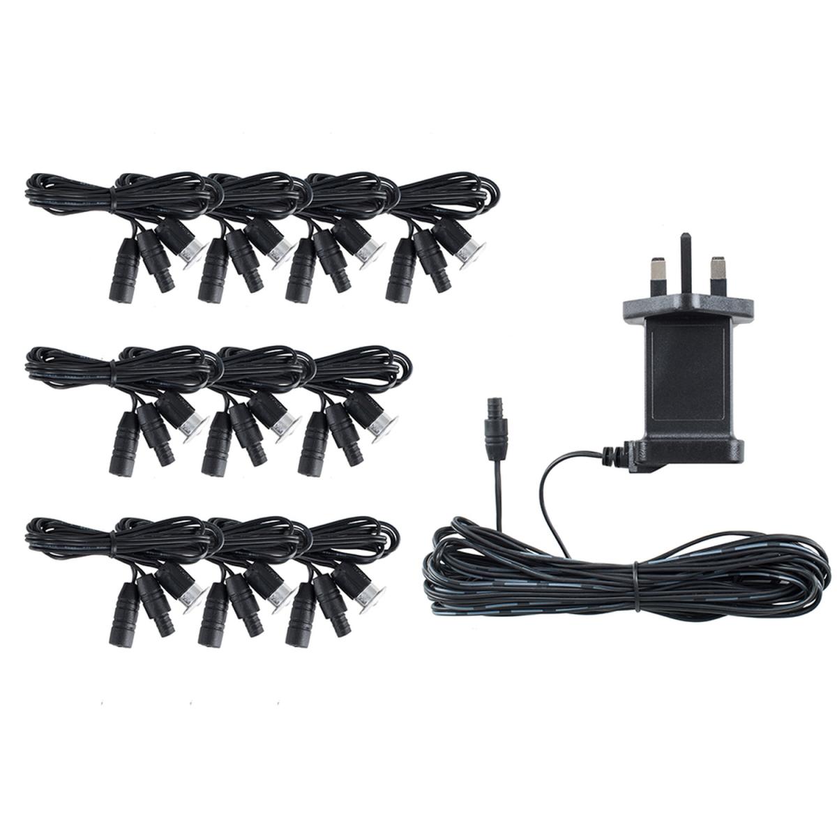 Complete Stainless Steel Decking Plinth Lights Kit. Includes all bulbs, cables, and connections. Update your garden with these fantastic lights. These white LED's light up your decking beautifully. IP67 outdoor rating. This kit contains 10 x 15mm LED decking lights (1m of cable between each light). Mains indoor transformer. 5m cable from transformer to first light.