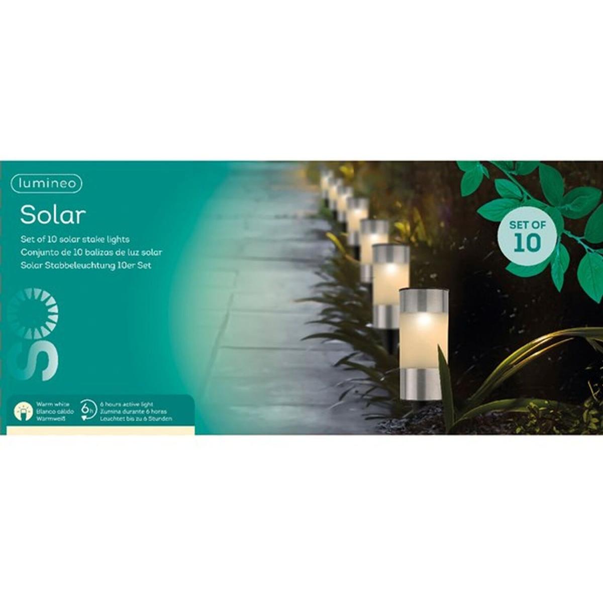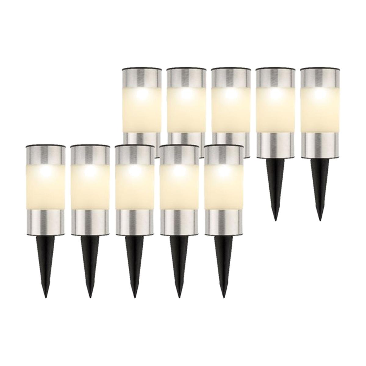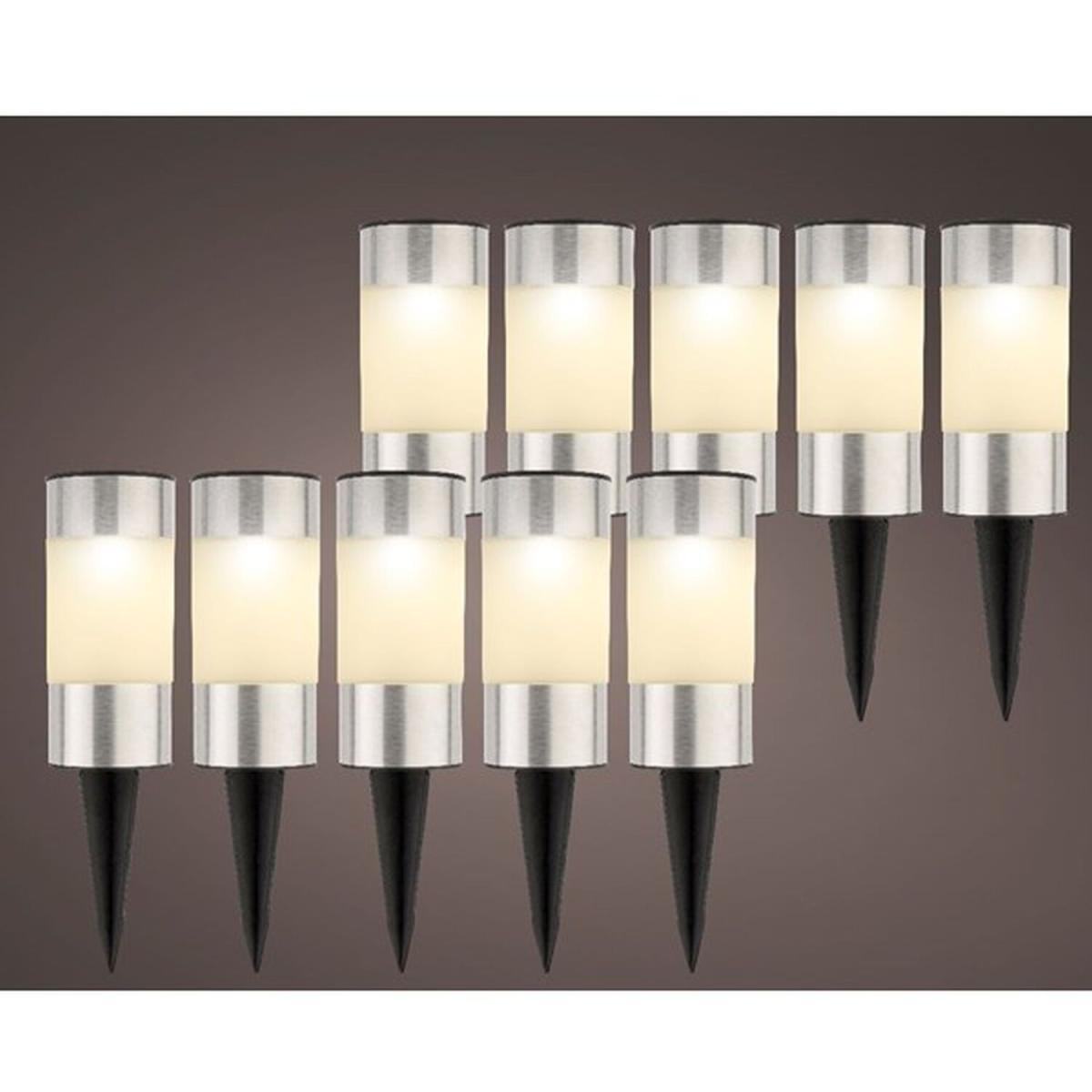 Create a warm and welcoming atmosphere to your outdoor space with this set of 10 stainless steel post lights. The warm white lights make ideal lighting for a pathway or simply relaxing in the garden with family and friends on a summers evening. The solar power function will give up to 6 hours of active light once charged with its built in solar panel on the top of each post light. Automatically lighting up at dusk without the need for batteries or a plug. (Rechargeable battery included.) An eco friendly way of lighting up your garden or outdoor space! Each pot light stands at 14cm tall excluding the ground spike, ideal for pushing into a plant pots, gravel or garden edges. The classy design is perfect for outdoor dining or just a simple decorative garden light. To access the ground spike, simply unscrew the top of the solar light and push the spike downwards out from the tube. The spike needs to be removed and then reconnected to the other side of the base cap. This then slots back into the bottom of the tube ready for you to stake into the ground.