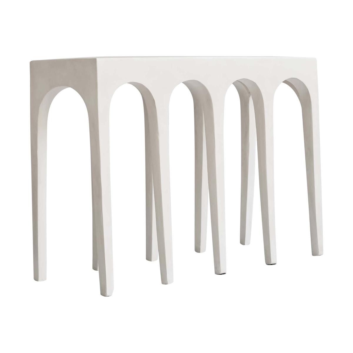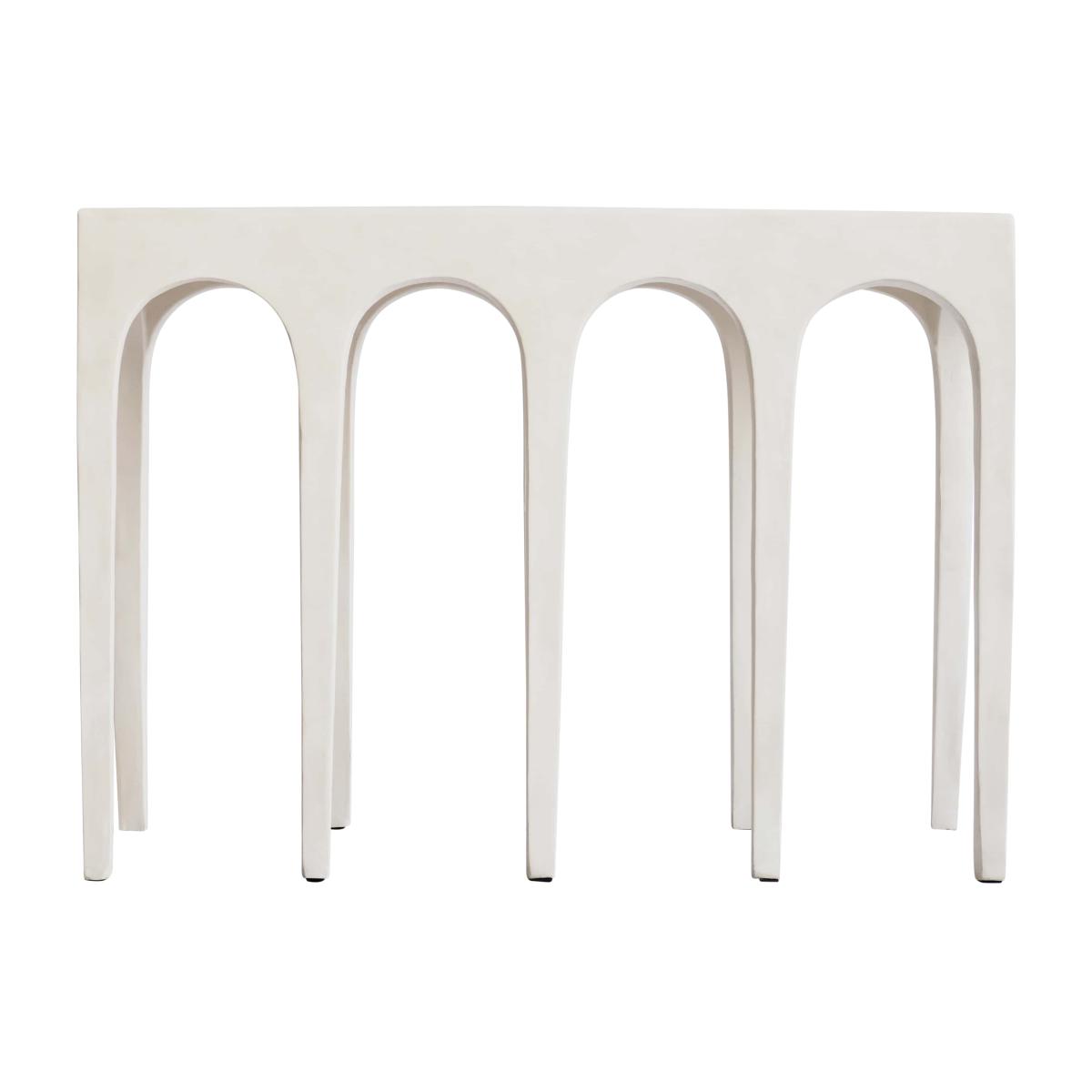 The Bow Console big side table 114x82 cm from 101 Copenhagen is inspired by Roman architecture and geometry. Created in lightweight fibre concrete, it offers both elegance and portability with a unique surface texture. With hand-painted layers, durability and long-lasting finish are ensured. Designed by Kristian Sofus Hansen and Tommy Hyldahl, the Bow series also includes various sizes of side tables, making it ideal for any interior.