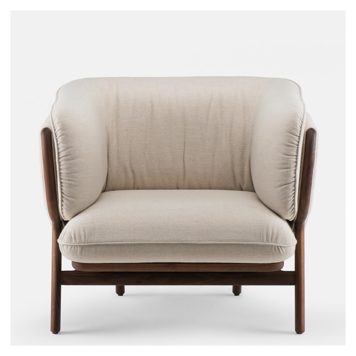 The Stanley armchair was designed by Luca Nichetto and makes its black walnut construction an elegant focal point, while the deep cushions with generously folded upholstery ensure exceptional comfort. Manufactured by De La Espada, the Stanley armchair's deep grained structure is crafted from American black walnut wood, treated with Danish oil to enhance the natural qualities of the wood. Finished with Sunniva 2 811 fabric upholstery, the material was designed by Fanny Aronsen and Raf Simons, and is a rich blend of wool and linen; two types of new wool are woven in a fine flat pattern creating a soft and hardwearing enhancement for the Stanley armchair. A harmonious union of black walnut wood and a wool and linen blend, Luca Nichetto's Stanley armchair offers clean lines and sophisticated proportions and makes a contemporary addition to any space.