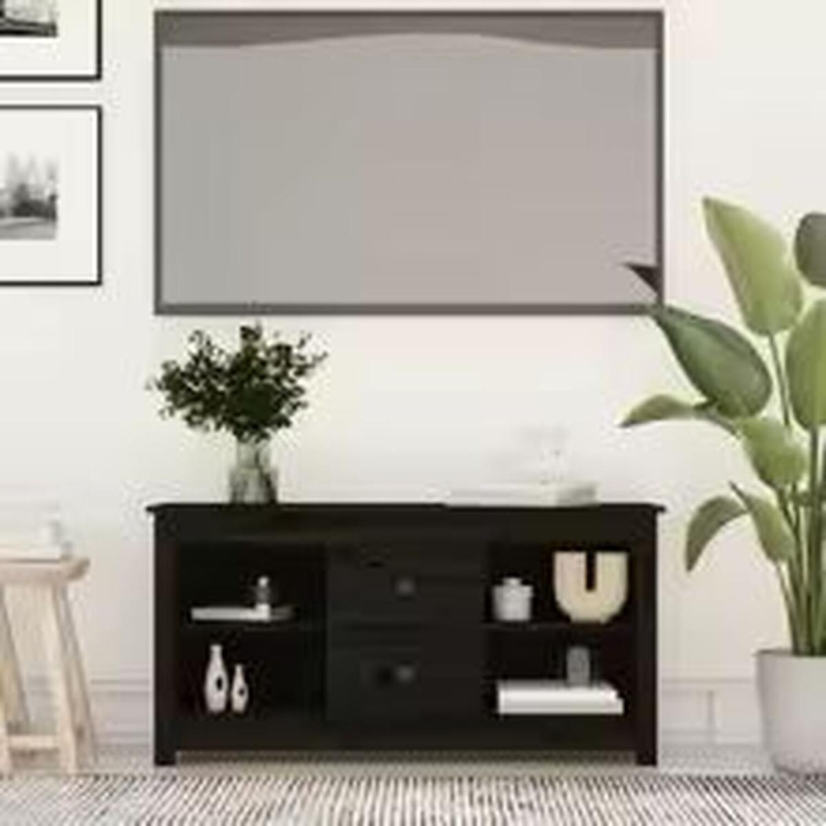 Crafted from solid pine wood, this 103cm black TV cabinet offers durability with a sleek, modern look. Its compact design is perfect for smaller living spaces, while its open shelf and closed storage provide ample room for media essentials. The sturdy build and contemporary aesthetic make it a timeless addition to any home.