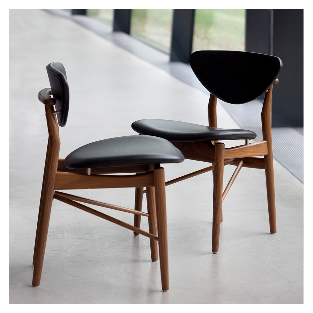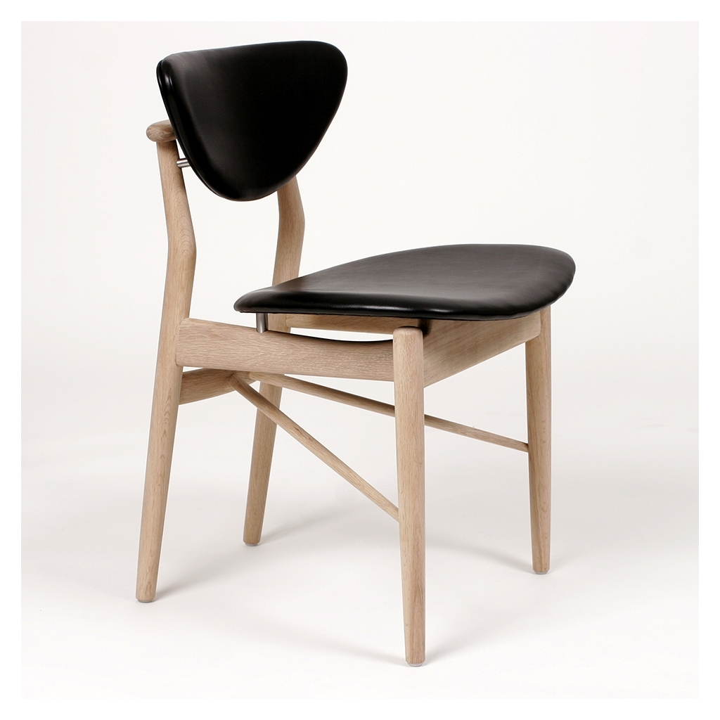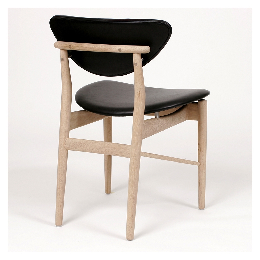 Finn Juhl, the master of Danish Modern, originally designed the iconic 108 Chair in oak and black Sorensen Prestige leather in 1946.Far from your average dining chair, the 108 Chair features exceptional details such as angled side bars and sliding cross bars, which add unexpected movement and dynamics to the construction. Upholstered in strong, soft-pigmented black Sorensen Prestige European leather with a natural grain, the chair's leather has been given a durable surface treatment that is practical and smudge proof. The first Danish furniture designer to achieve international recognition, Finn Juhl is seen by many as the master of Danish Modern. A self-taught designer, he originally studied to become an architect but worked with the mindset of a sculptor when creating his designs. Rather than thinking in terms of practicality, Finn Juhl broke free from the constraints of conventional working methods to create truly innovative designs.