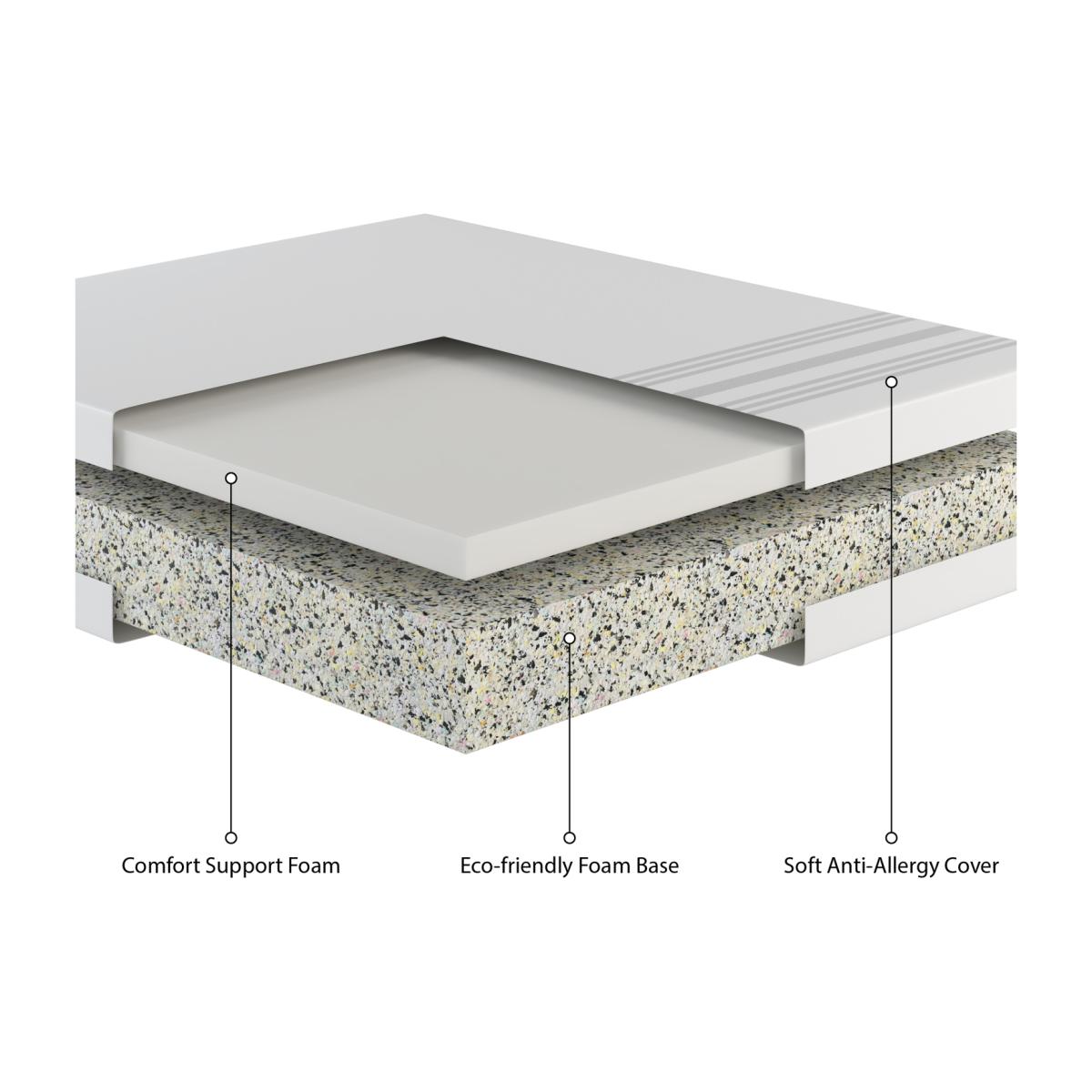 Kinder for the environment, our innovative 10cm Depth Mattress is part of our Dream Eco collection. This fully recyclable mattress has a base made from 100% recycled eco-friendly foam, which re-uses whats already available, resulting in less waste and fewer emissions. This mattress is topped with a layer of Comfort Foam for comfort & stability & also has an anti-allergy and anti-dust-mite cover. End-of-life recycling prevents mattresses from going into landfill sites and back into production for new things! Save pounds when compared to branded or high-street memory foam mattresses. Made in the UK, this sustainable mattress has a lower carbon footprint.