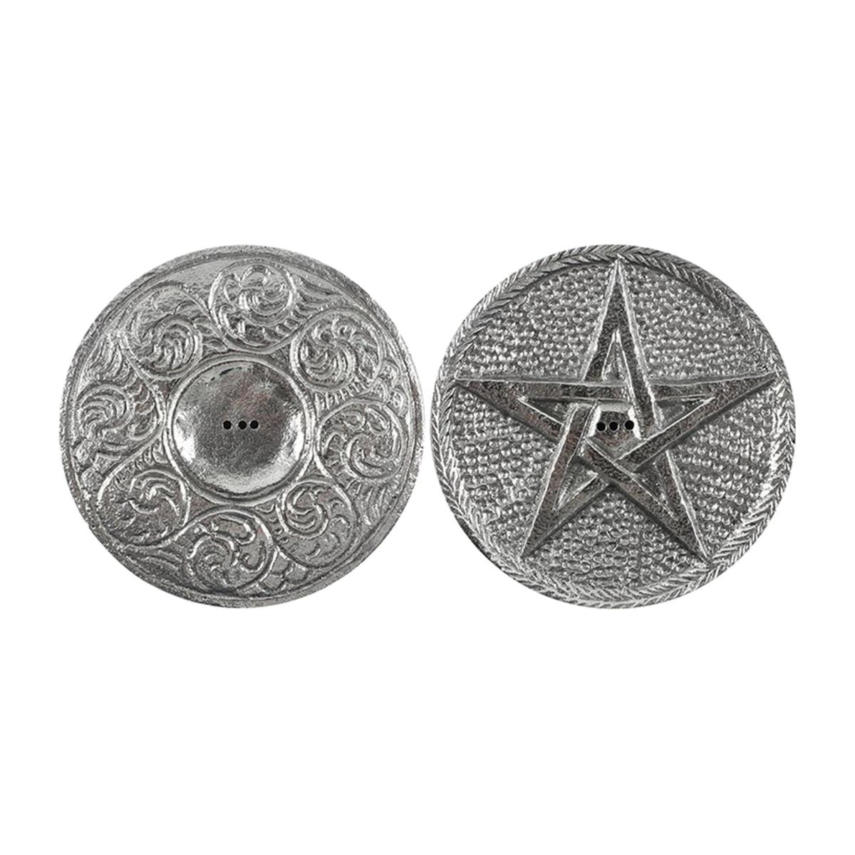 This silver-toned incense holder features a detailed pentagram design accented with swirls and dots. Includes a surface on the backside for burning incense cones and holes for up to three incense sticks. 10cm diameter.