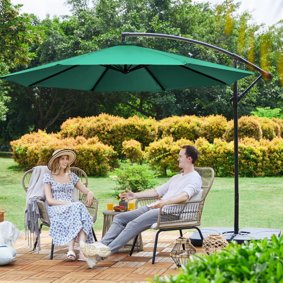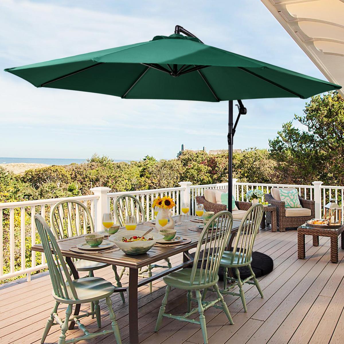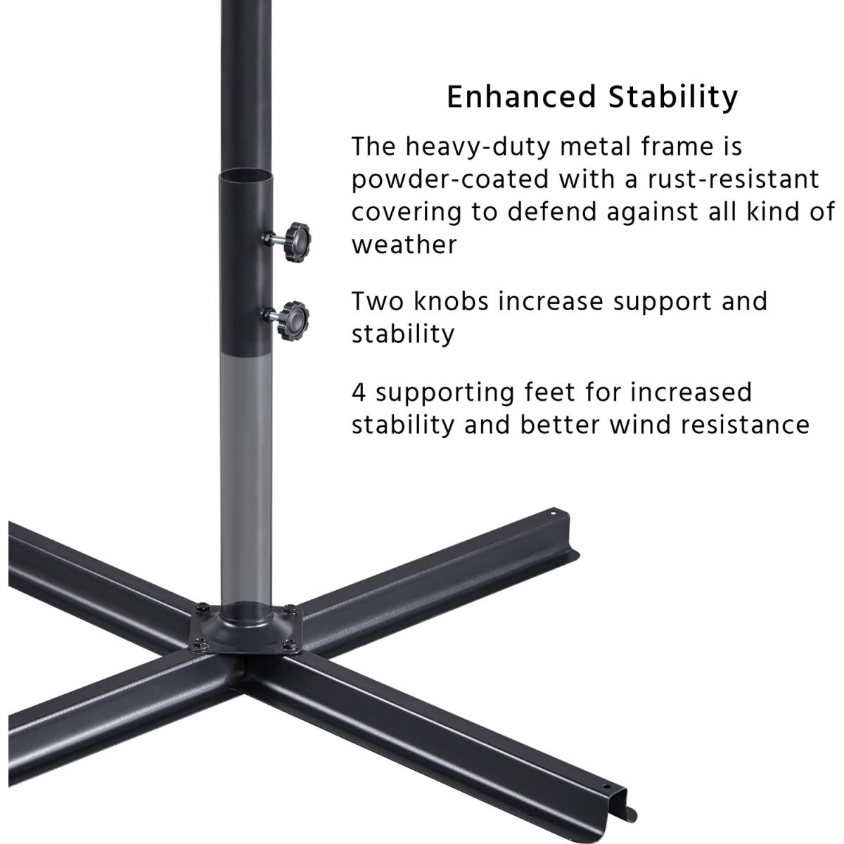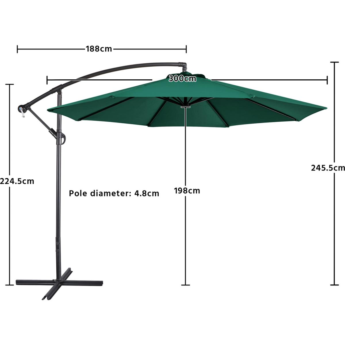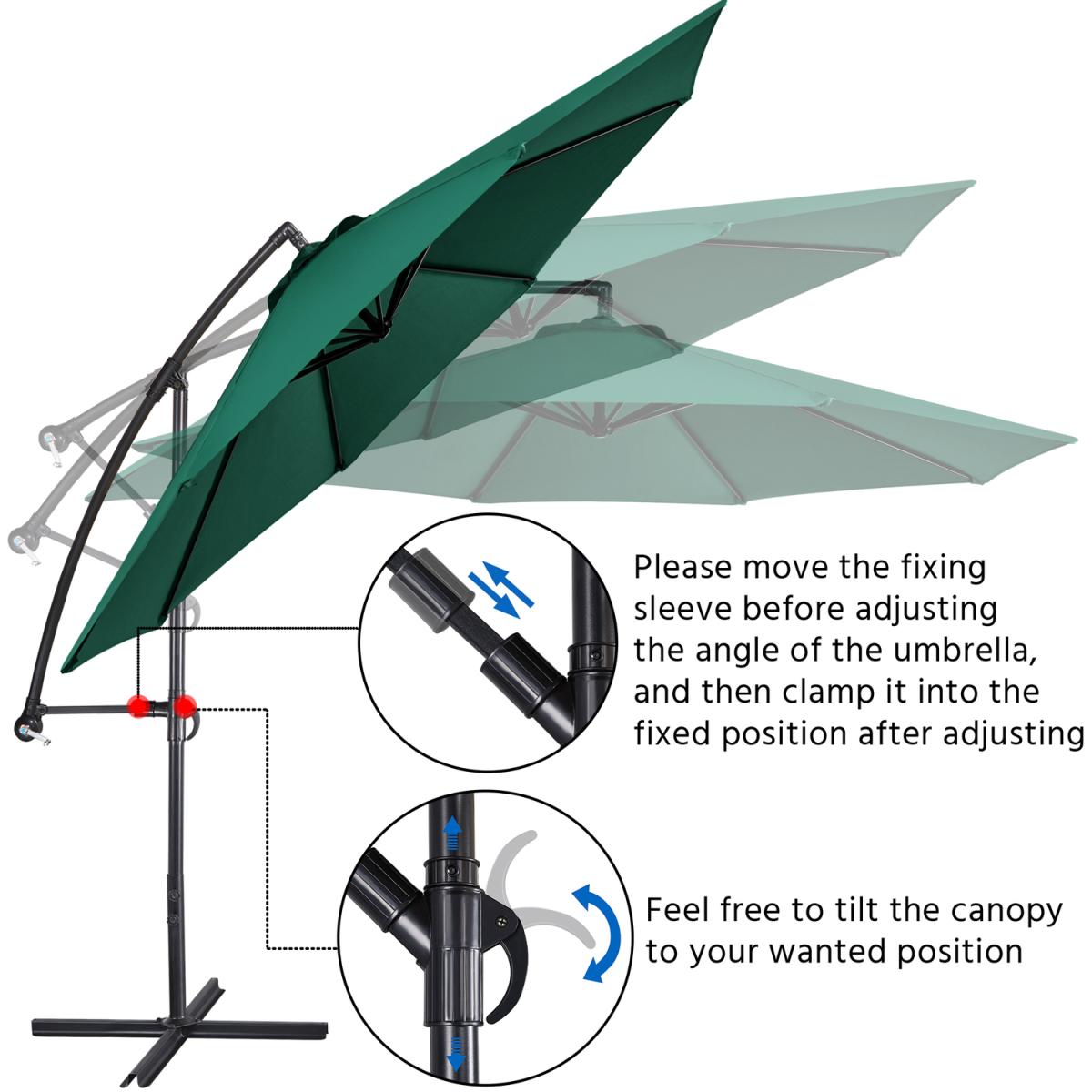 Our outdoor offset umbrella is constructed of sturdy metal that hard but lightweight, durable enough to have a long lifespan. Polyester canopy serves high intensity, it does not break or change shape. 8 open spot on the top of the canopy for better airflow. Rust-resistant coating provides all-weather protection. Large sized canopy gives wider shading space. Cranking system is easy to use and require less assembling steps. Stable crossed base make sure this patio offset cantilever umbrella is stable and anti-collapse, it is also compatible with our patio umbrella base to be a complete set.