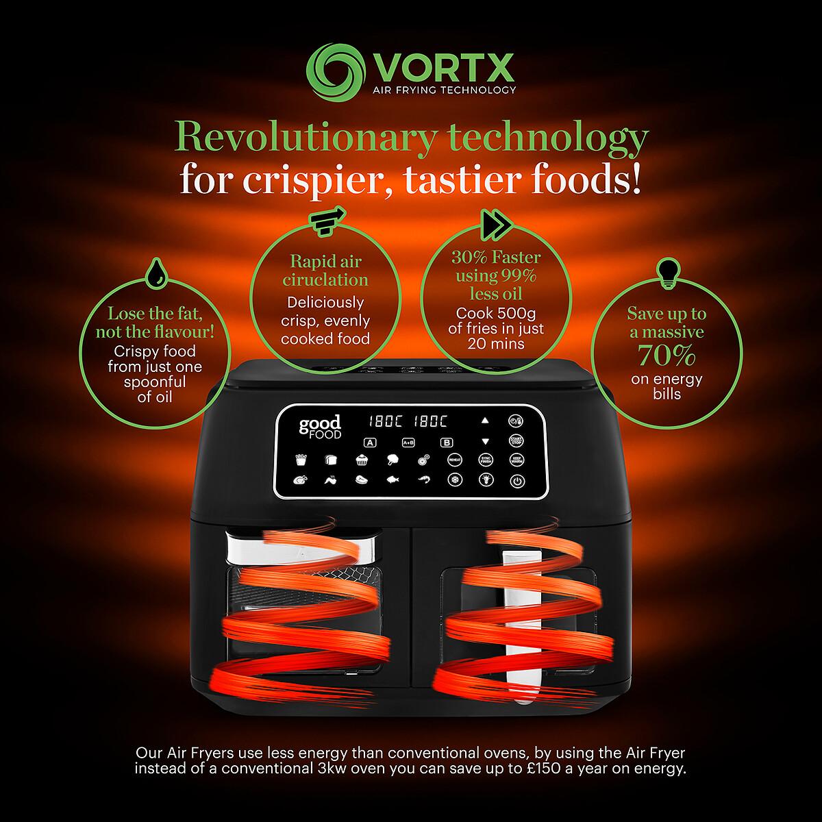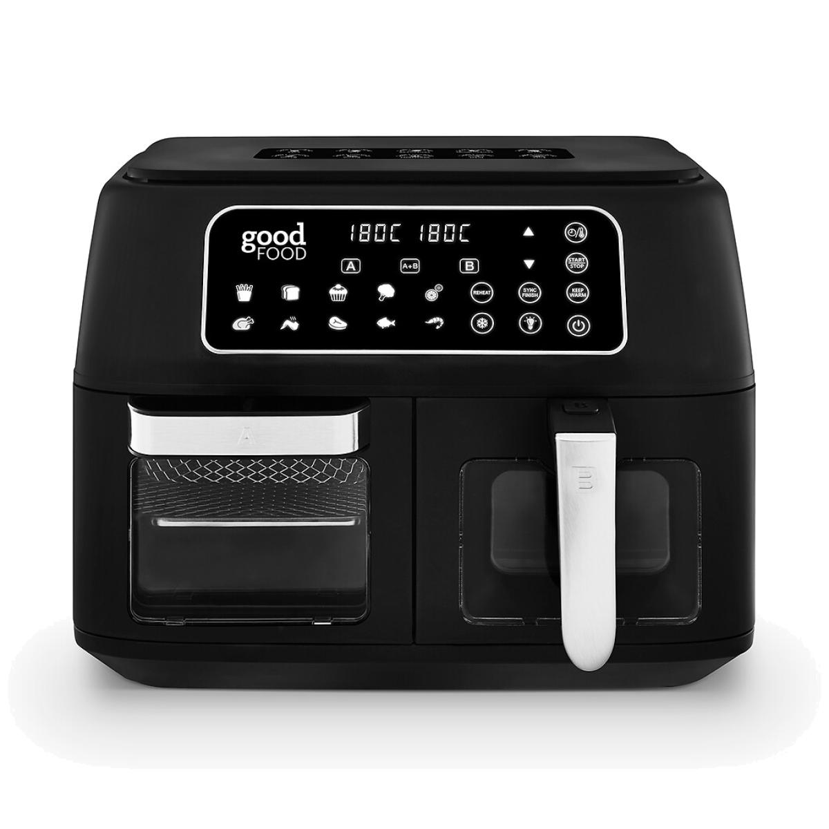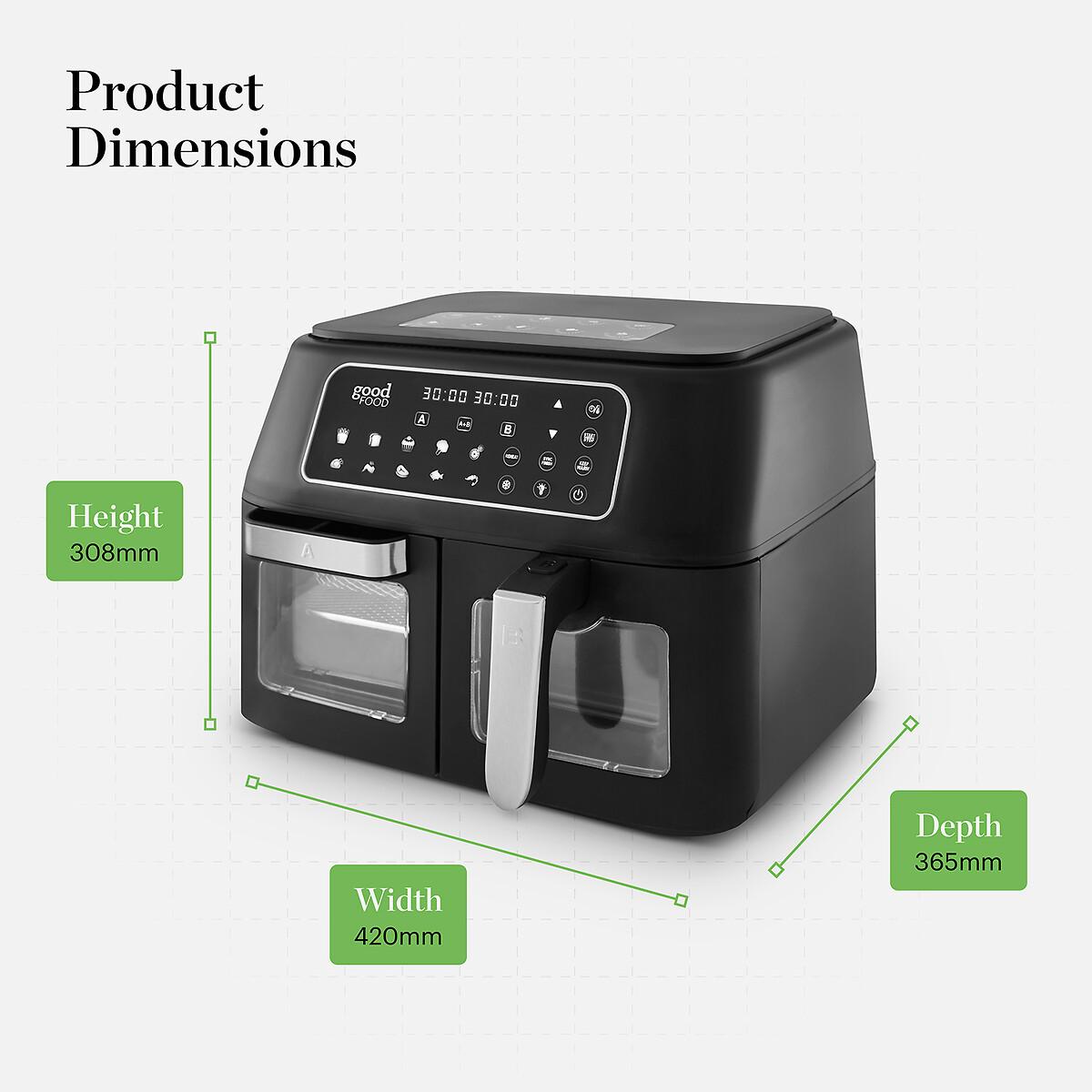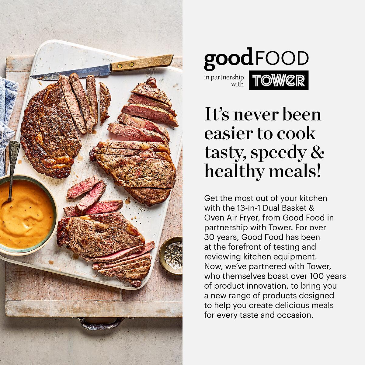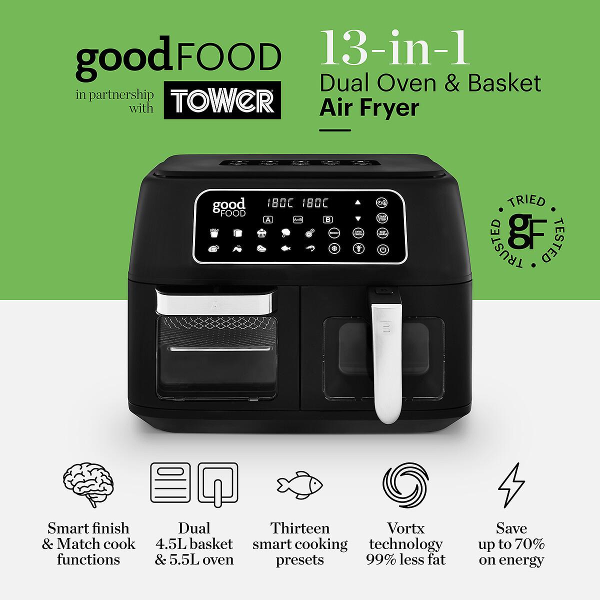 Combine oven and air fryer cooking for the ultimate in cooking convenience with this 10. L Dual Sided Air Fryer from Good Food in partnership with Tower. Specially designed to be used with the vast Good Food recipe library, it's perfect for budding chefs who want to test their skills. Featuring Vortx technology, food cooks 30% faster with just one spoonful of oil required, resulting in food that has 99% less fat. The Sync function ensures food in both drawers finishes cooking at the same time for fuss-free cooking. Match Cook duplicates settings to match in both drawers, allowing you to cook enough to feed the whole family. Vizion viewing windows on the front of the appliance let you monitor cooking progress without opening the drawer, saving both time and energy. The defrost function will let you cook food from frozen in a hurry, whilst the keep warm function will keep your food warm. Choose from 10 pre-set cooking options including Chips, Fish Ribs, Veg, Toast, Chicken wings, Steak, Prawn, Dehydrate and Bake. Product Dimensions: 36.5cmx42cmx30.8cm. Composition: Plastic/Metal This product will be dispatched by one of our trusted suppliers. You’ll be contacted by their selected courier about your delivery.