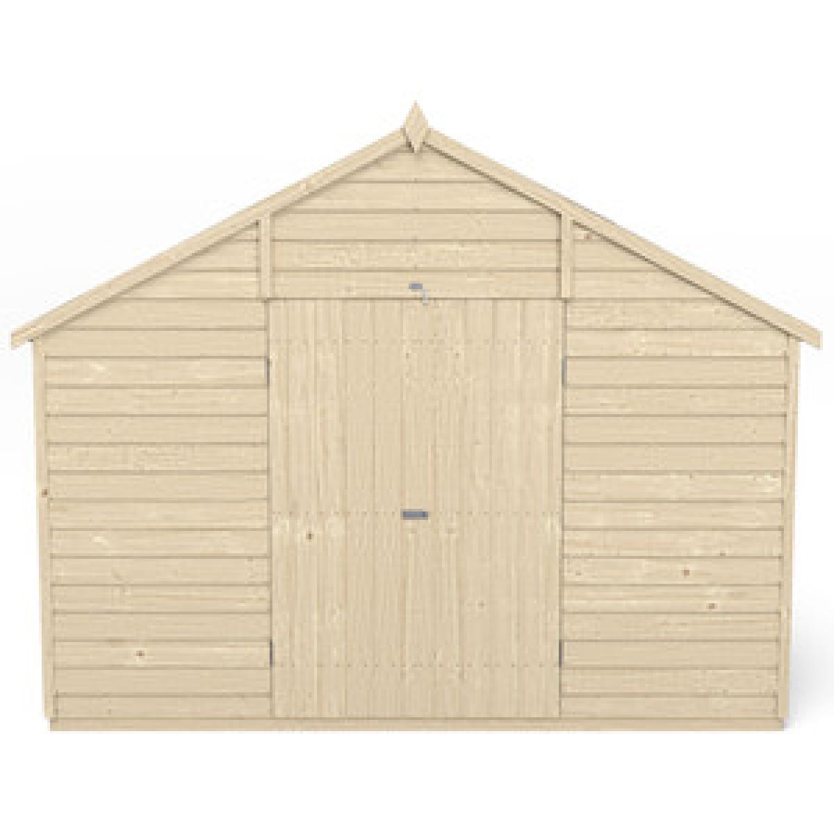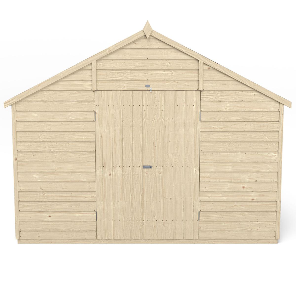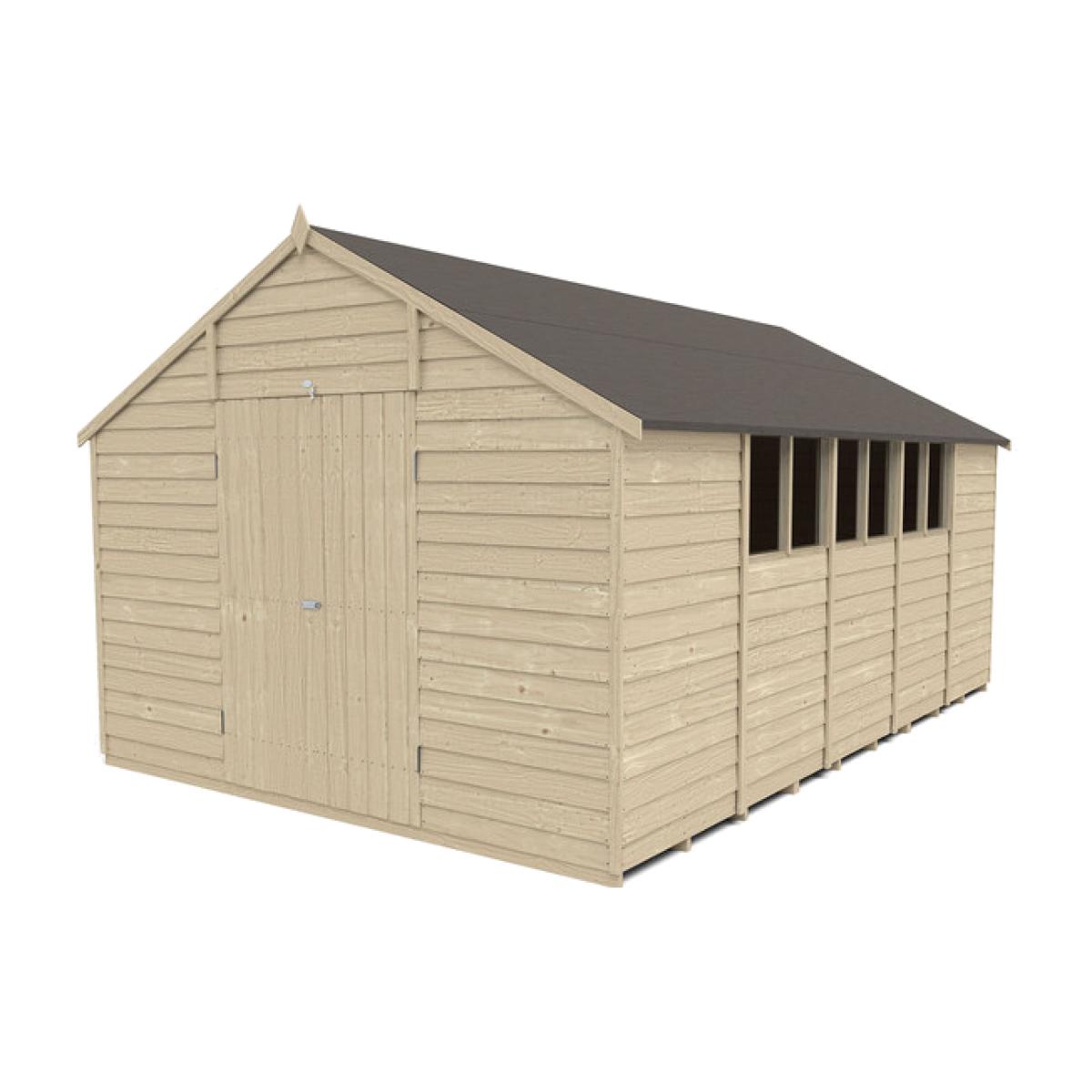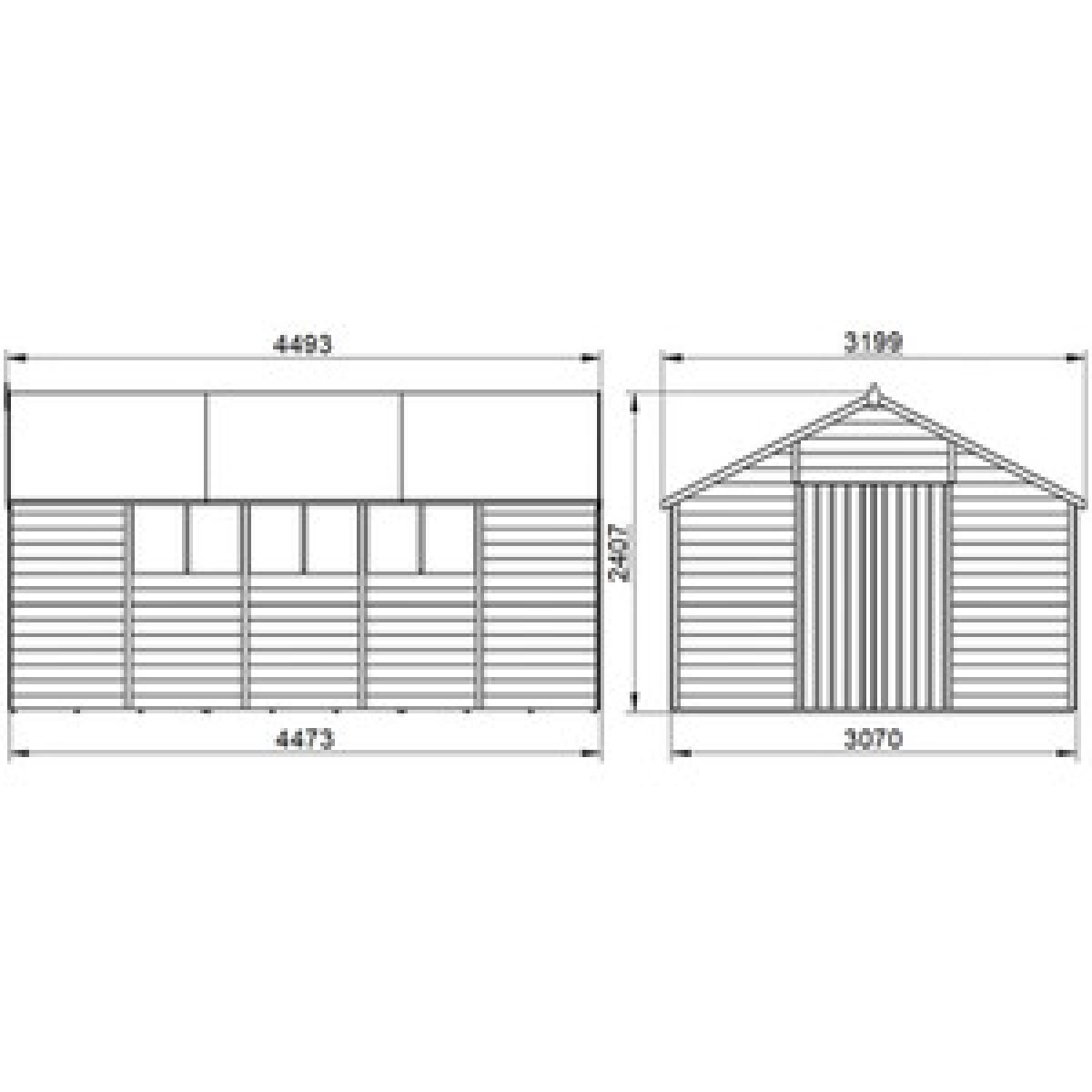 This 10x15 Overlap Pressure Treated Apex Shed is a spacious and stylish garden shed ideal for using as an outdoor workshop or for large amounts of garden storage. The traditional apex roof, generous headroom, and decorative touches ensure this shed will look fantastic in your garden, as well as being extremely practical. Constructed using pressure treated timber, this shed will stay strong and durable for years to come. It is resistant to rot and fungal infections, and the overlap design of the timber boards allows for natural movement of the timber during changing weather conditions and aid in water run-off. With increased framing to give the building a stronger construction, the shed comes with a solid timber floor, which is much hardier than more common OSB, making it ideal for storing heavier gardening equipment. The shed also comes with hidden security measures, featuring anti-tamper hinges that can't be seen or accessed from the outside, as well as a hasp and staple latch that allows you to padlock the door. The windows are made from shatter-proof PET glazing, which won't become yellow and brittle over time, making sure your shed always looks attractive. With a light, natural woody colour from the pressure treating, contrasting with the black sand felt roof, this shed won't only be a great storage place, but help to bring a sense of understated charm and elegance to your garden. The diamond-shaped finial at the peak of the roof helps create even more height from the outside, while the natural grain found throughout the wooden beams ensures this shed will fit in with any natural garden decor. Installation by a team of professionals is available for an extra yet affordable price, and all fittings and fixtures are included with this shed, as well as easy-to-follow instructions are included for any DIY hobbyists who want to really make this shed their own by building it themselves.