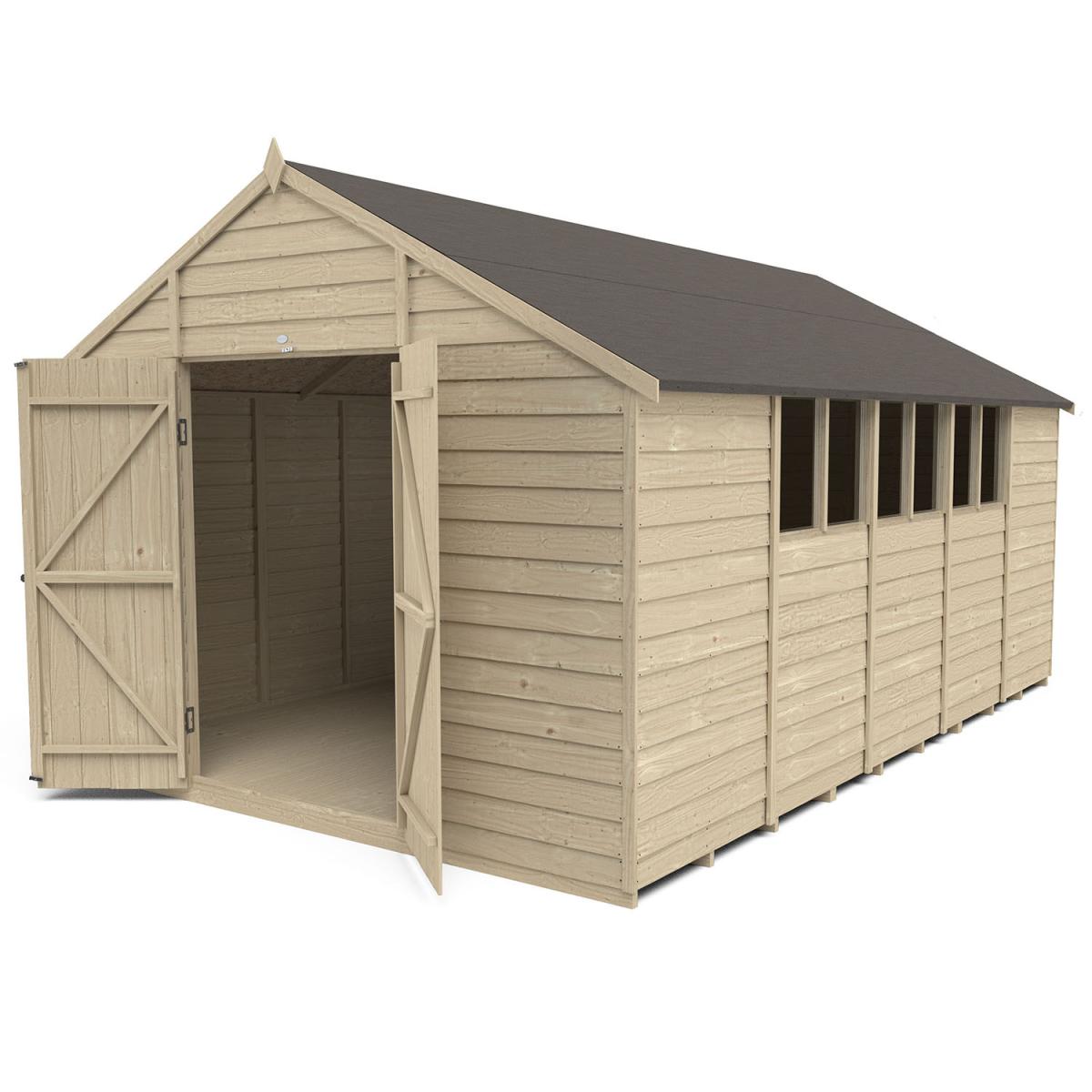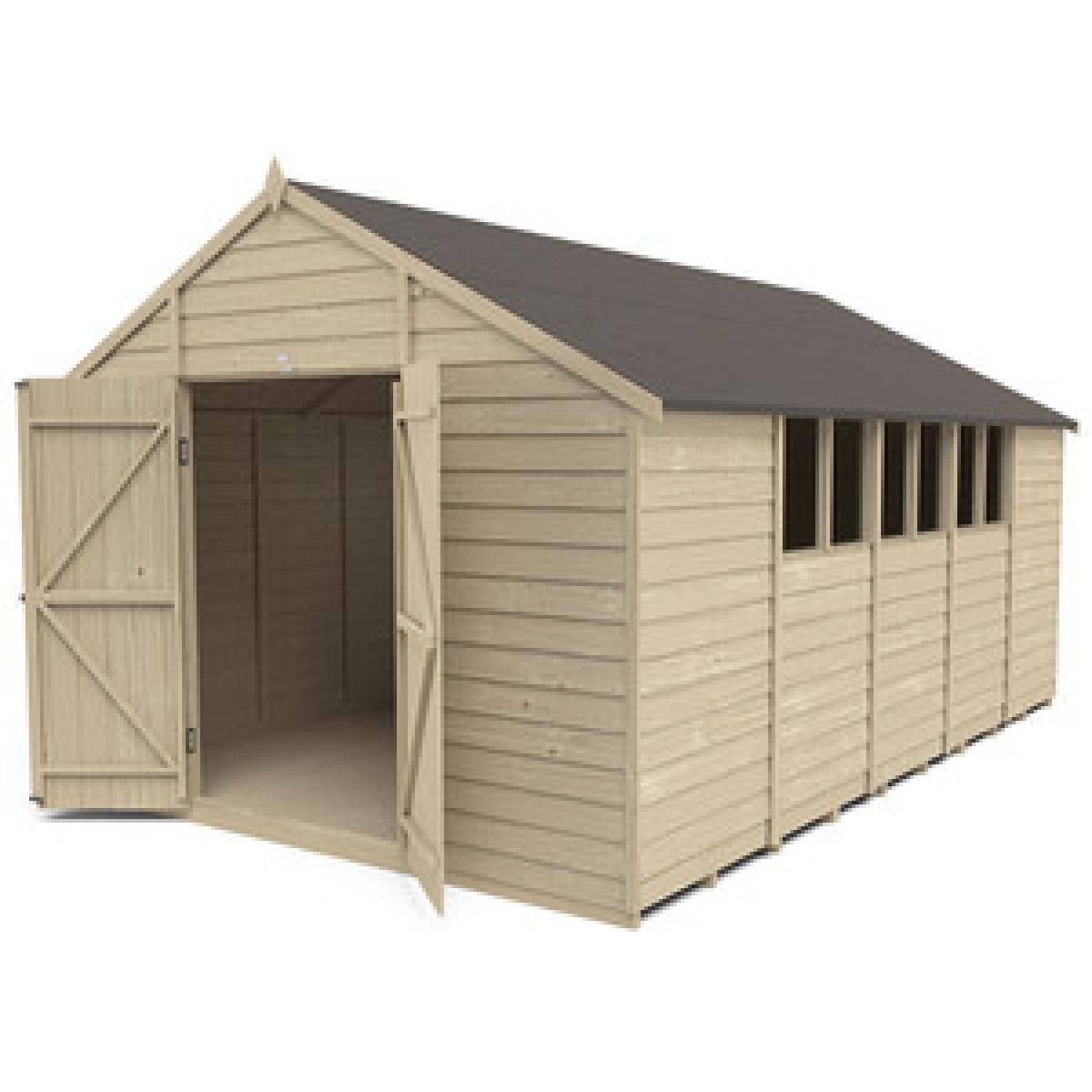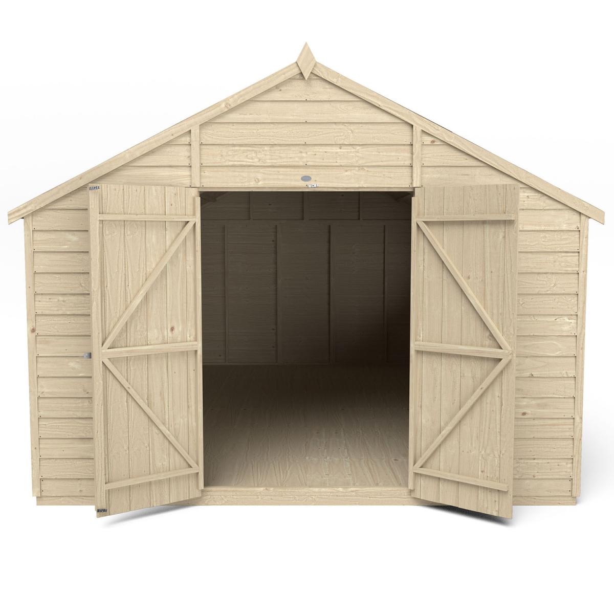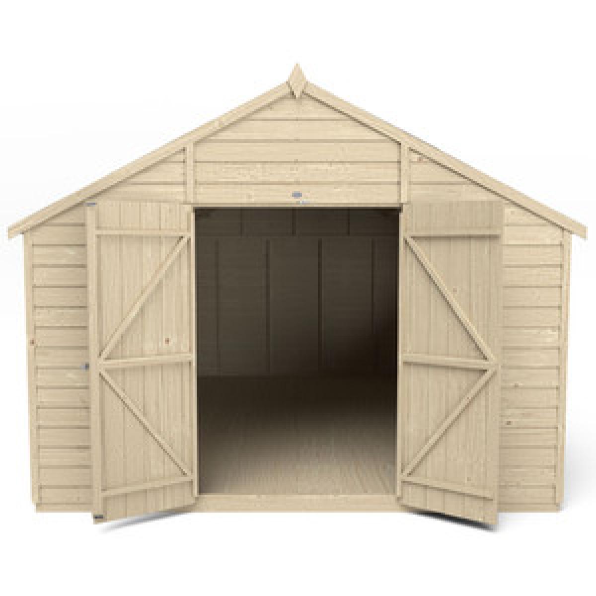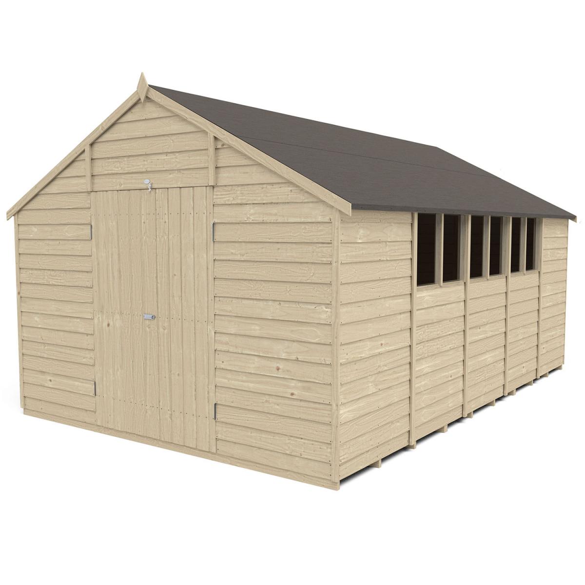 This 10x15 Overlap Pressure Treated Apex Shed is a spacious and stylish garden shed ideal for using as an outdoor workshop or for large amounts of garden storage. The traditional apex roof, generous headroom, and decorative touches ensure this shed will look fantastic in your garden, as well as being extremely practical. Constructed using pressure treated timber, this shed will stay strong and durable for years to come. It is resistant to rot and fungal infections, and the overlap design of the timber boards allows for natural movement of the timber during changing weather conditions and aid in water run-off. With increased framing to give the building a stronger construction, the shed comes with a solid timber floor, which is much hardier than more common OSB, making it ideal for storing heavier gardening equipment. The shed also comes with hidden security measures, featuring anti-tamper hinges that can't be seen or accessed from the outside, as well as a hasp and staple latch that allows you to padlock the door. The windows are made from shatter-proof PET glazing, which won't become yellow and brittle over time, making sure your shed always looks attractive. With a light, natural woody colour from the pressure treating, contrasting with the black sand felt roof, this shed won't only be a great storage place, but help to bring a sense of understated charm and elegance to your garden. The diamond-shaped finial at the peak of the roof helps create even more height from the outside, while the natural grain found throughout the wooden beams ensures this shed will fit in with any natural garden decor. Installation by a team of professionals is available for an extra yet affordable price, and all fittings and fixtures are included with this shed, as well as easy-to-follow instructions are included for any DIY hobbyists who want to really make this shed their own by building it themselves.