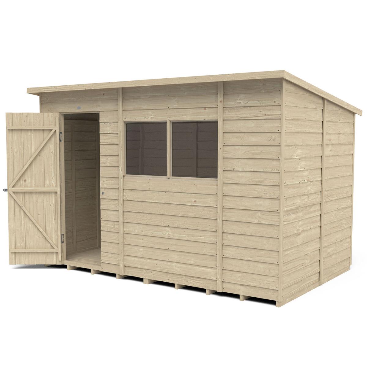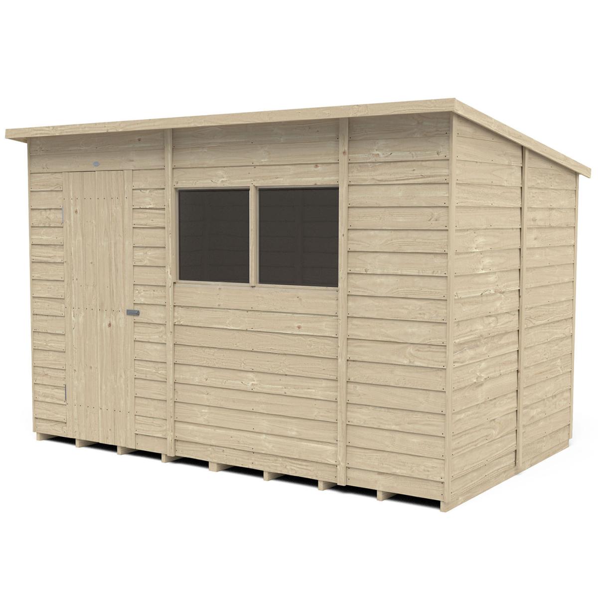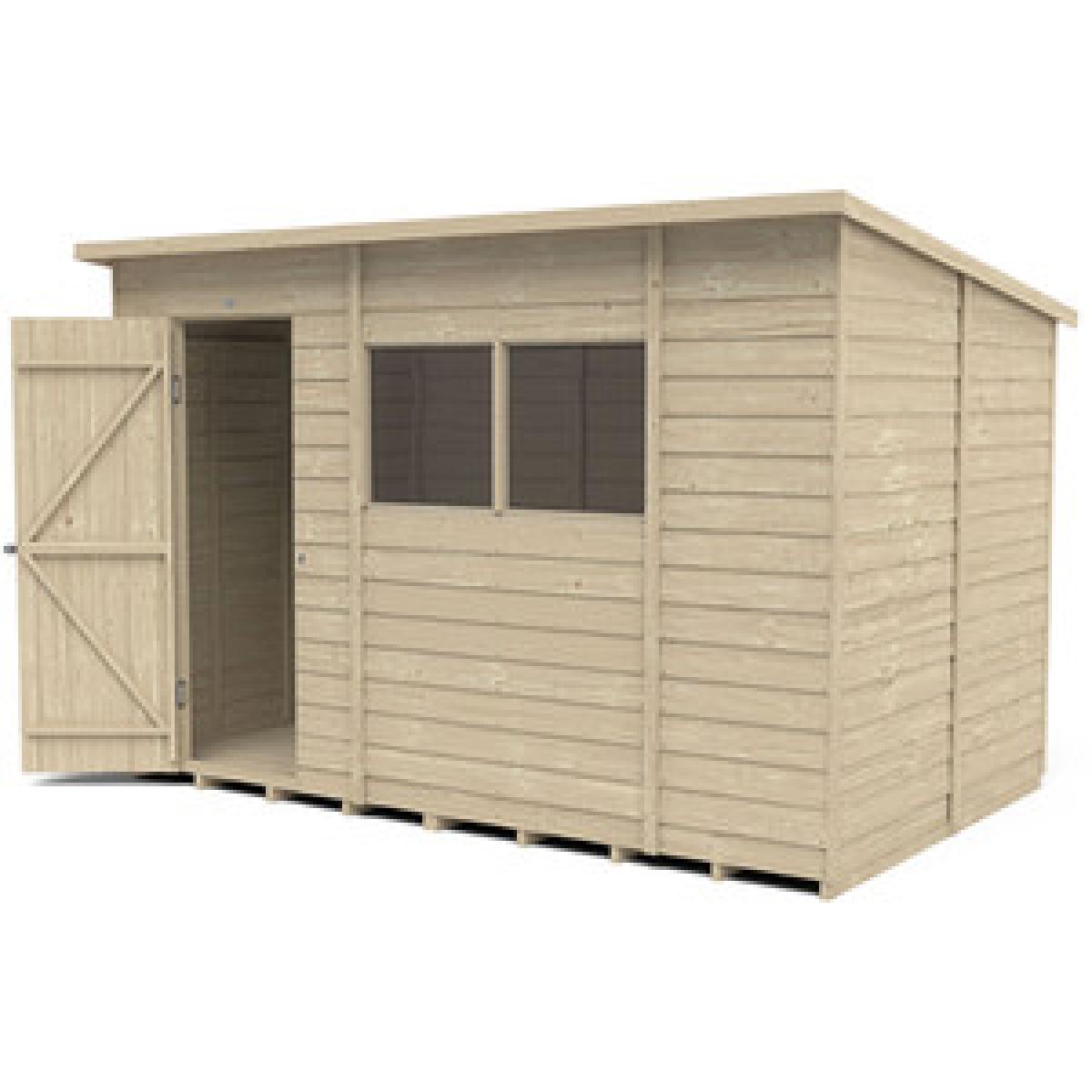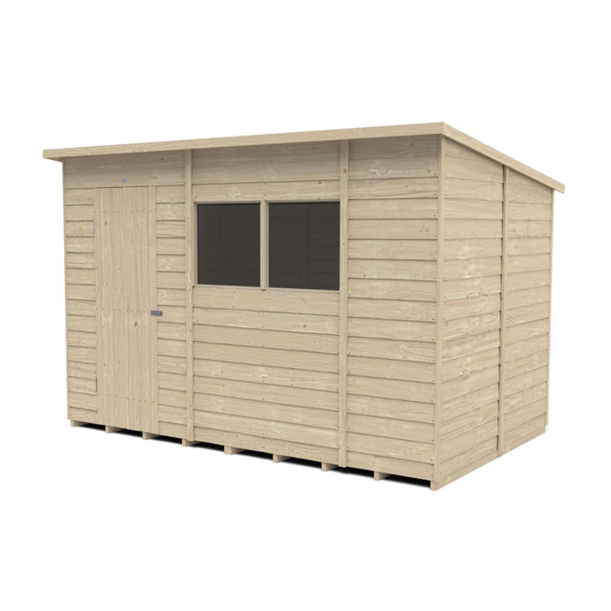 The 10x6 Overlap Pressure Treated Pent Shed is the ideal garden storage shed, helping you keep your garden neat, tidy, and stylish. The slanted pent roof is perfect for placing this shed against a wall or fence and will look brilliant in your garden. A larger garden shed, it’s perfect for storing away lots of heavy garden machinery and tools, bikes, kids' outdoor toys, and much more. Constructed using pressure treated timber, the Overlap Pent Shed will stay strong and durable for years to come. It is resistant to rot and fungal infections, and the overlap design of the timber boards allows for natural movement of the timber during changing weather conditions and aid in water run-off. With increased framing to give the building a stronger construction, the shed comes with a solid timber floor, which is much hardier than more common OSB, making it ideal for storing heavier gardening equipment. The windows are made from shatter-proof PET glazing, which won't become yellow and brittle over time, making sure your shed always looks attractive. The shed also comes with hidden security measures, featuring anti-tamper hinges that can't be seen or accessed from the outside, as well as a hasp and staple latch that allows you to padlock the door. The pressure treating of the timber allows for the pale gold colour and natural wood grain to really shine through. This paired with the understated yet stylish construction will help this Pent Shed become a decisively sweet and charming structure within your garden, complimenting all natural foliage and any colour scheme of your decor. Installation by a team of professionals is available for an extra yet affordable price, and all fittings and fixtures are included with this shed, as well as easy-to-follow instructions are included for any DIY hobbyists who want to really make this shed their own by building it themselves.
