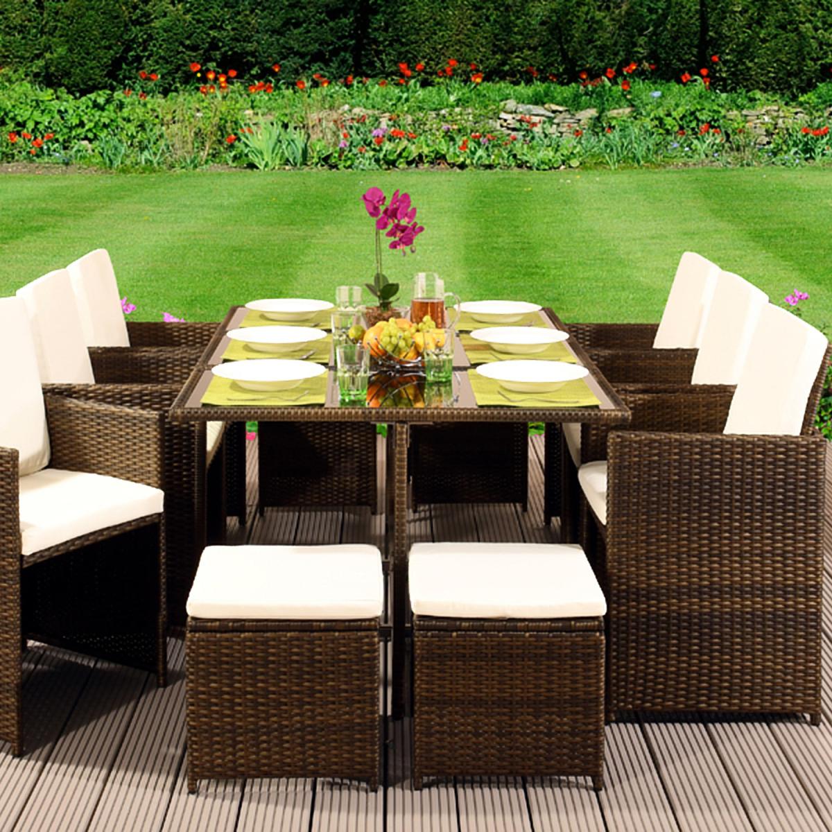 The footstools neatly store away under the chairs and the chair backrests fold forward to be tucked under the table to form a cube, perfect for smaller living spaces. The seat cushions are designed to resist the elements with showerproof covers that are removable and machine washable. Made from high-quality poly-rattan material which is UV resistant to prevent colour fading and woven over a sturdy steel metal frame to provide durability over the years and requires no maintenance. The dining table features a scratch-resistant tempered glass top for safety and resilience. Please note that there is no hole for a parasol with this table design.
