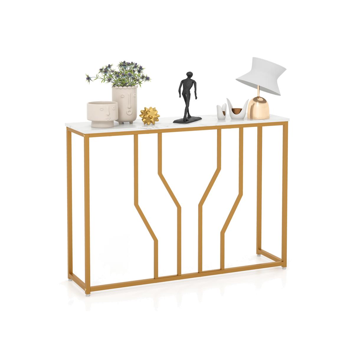No matter what you want to do, either storage or display, this console table is an ideal choice. White faux marble texture and geometric gold metal frame exude a high-end, elegant feel. Moreover, a wide tabletop provides ample space to store and display daily supplies and decorative items. The combination of durable board and solid metal tubes means better durability, longer life span and higher sturdiness. Besides, an anti-toppling device can securely fix the entryway table to avoid tipping over.