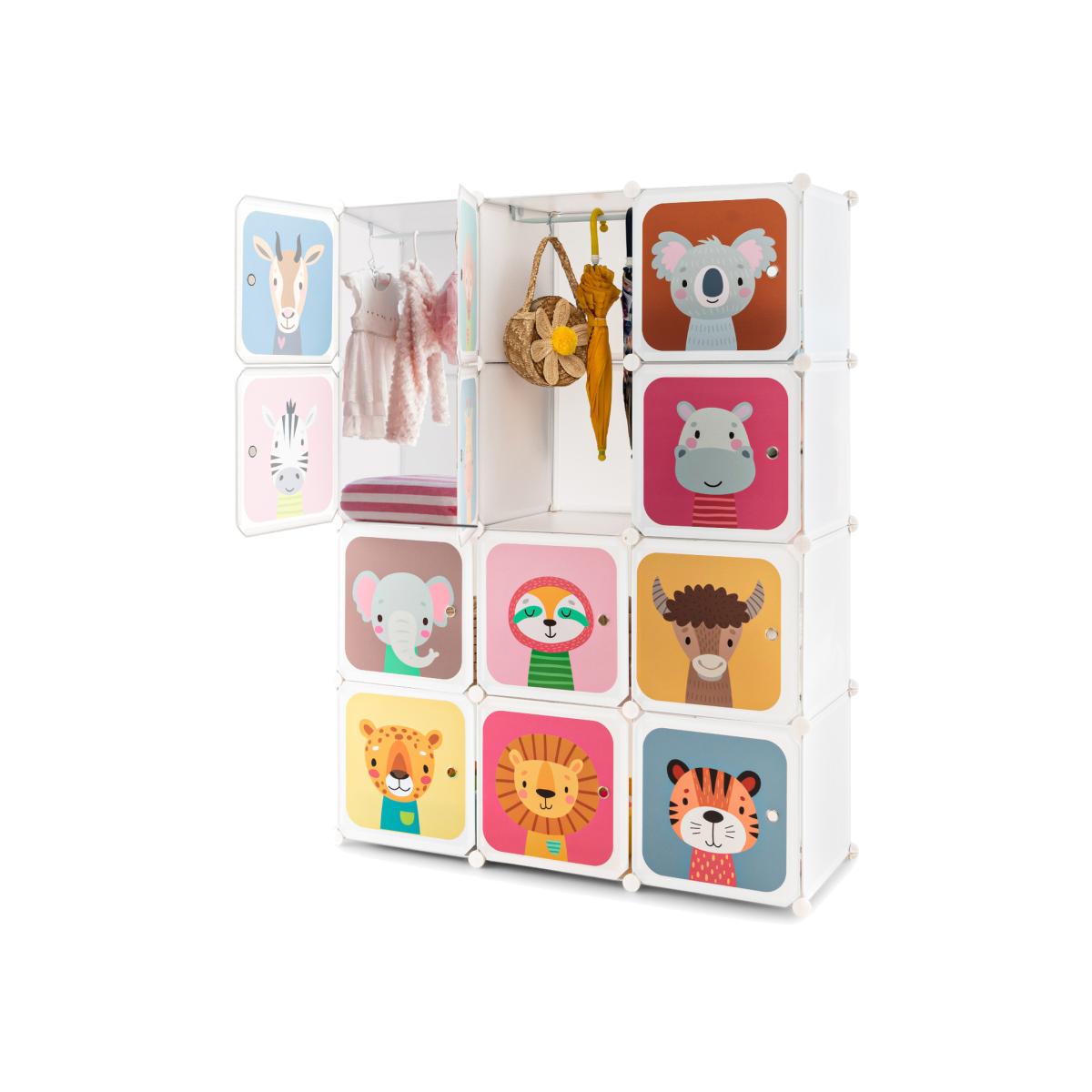 If you always have baby's clothes or toys cluttered here and there, this 12-cube storage organizer will be a good solution. First and foremost, the kid's room armoire features plenty of storage space to hold the sundries and keep the room clean. There's even 2 hanging sections for baby's clothes. What's more, it can be freely combined according to specific needs, being used separately or be stacked for narrow corners. Usually it is combined for larger space. And the 3 x 4 cube organizer has cute patterned doors, which not only hide the mess, but also decorate the space. And tool-free assembly means you can easily put the wardrobe together without professional skills or technical tools.