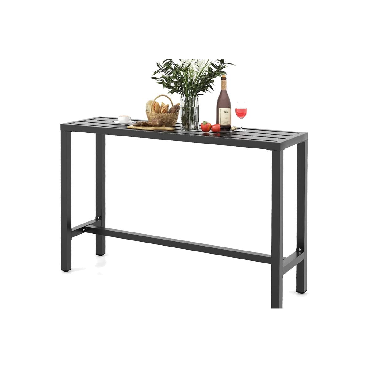 I really like this outdoor bar table for its sleek black finish and versatile size, making it a practical addition to various outdoor settings. It works particularly well in contemporary or industrial-style gardens and patios, where its clean lines complement modern design elements. For styling, consider pairing it with minimalist bar stools or high-backed chairs in weather-resistant materials. To keep the look cohesive, add some greenery in planters or a string of outdoor lights for a relaxed yet stylish vibe. Its compact size makes it ideal for entertaining close friends or creating a dedicated outdoor drinks station without taking up too much space.