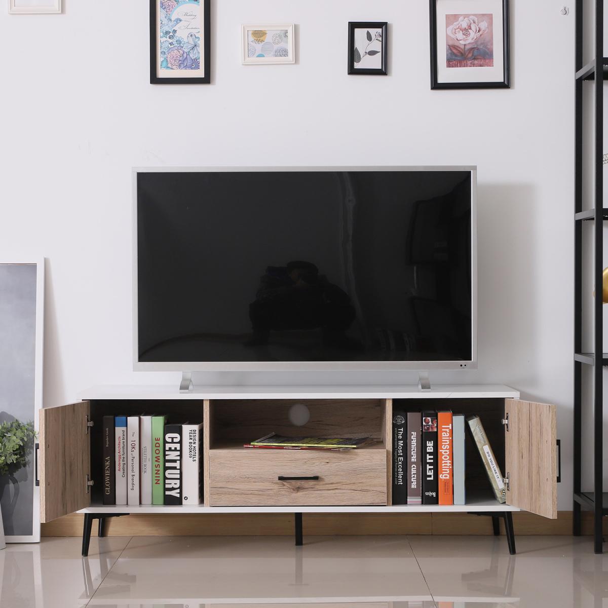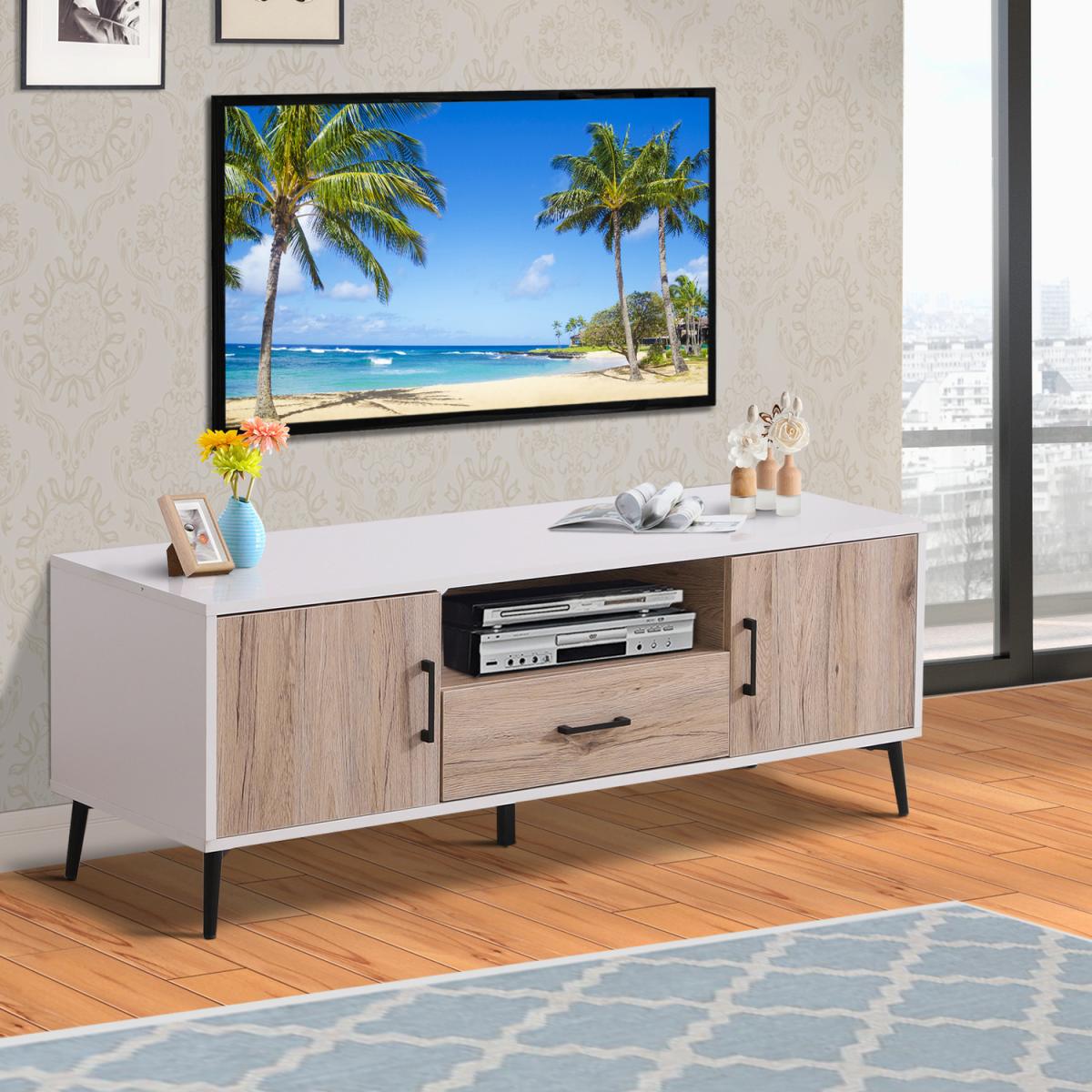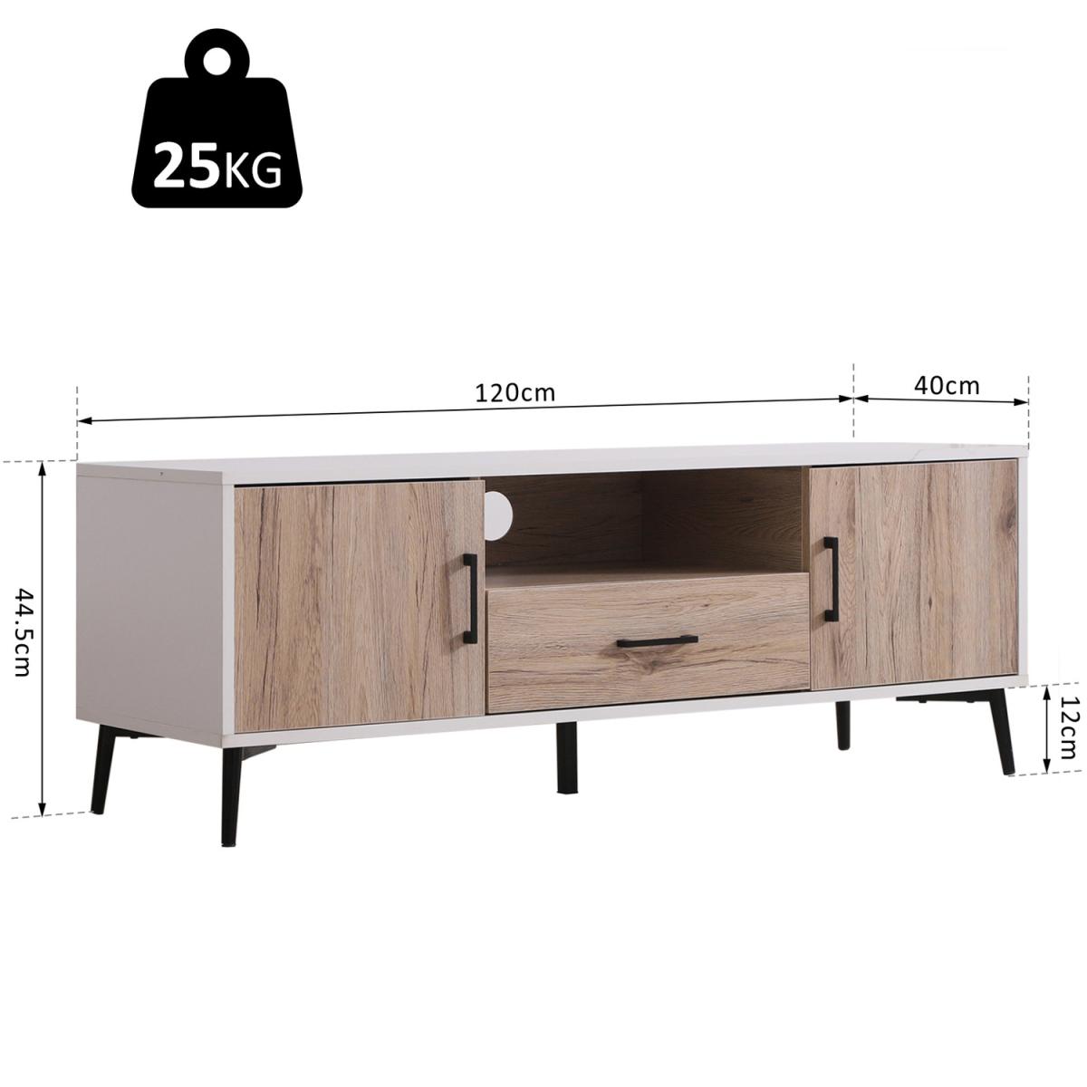 Ensure your TV and other media are kept in style, thanks to this two-tone Scandinavian style stand from HOMCOM. Made from a blend of particleboard and MDF for durability and strength that can hold up to 25kg in weight, it is crafted into a beautiful design that features two end cupboards, a bottom slide-out drawer and an open shelf in the middle, giving you plenty of storage space for DVDs, electronics and more. A large surface top provides plenty of room for a television and decorative objects, with four metal feet to keep the unit stable. It will help you get the most out of your space with elegance and ease.