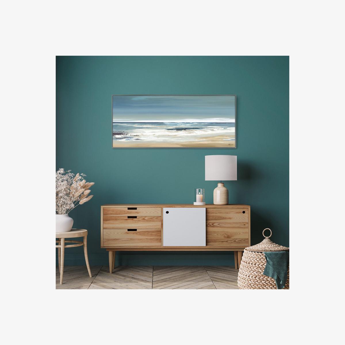 I love this seaside print - it’s a great way to bring a calming, natural element into various interiors. The size (122x52cm) makes it versatile for larger walls, especially over sideboards or in living rooms, creating a focal point without overwhelming the space. It works beautifully in coastal-inspired schemes, but also complements modern minimalism or Scandinavian interiors with its clean lines and soothing colours. To style it effectively, consider pairing it with neutral or softer tones in surrounding accessories, like cushions or vases, to let the artwork remain the star. For added impact, framing it in a sleek, simple frame helps keep the look contemporary and uncluttered.