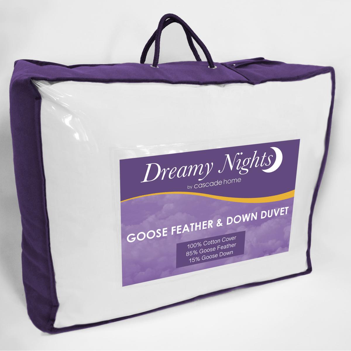 13.5 tog Goose Feather and Down Duvet, available in 4 sizes. 85% Class 1 White Goose Feather 15% White Goose Down filling with 100% Cotton down-proof fabric 233 thread count packed in rope handle carry bag with insert.
