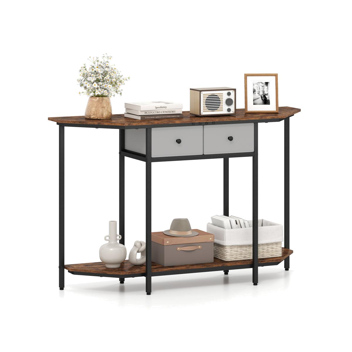Discover the charm and functionality of our 2-tier console table! Crafted for enthusiasts of both style and utility, this elegant piece features a spacious tabletop adorned with a unique polygonal design and a bonus lower shelf to display your chic decorations. Stash away your essentials in the nifty foldable fabric drawers, and set it up in a breeze! Engineered with a robust metal frame, this narrow sofa table boasts excellent stability on any surface with 6 adjustable foot pads.