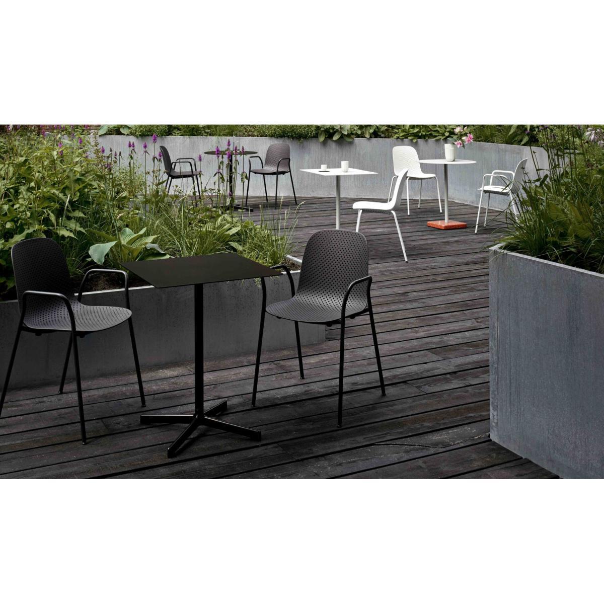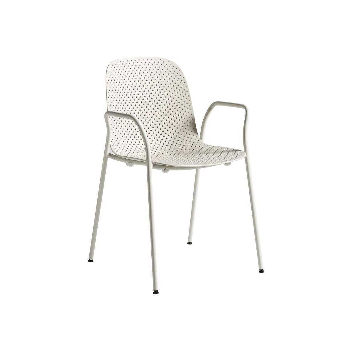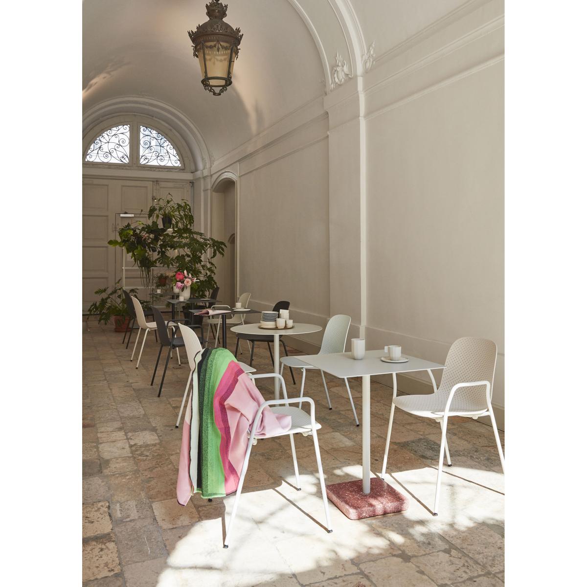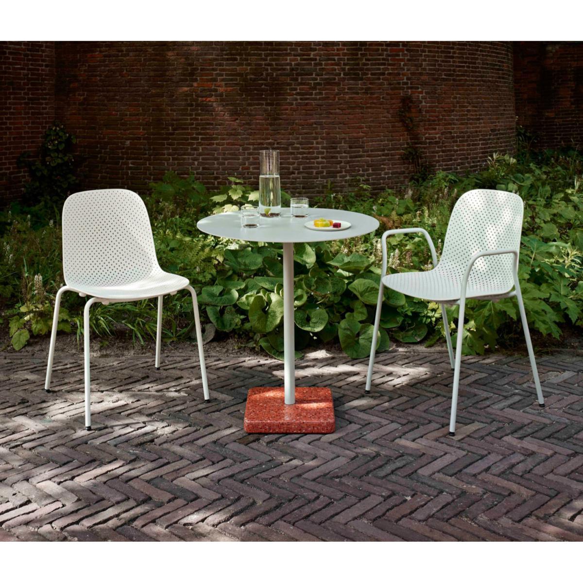 Perforated material. A perforated sheet metal effect for this polypropylene armchair that reinterprets the industrial spirit in a cheerful, contemporary way. The micro-perforation offers a delicate graphic pattern that plays with transparency. The variations in the size of the holes produces an impression of movement. The perforation is also functional: the holes allow rainwater to drain away. Robust, lightweight and stackable, the 13eighty armchair can be used inside and out. It adapts to all environments, private and public alike (restaurants, bars etc).
