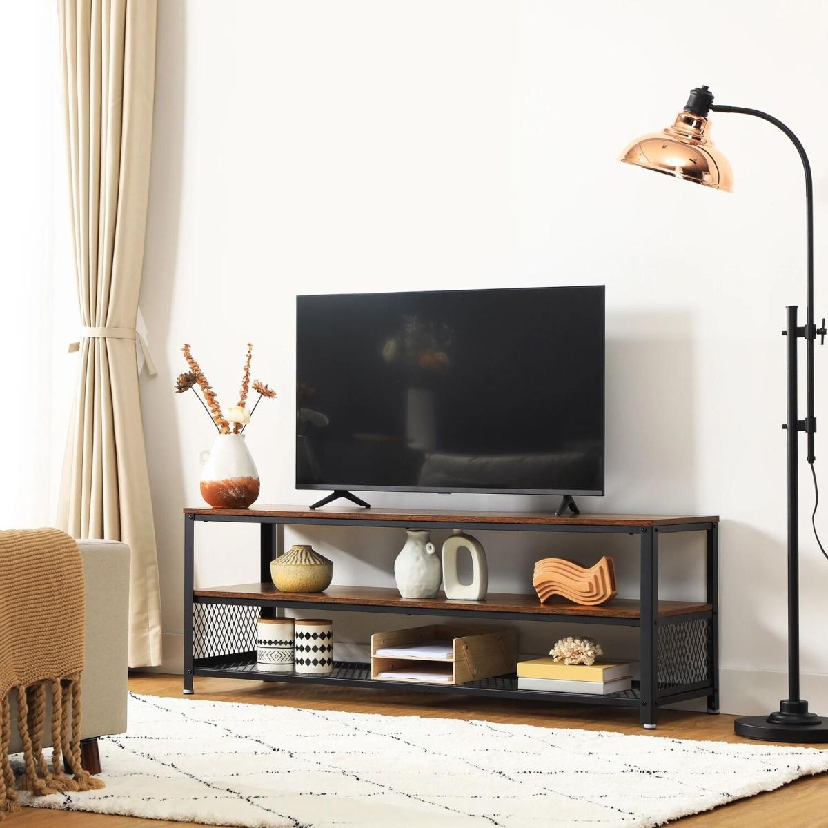 I’m a fan of this slimline industrial TV unit because its dark metal frame and warm brown shelf really ground a space without feeling bulky. It suits urban loft-style or modern farmhouse interiors, pairing especially well with exposed brick, neutral rugs and soft leather accents. For practical styling, keep the top clear around the screen - perhaps a single sculptural vase on one side - and use the open shelves to mix storage baskets with books or small plants. The mesh-backed lower tier is ideal for hiding games consoles or speakers while maintaining airflow, so it’s both a tidy and purposeful media stand.