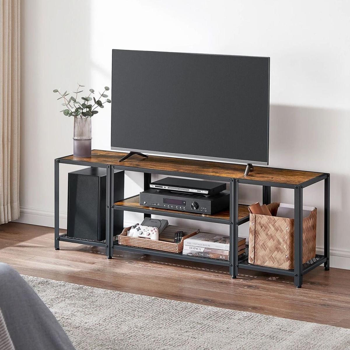 I’m a fan of this three-tier TV stand for its straightforward industrial-farmhouse look and open shelving, which makes it ideal for TVs up to 65 inches without feeling too bulky. The brown wood-effect shelves paired with a slim black steel frame sit neatly into modern industrial, Scandi-inspired or relaxed rustic schemes. To style it, cluster items in odd numbers: perhaps a low plant pot on one corner and a stack of coffee-table books on the other. Use woven baskets or lidded boxes on the lower shelves to conceal remotes, cables and games consoles. Keep the middle tier for AV equipment, leaving enough airflow around devices, and you’ll have a tidy, balanced media zone.