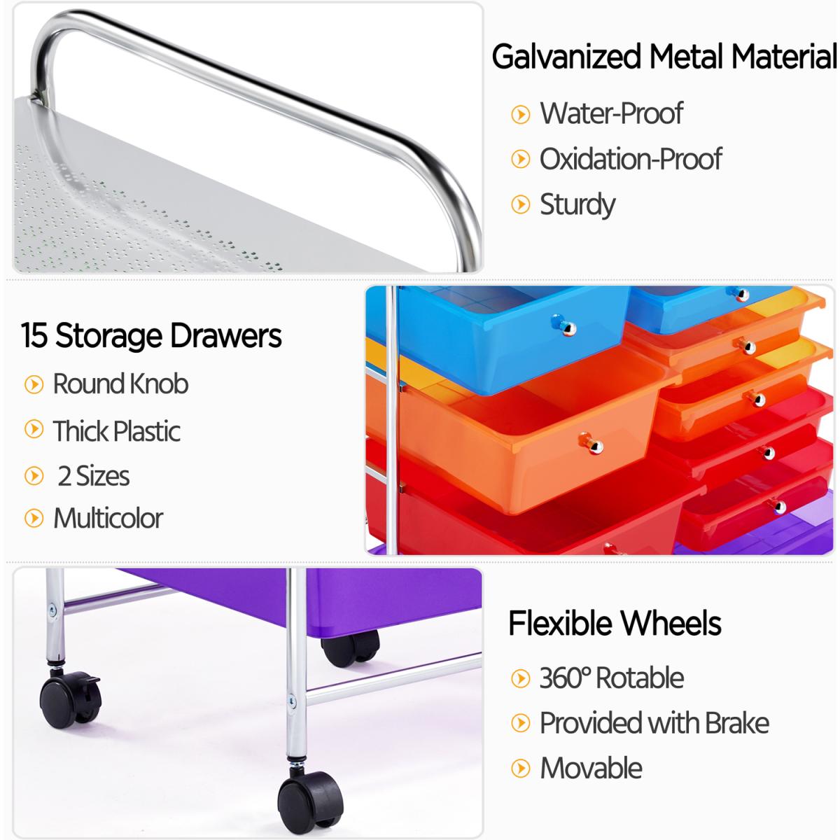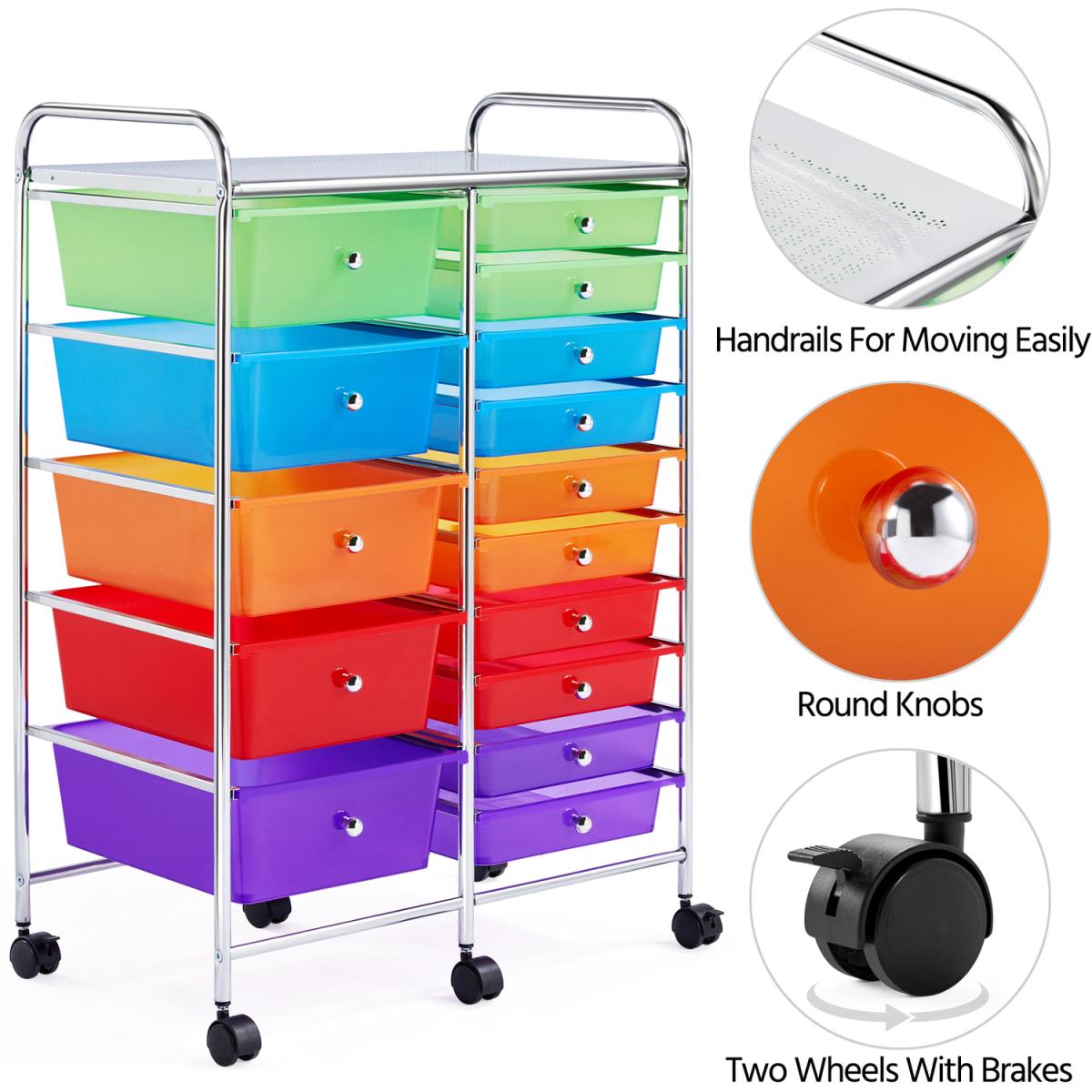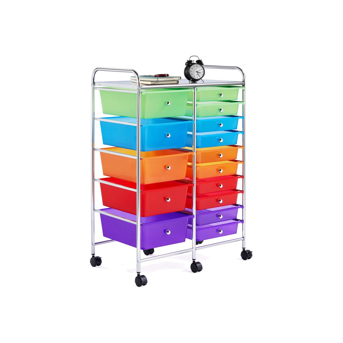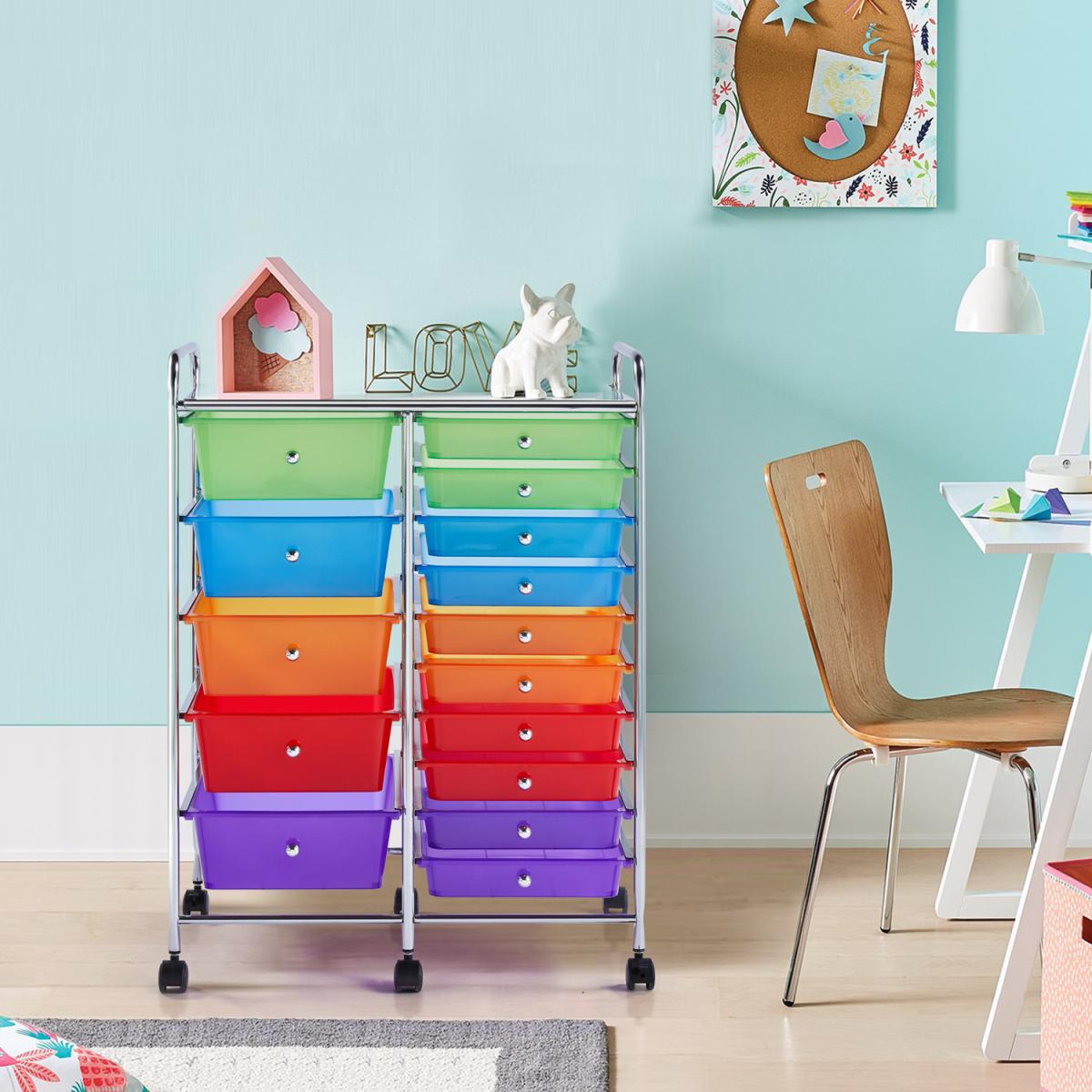 This 15-drawer storage trolley is arranged on 6 360-degree wheels, wherein, 2 of them are lockable, ensuring both flexibility and stability. The drawers are in two different sizes, 5 large ones and 10 small ones, fully meeting all your different needs. The smart design of these 15 vertically aligned drawers makes full use of limited space, allowing users to store different items separately. Besides, each of the drawers can be removed separately, therefore, you can use them independently as single storage boxes or install them back after organization.