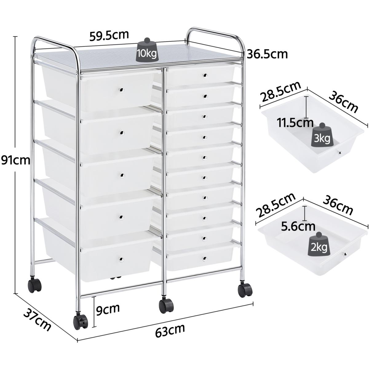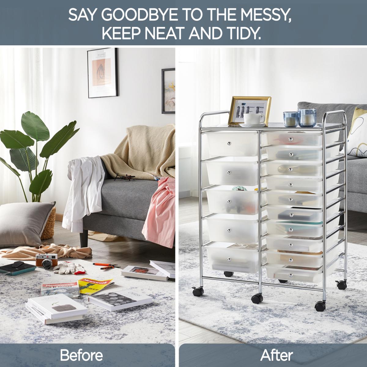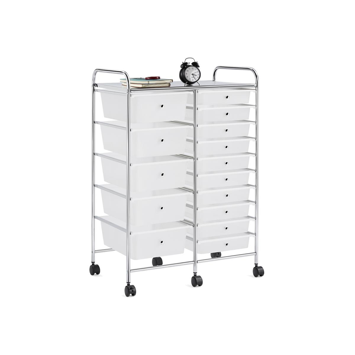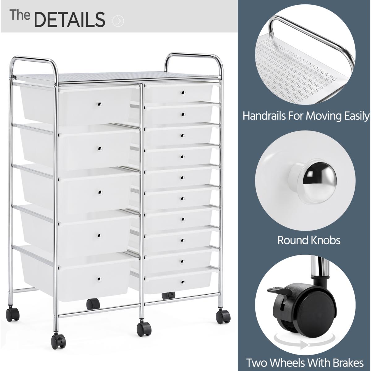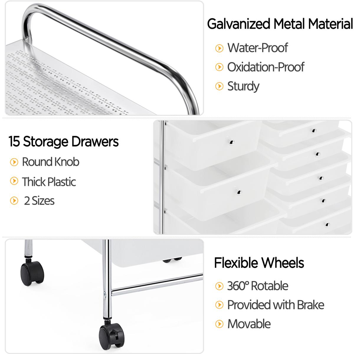 This 15-drawer storage trolley is arranged on 6 360-degree wheels, wherein, 2 of them are lockable, ensuring both flexibility and stability. The drawers are in two different sizes, 5 large ones and 10 small ones, fully meeting all your different needs. The smart design of these 15 vertically aligned drawers makes full use of limited space, allowing users to store different items separately. Besides, each of the drawers can be removed separately, therefore, you can use them independently as single storage boxes or install them back after organization.