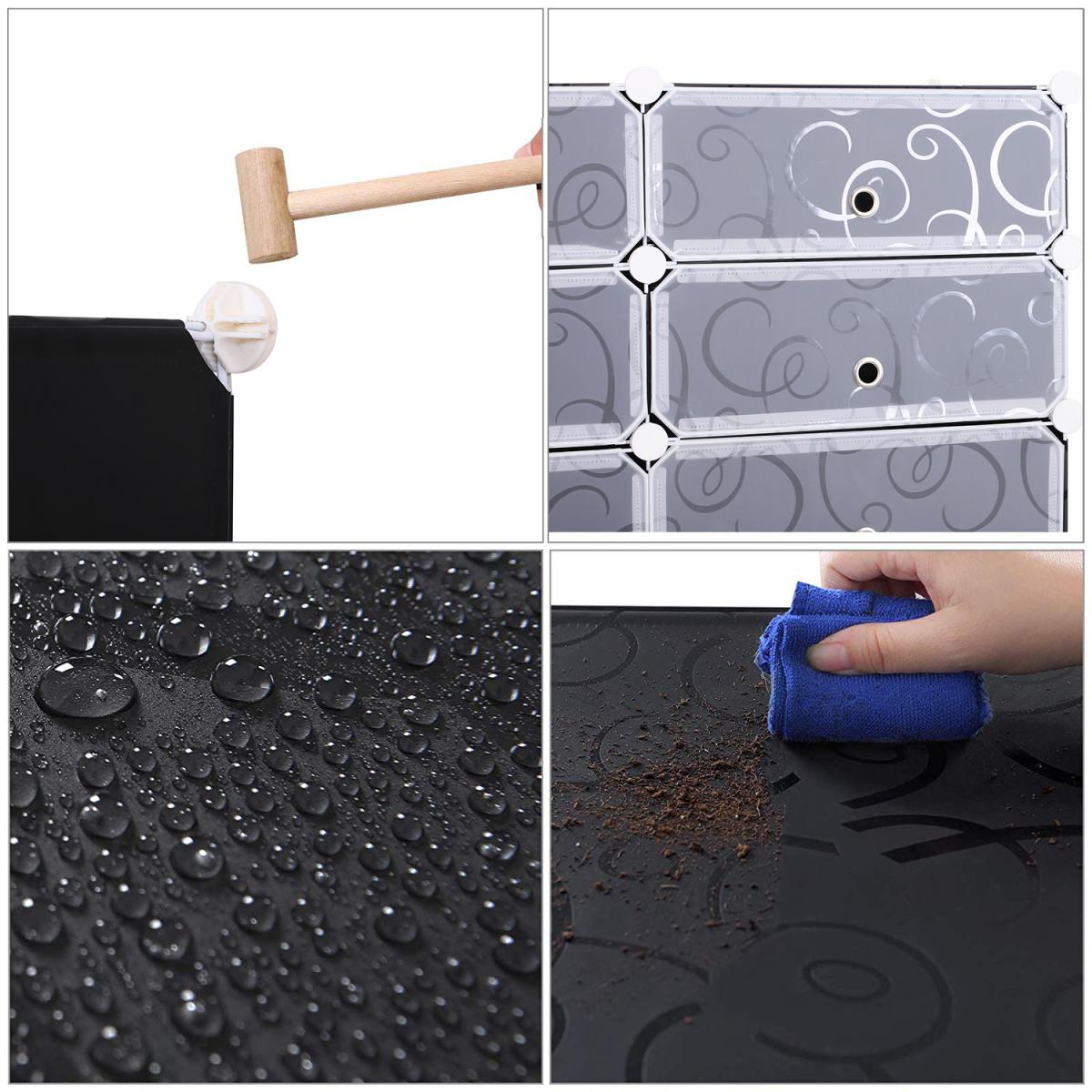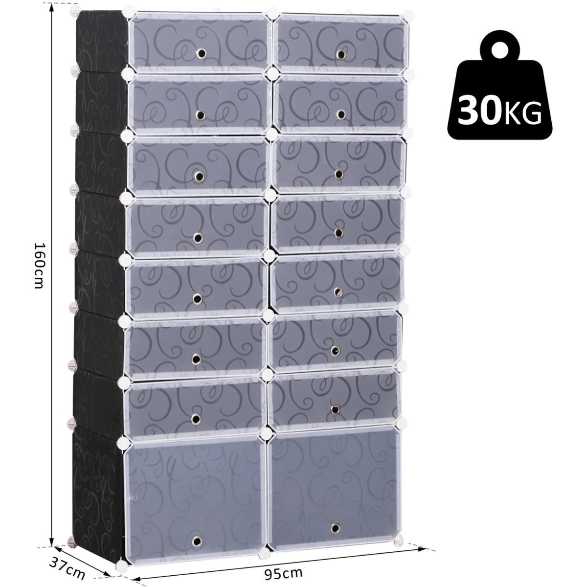 Declutter your home efficiently with this semi-transparent shoe cabinet from HOMCOM. Made from environmentally friendly plastic with a metal frame, the unit is tough and durable for reliable everyday use. Featuring 14 regular cube compartments and two larger to fit a total of 32 pairs, the shape is completely customisable to allow it to fit into tight and awkwardly shaped spaces. Simply connect using the ABS connectors. It is finished with a swirl pattern design on the front for an elegant look, no matter where it is placed. You'll love tidying up your home with this fantastic piece.