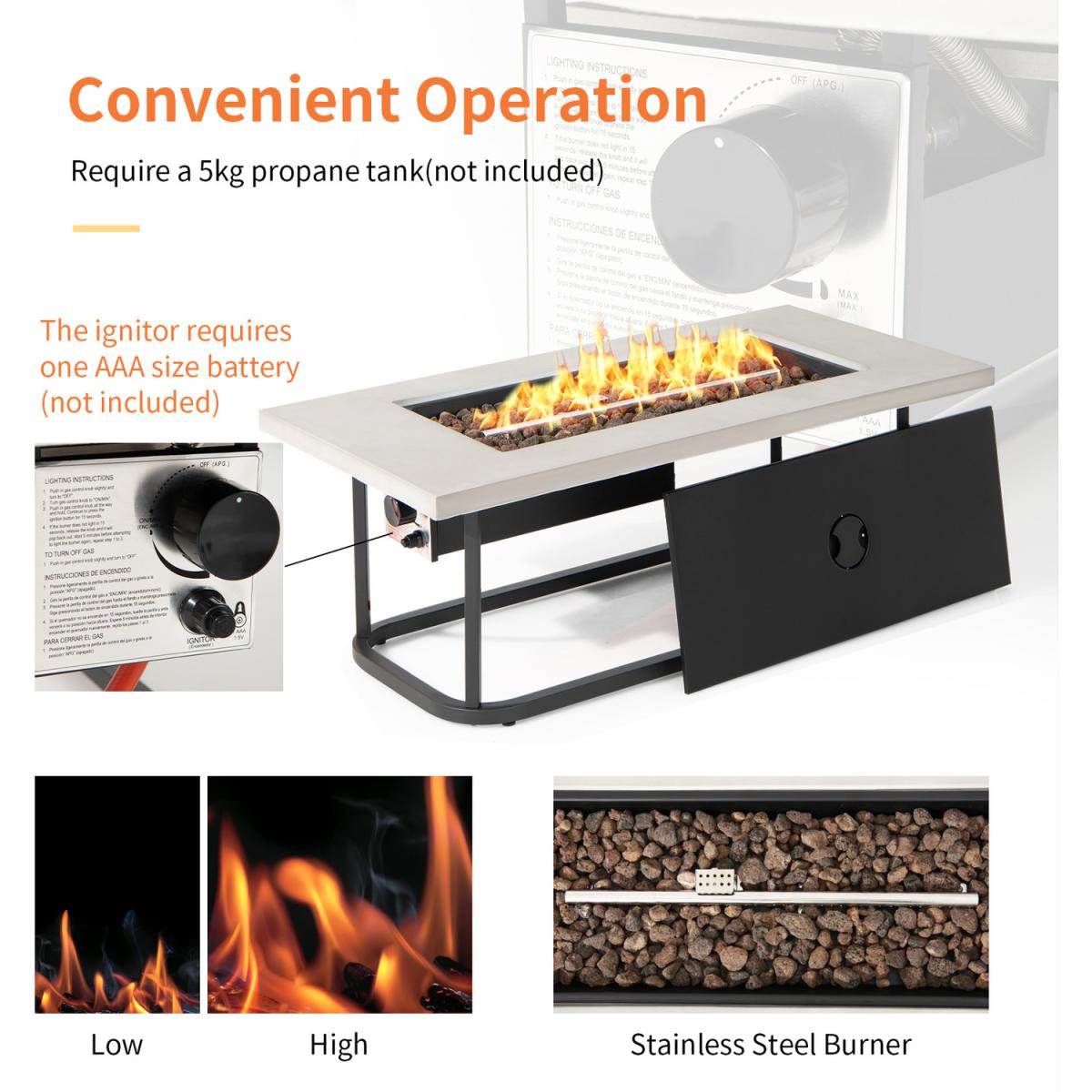 Make your outdoor life warmer and cozier with this powerful gas fire pit table!When the night comes, you can gather around the fire pit table with your friends and enjoy the beautiful night view while chatting. And it can be used as an ordinary outdoor dining table by covering the lid. Once you connect it with a 5 kg propane tank (not included) and light the 16 KW fire pit table, you will get a steady and efficient heating experience. What's more, the high-temp resistant tabletop and rustproof steel frame ensure durability and safety during use. Simple assembly required.