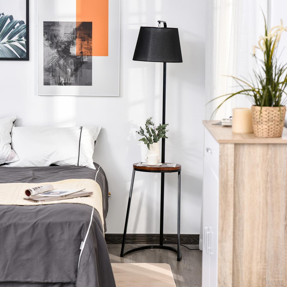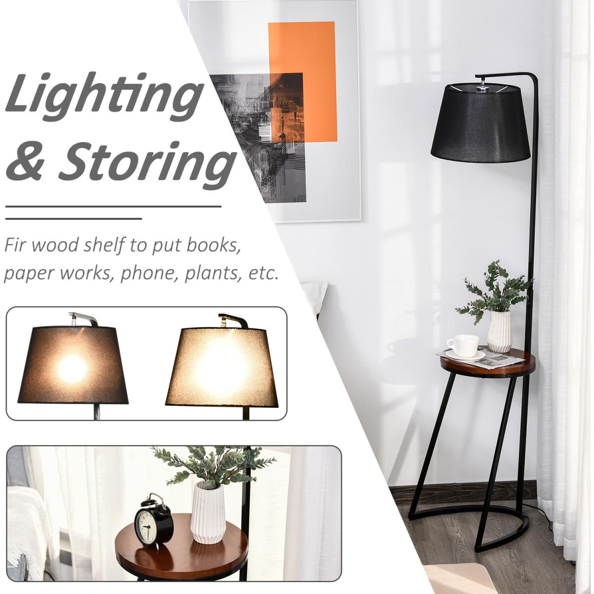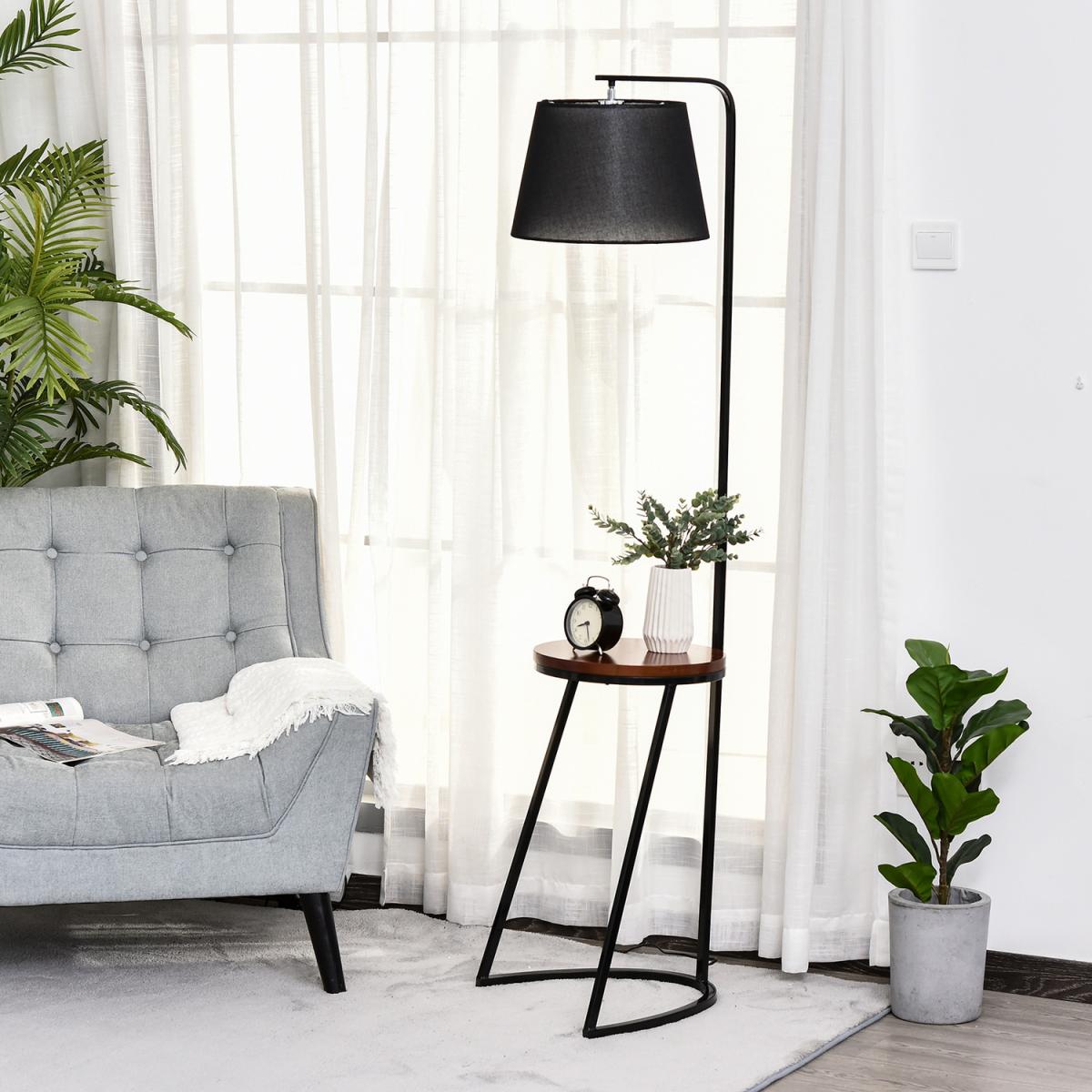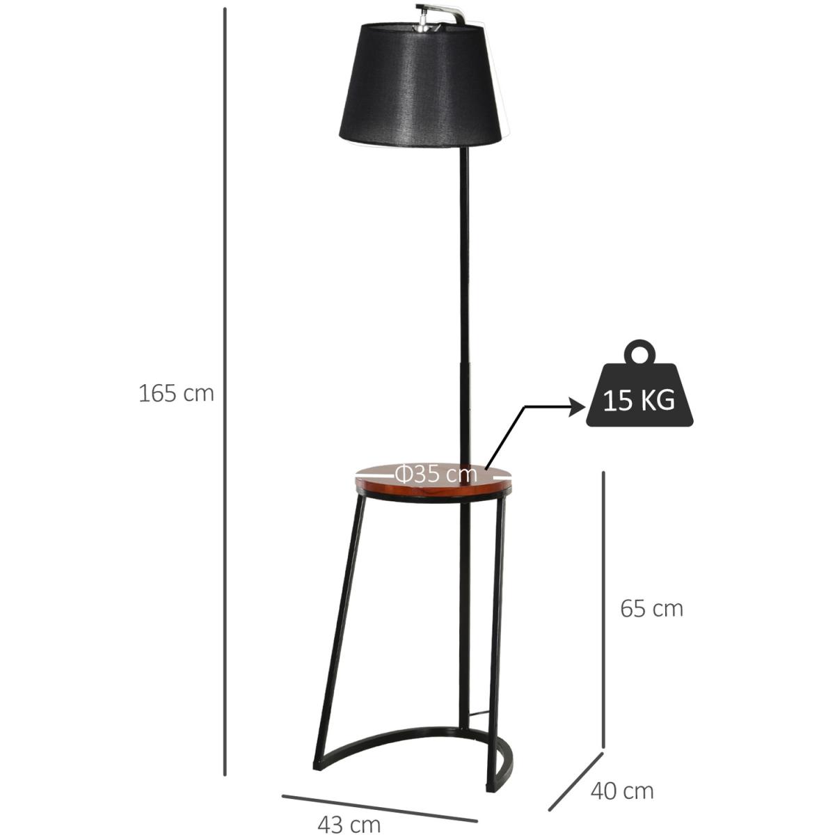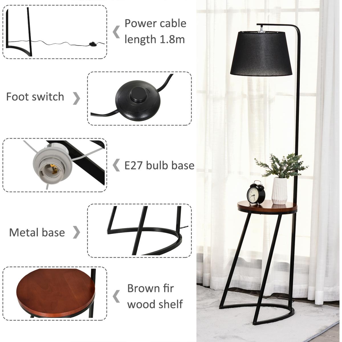 Bring unique design into home settings with this floor lamp HOMCOM. A steel frame for a durable and upright structure, its duo design features a middle table and a top lamp. Made from fir wood, the table provides a convenient place to keep things on, in a beautiful chestnut brown finish. Fitted with an E27 bulb base, the lamp will light up your home or office beautifully, with the black shade ensuring a sleek look. Putting a new spin on tradition.