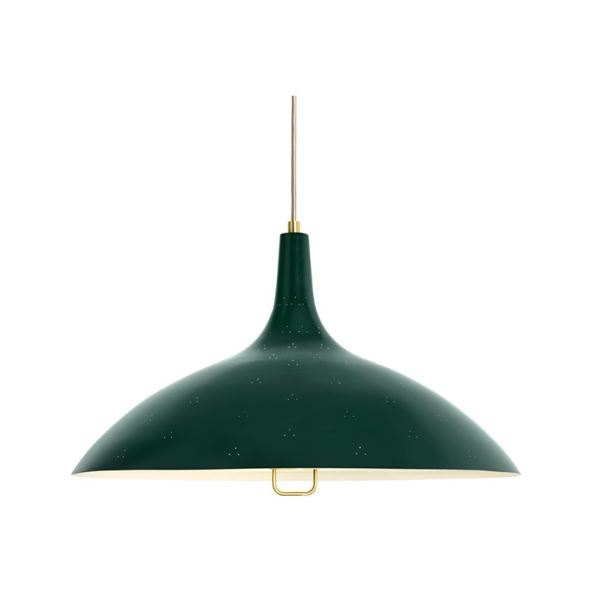 An iconic design conceptualised in 1948 by Finnish designer Paavo Tynell, the green 1965 Pendant Light is expertly crafted by Gubi. Originally designed for New York's Finland House to showcase Finnish design, the statement pendant lampshade is characterised by its perforated triangular pattern that helps to cast a soft, diffused glow across the room. Boasting elegant brass accents, the 1965 Pendant Light features a brass-coloured cord, dark green painted aluminium shade and a matte glass diffuser to gently illuminate without glare. Renowned for his influence on modern lighting design, Paavo Tynell originally trained as a blacksmith before founding his own metalwork and lighting studio in 1918. With a simplified aesthetic, his pieces echo influences from mid-century modernism, showcasing counterweighted suspension mechanisms and beautiful complementary materials in appealing forms. Requires: 1 x Max 46W E27 bulb (not included)