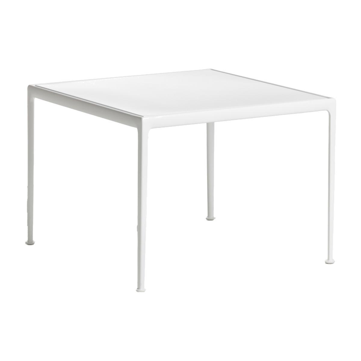 Specially designed by Richard Schultz to withstand the corrosive salt air at Florence Knoll's home in Florida, the white 1966 Outdoor End Table is produced to this day by esteemed manufacturer Knoll. Since its inception, the 1966 Collection has earned a special place in the world of outdoor furniture and is considered a classic design for the garden. Today the table has been re-engineered to incorporate the best modern materials and features a white porcelain enamel table top supported by a welded aluminium frame with a weather-resistant polyester powder-coated finish. A worldwide success as soon as it was released by Knoll in 1966, the 1966 Outdoor End Table was immediately made part of the MoMA Design Collection and has won several coveted accolades such as the 1969 Stuttgart Design Centre Award.