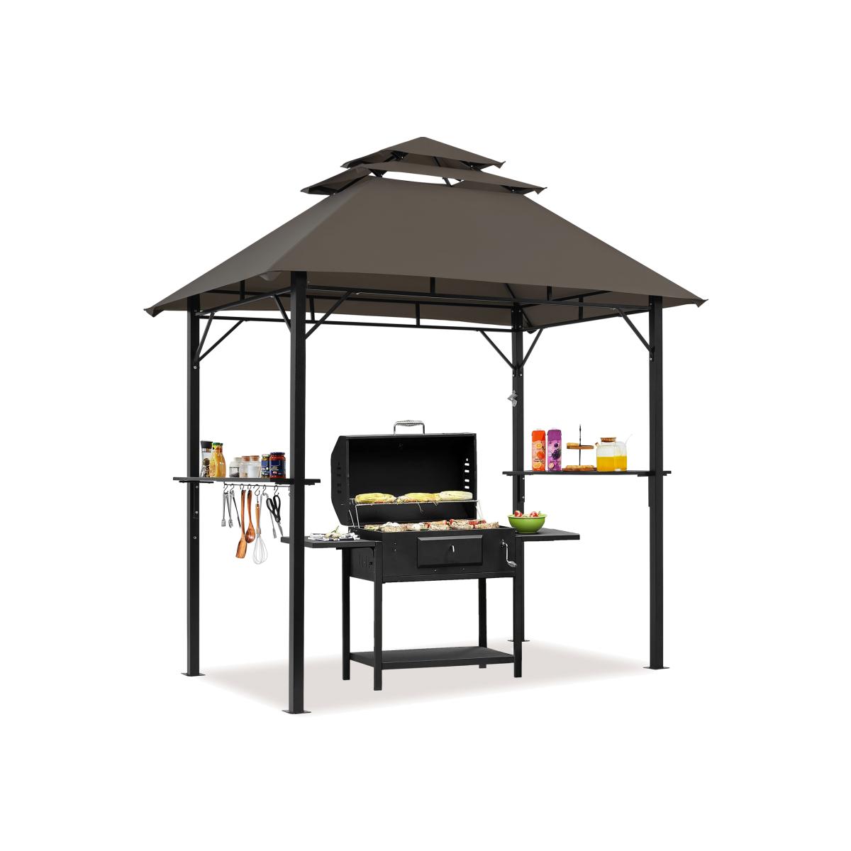 No more sweltering BBQ parties under the blazing sun. Our 2.41.5 M Grill Gazebo is designed to elevate your backyard gatherings to a new level. Crafted with sturdy polyester fabric coated in a water- and tear-resistant PA finish, this BBQ gazebo tent is supported by a galvanized metal frame to withstand the elements. Aiming to elevate your outdoor cooking experience, this patio gazebo comes packed with thoughtful features, from two adjustable mesh shelves and 10 S-shaped hooks for extra hanging space to a top hook for lights or plants, and even a built-in bottle opener on the frame. With two sets of fittings included, this versatile outdoor gazebo ensures stability on both soft and hard surfaces. The 3-tiered vented top helps optimize heat dissipation while grilling, improve airflow, and enhance overall wind resistance.
