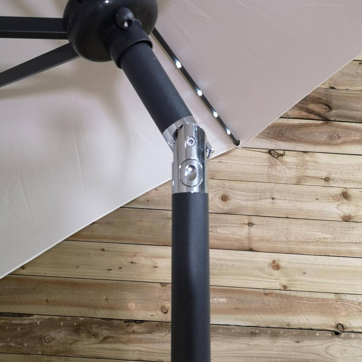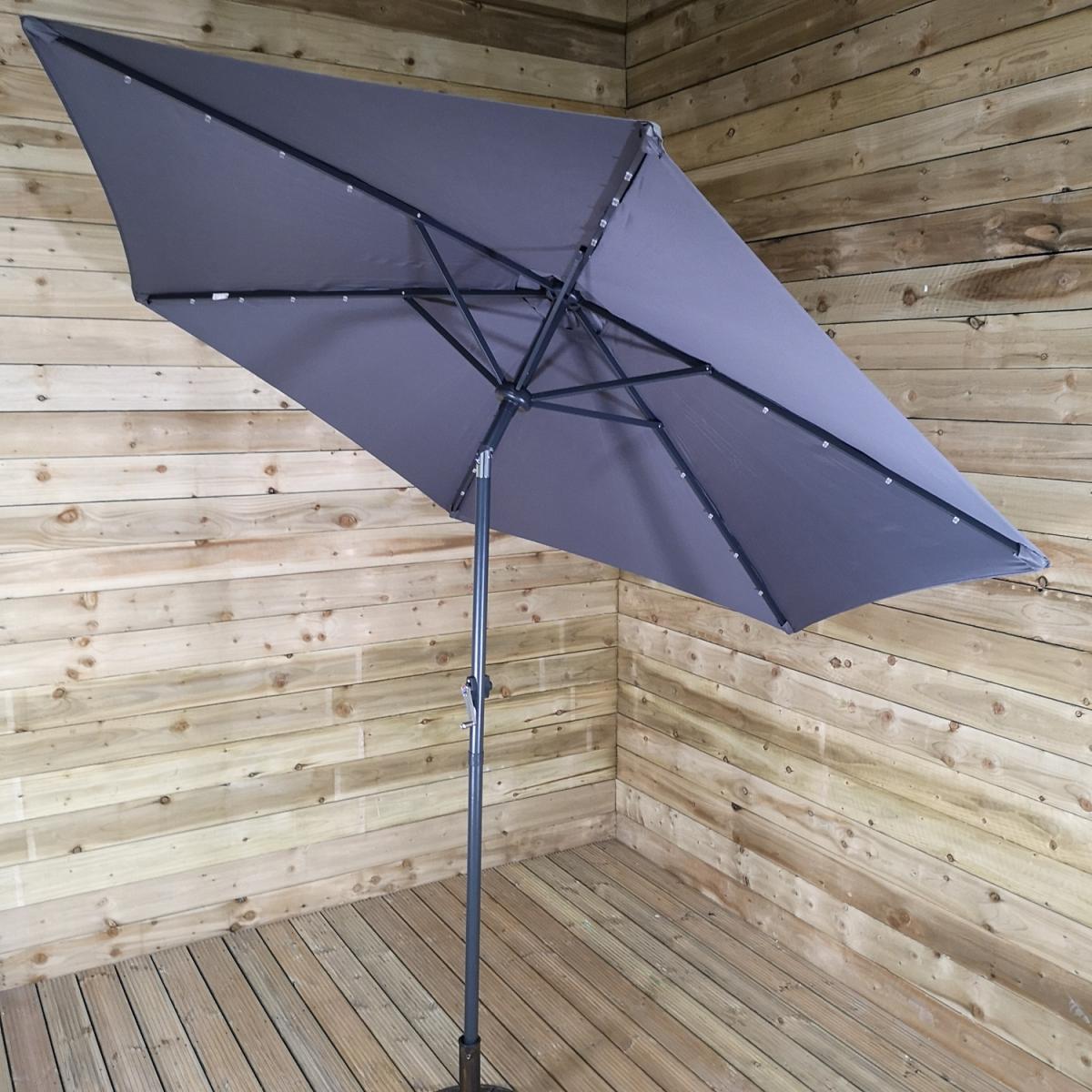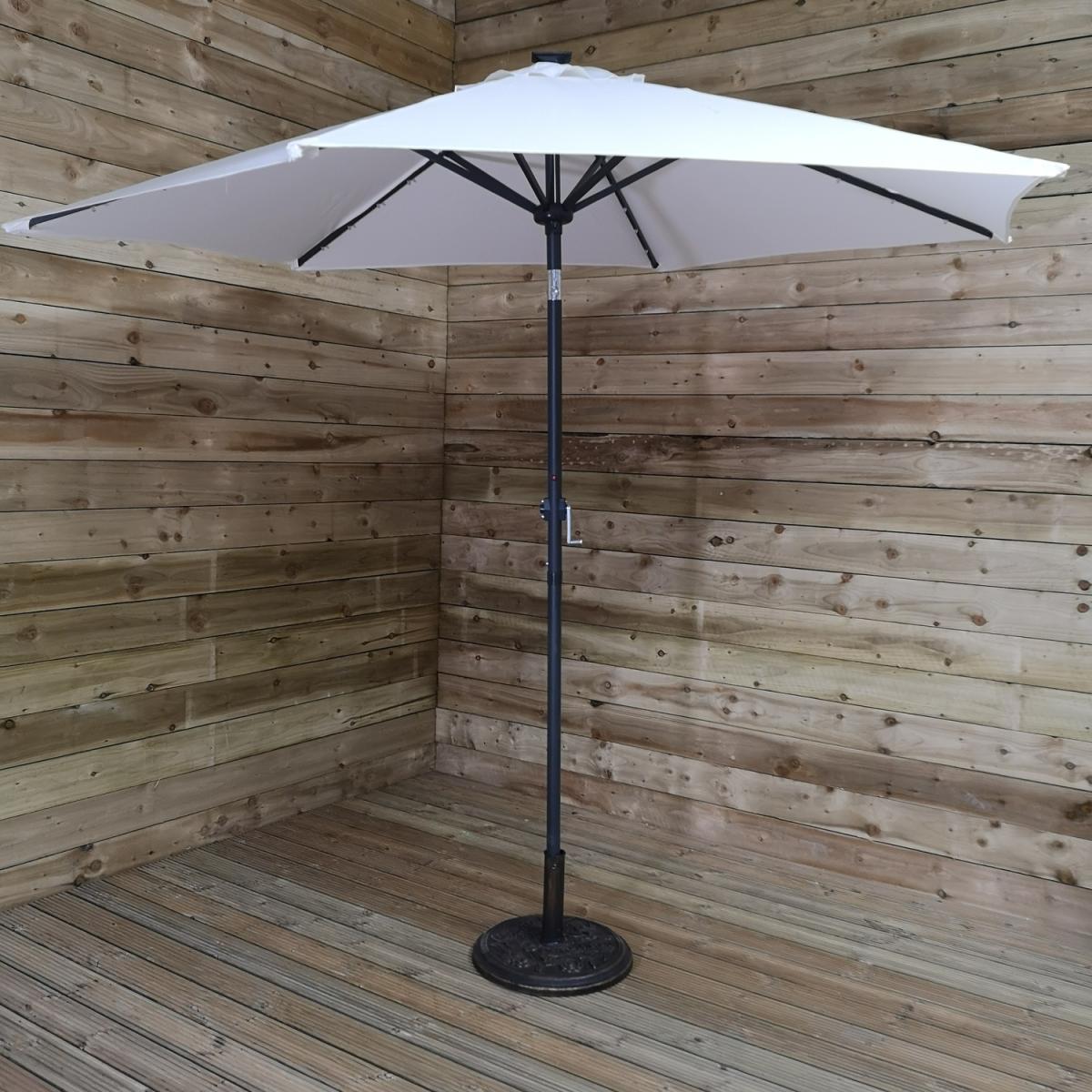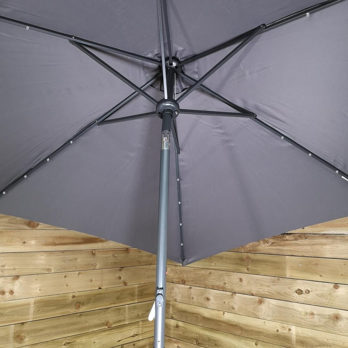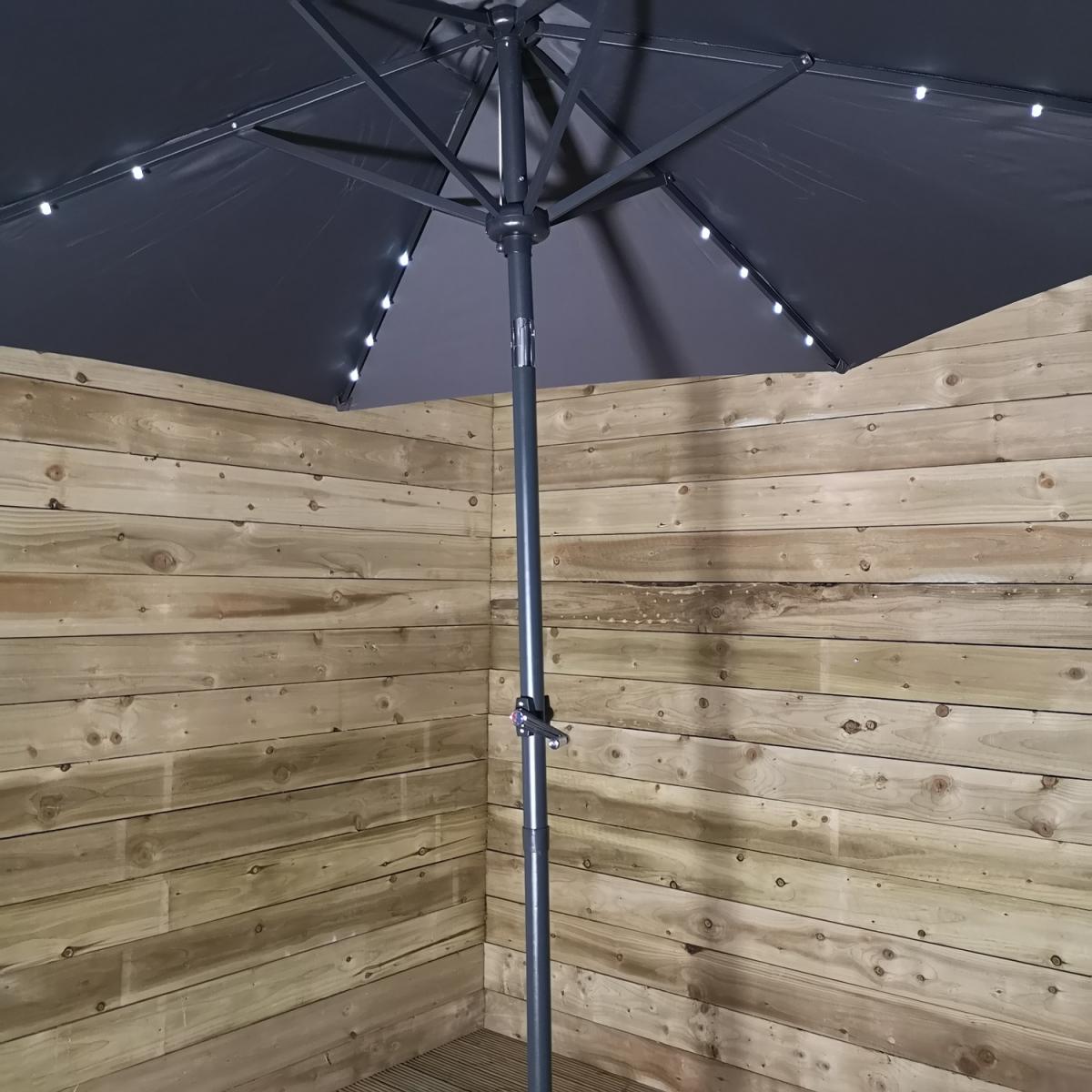 This light-up SPF30 parasol is perfect to create some shade and protect you from the sun's harmful UV rays, whilst doubling up as a source of lighting once the sun has set. Simply attach the solar unit to the top of the canopy, and connect the two poles, ensuring that the locking clips are secured. Wind the crank handle to raise and lower the steel ribs, tilt mechanism can be activated by the press on a button and turning on the lights at the flick of a switch. The replaceable battery takes approximately 8-12 hours to charge in normal daylight, the lamp illuminates for around 6 hours. Simply wipe clean with a damp sponge or cloth and allow to dry. We would recommend using the parasol with a sturdy base, (sold separately), and must be safely stored when not in use.