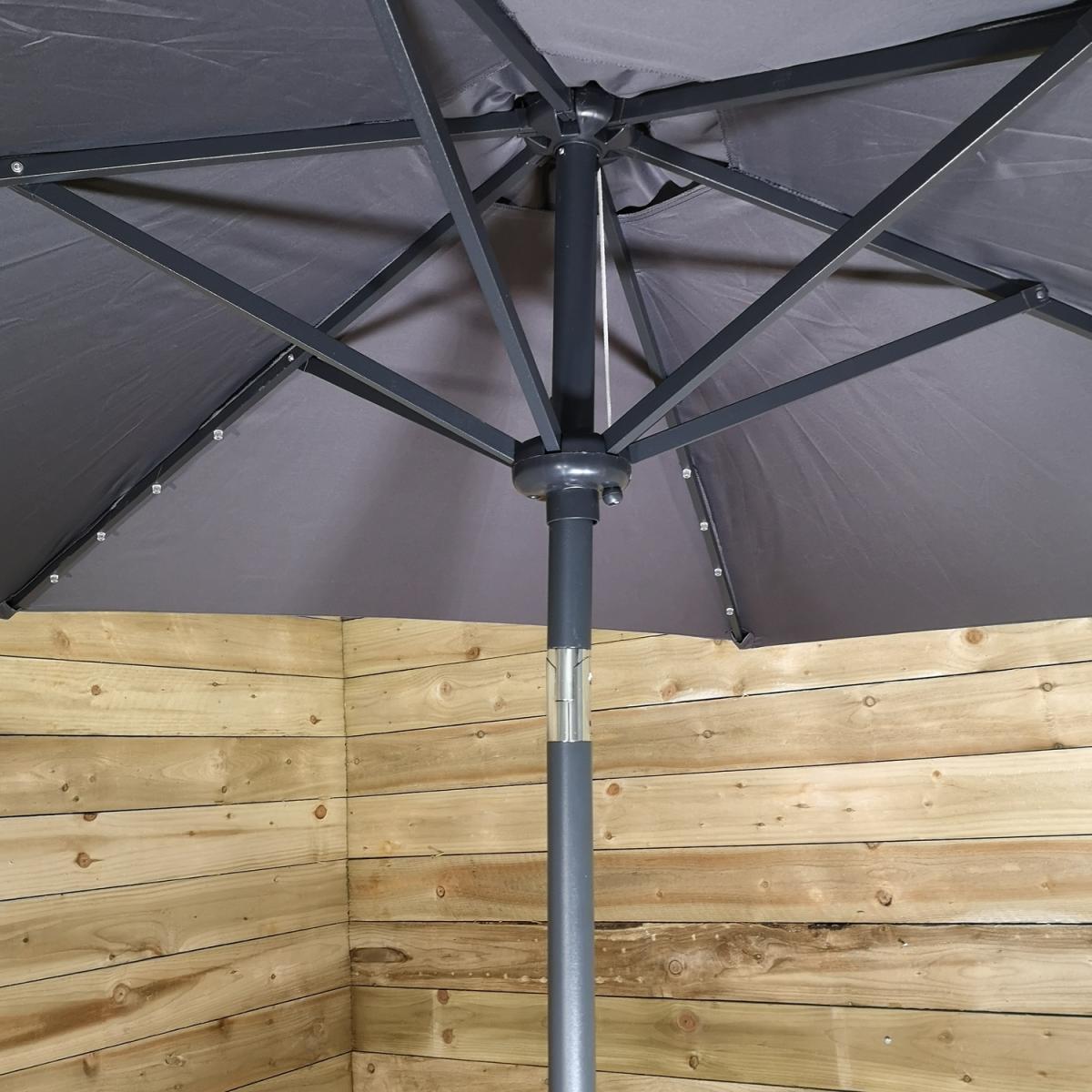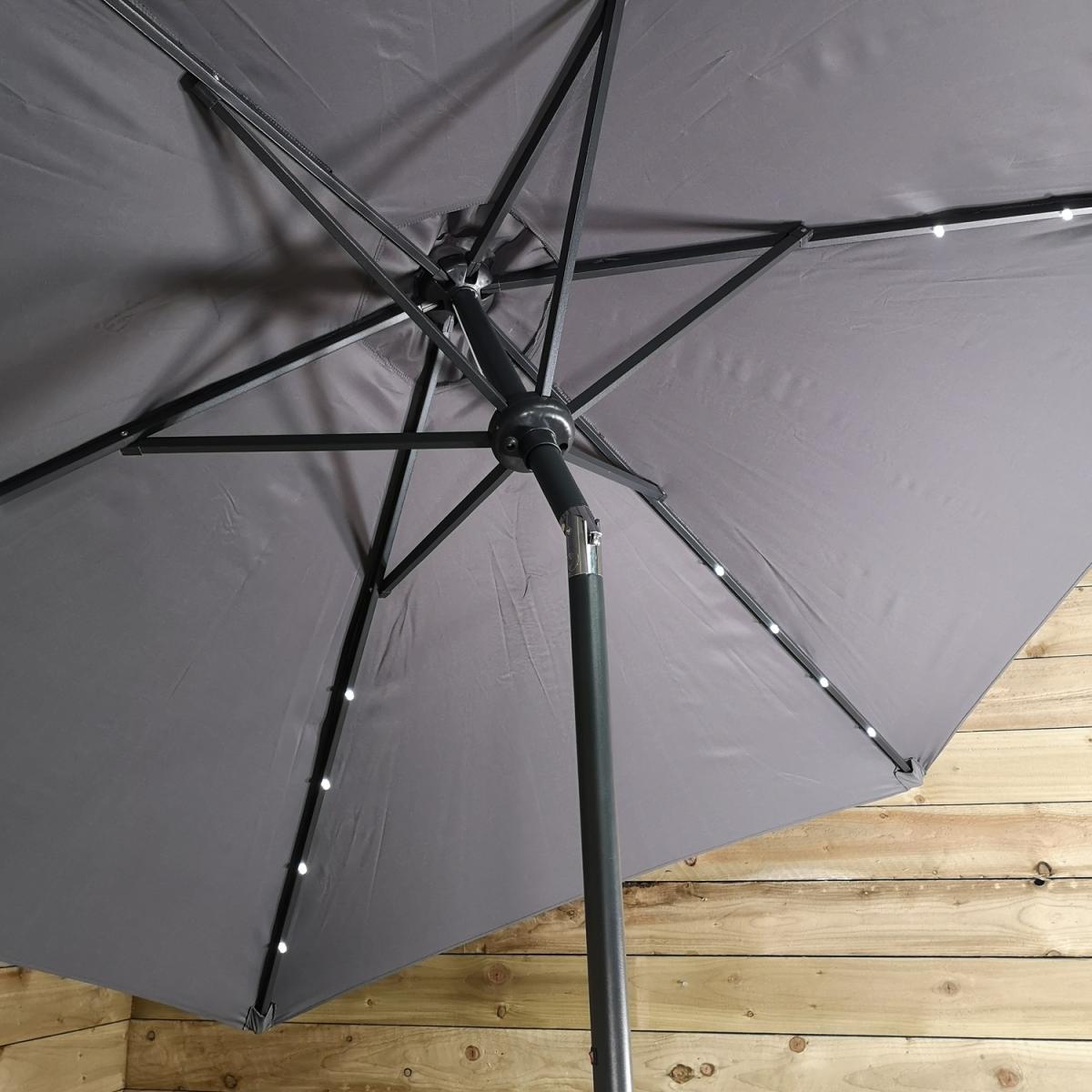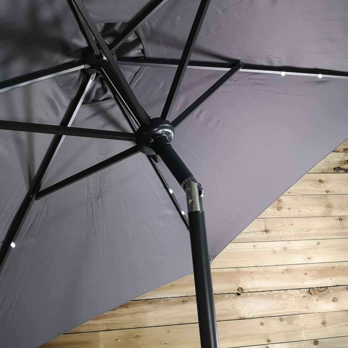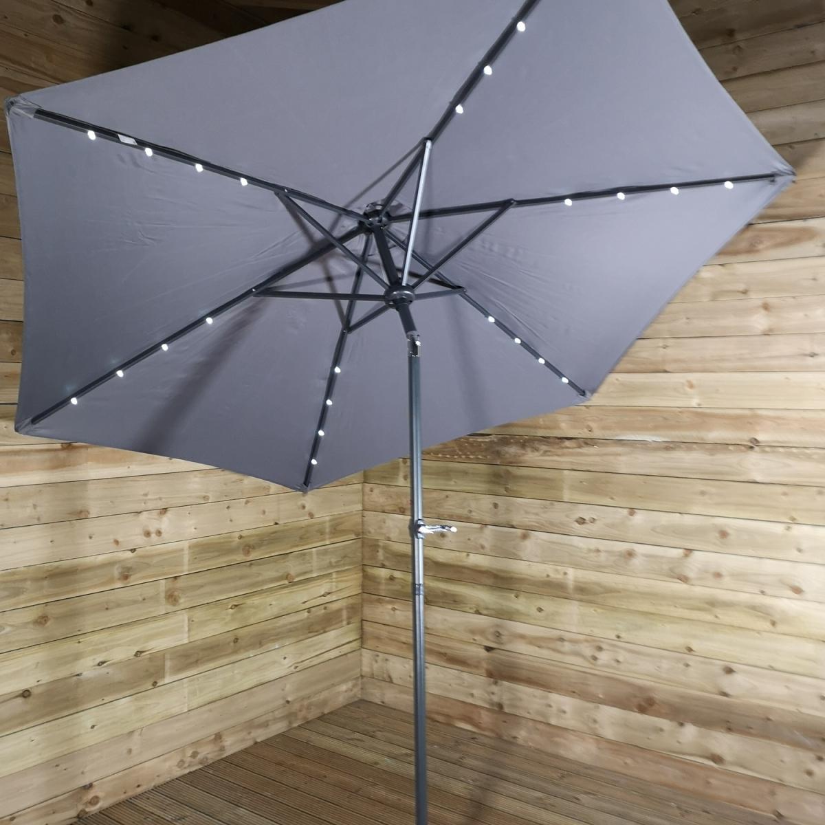 This light-up SPF30 parasol is perfect to create some shade and protect you from the sun's harmful UV rays, whilst doubling up as a source of lighting once the sun has set. Simply attach the solar unit to the top of the canopy, and connect the two poles, ensuring that the locking clips are secured. Wind the crank handle to raise and lower the steel ribs, tilt mechanism can be activated by the press on a button and turning on the lights at the flick of a switch. The replaceable battery takes approximately 8-12 hours to charge in normal daylight, the lamp illuminates for around 6 hours. Simply wipe clean with a damp sponge or cloth and allow to dry. We would recommend using the parasol with a sturdy base, (sold separately), and must be safely stored when not in use.
