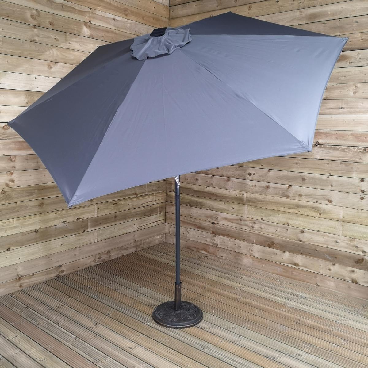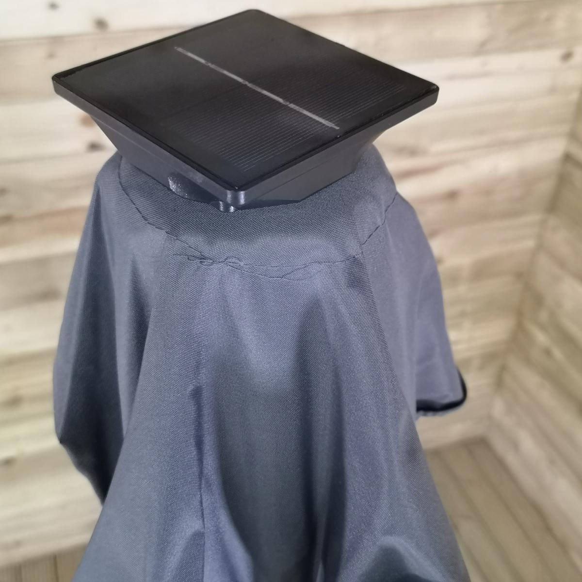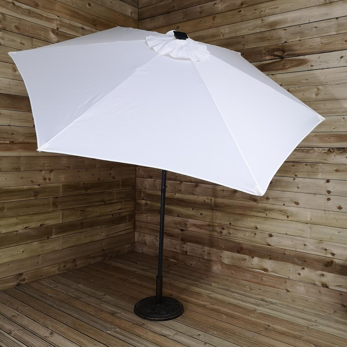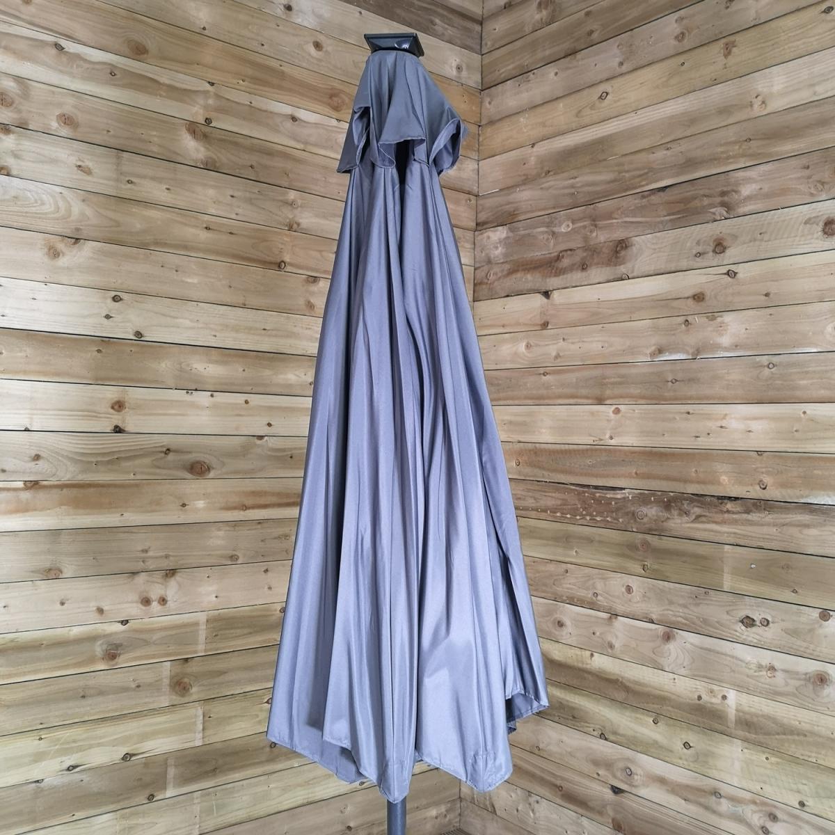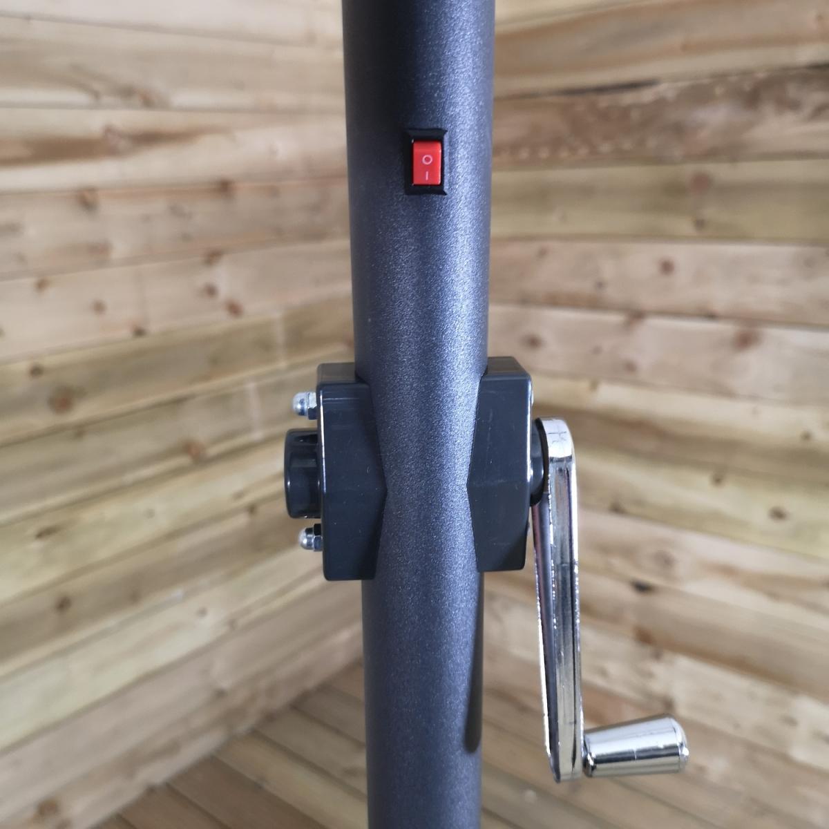 This light-up SPF30 parasol is perfect to create some shade and protect you from the sun's harmful UV rays, whilst doubling up as a source of lighting once the sun has set. Simply attach the solar unit to the top of the canopy, and connect the two poles, ensuring that the locking clips are secured. Wind the crank handle to raise and lower the steel ribs, tilt mechanism can be activated by the press on a button and turning on the lights at the flick of a switch. The replaceable battery takes approximately 8-12 hours to charge in normal daylight, the lamp illuminates for around 6 hours. Simply wipe clean with a damp sponge or cloth and allow to dry. We would recommend using the parasol with a sturdy base, (sold separately), and must be safely stored when not in use.